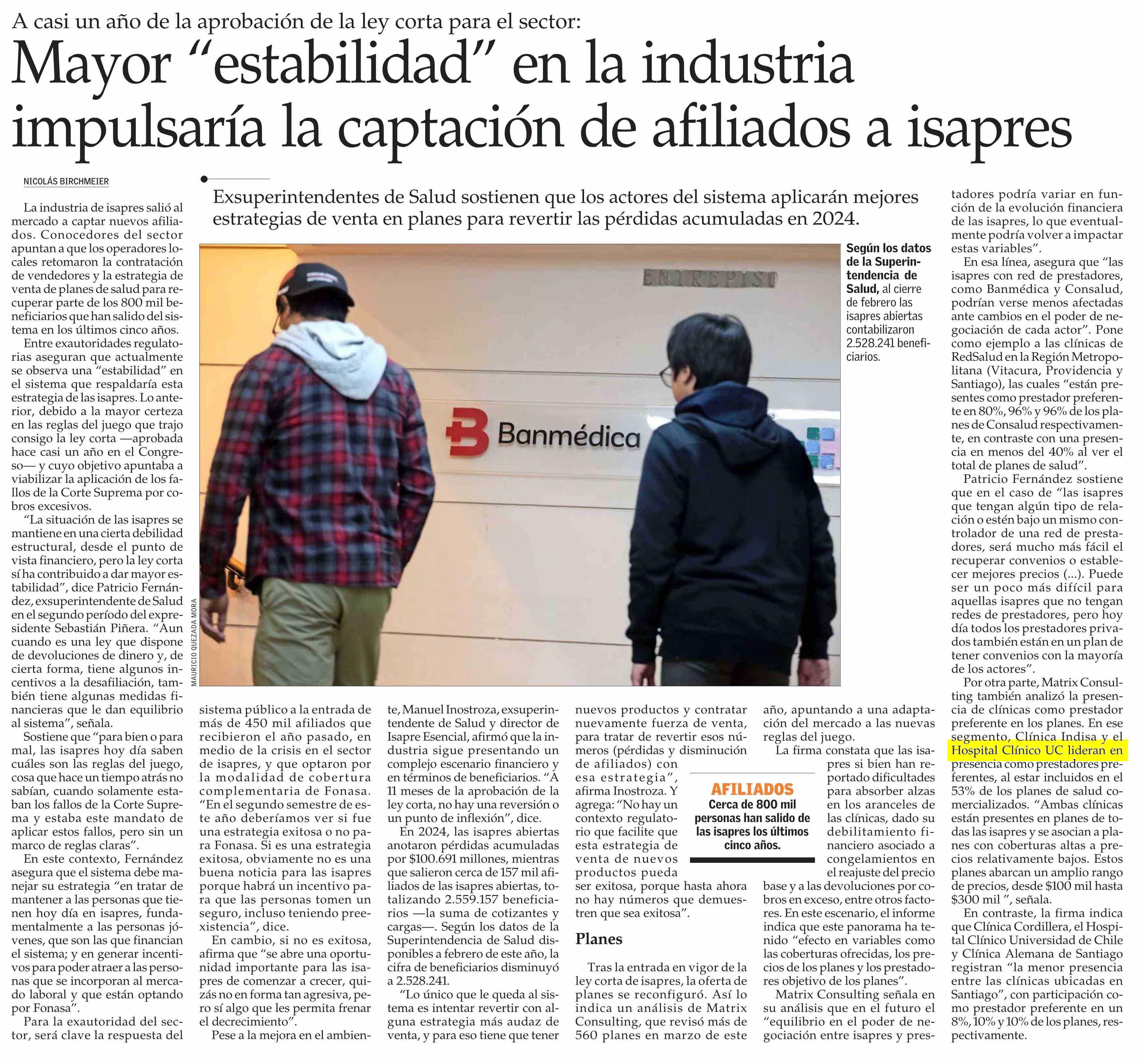 Mayor “estabilidad” en la industria impulsaría la captación de afiliados a isapres 05-05-2025 El Mercurio |