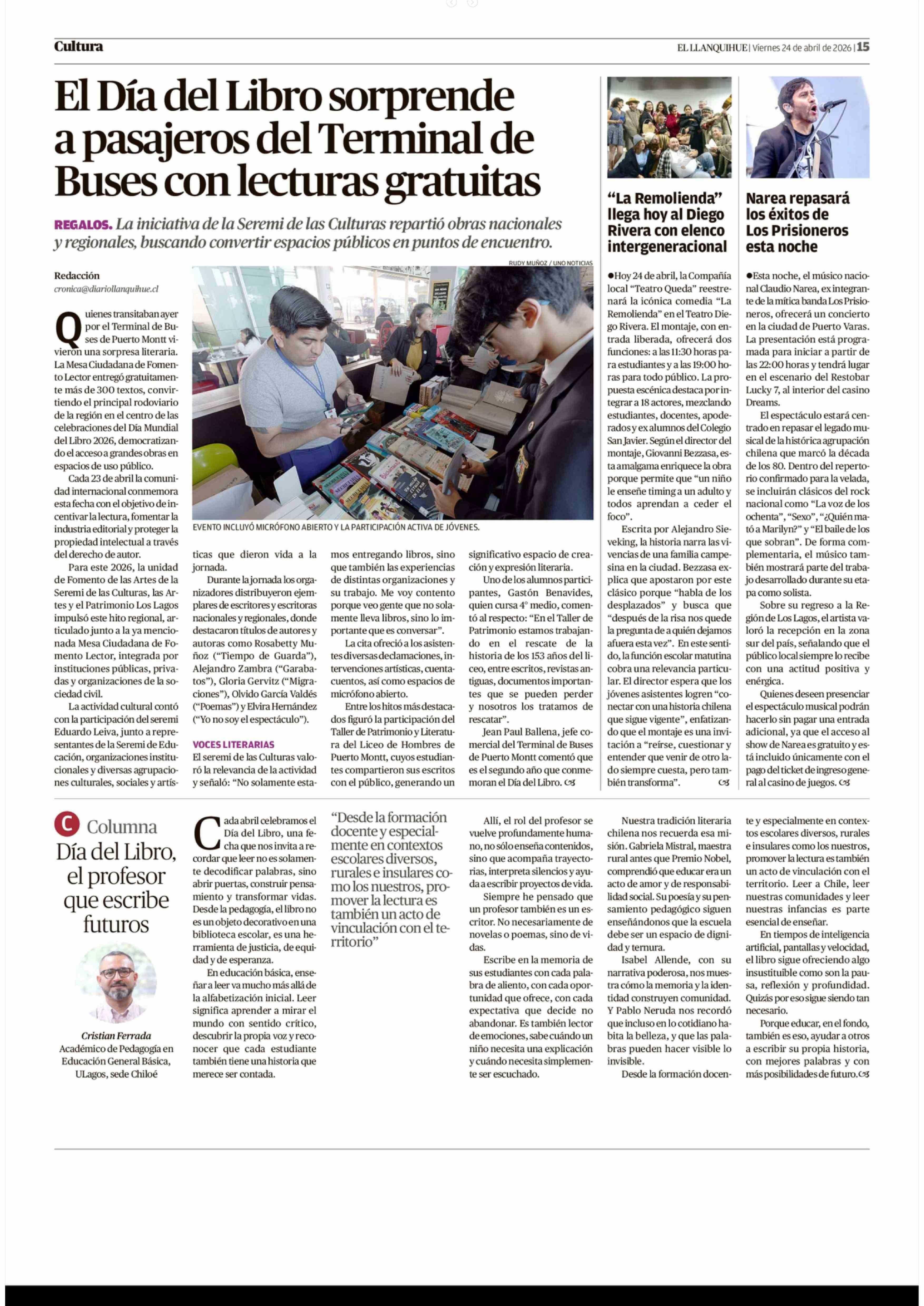 Columnas de Opinión: Día del Libro, el profesor que escribe futuros 24-04-2026 El Llanquihue |