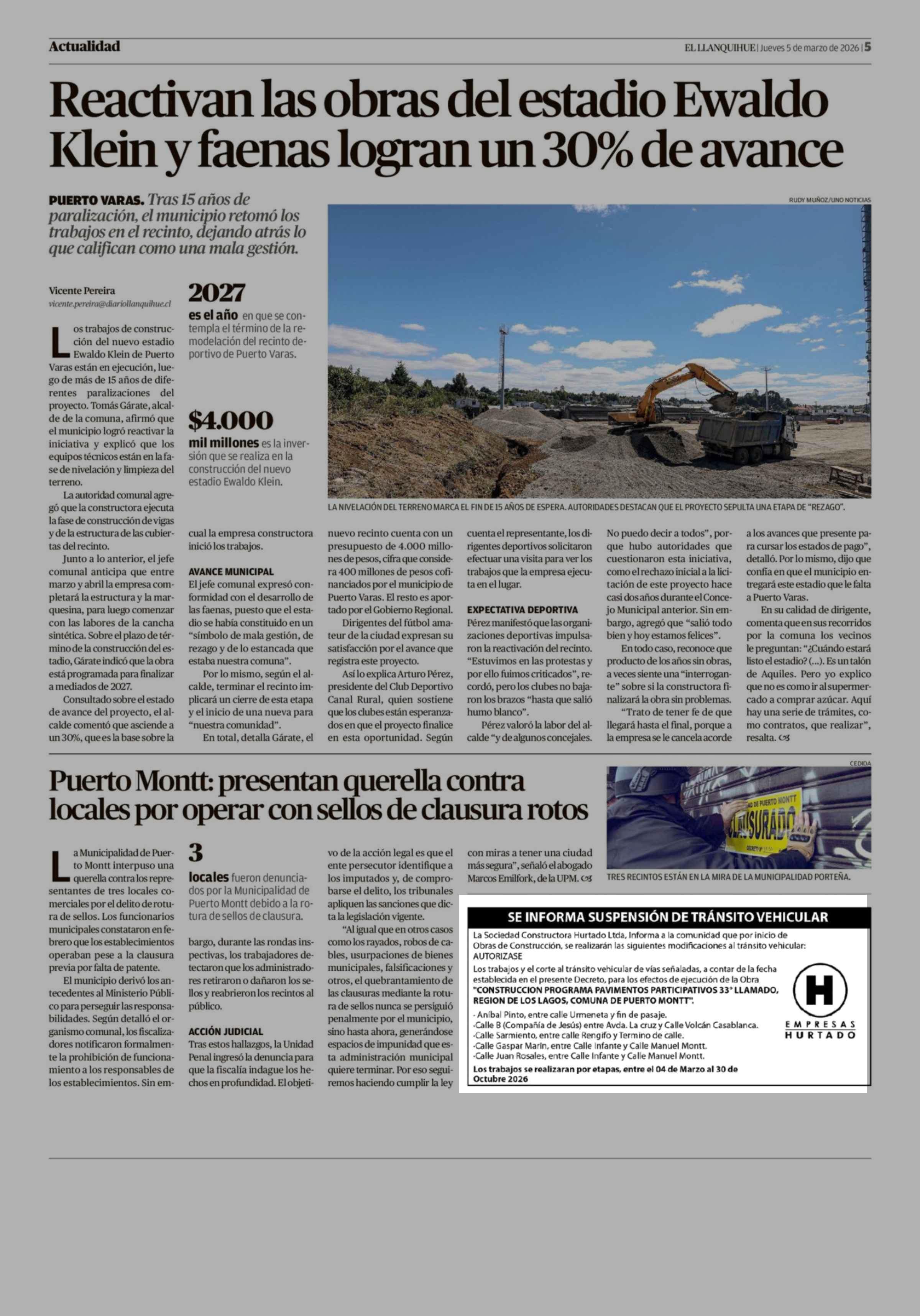 | Título: | Extractos: SE INFORMA SUSPENSIÓN DE TRÁNSITO VEHICULAR La Sociedad Constructora Hurtado Ltda, Informa a la comunidad que por inicio de Obras de Construcción, se realizarán las siguientes modificaciones al tránsito vehicular: AUTORIZASE Los trabajos y el corte al tránsito vehicular de vías señaladas, |