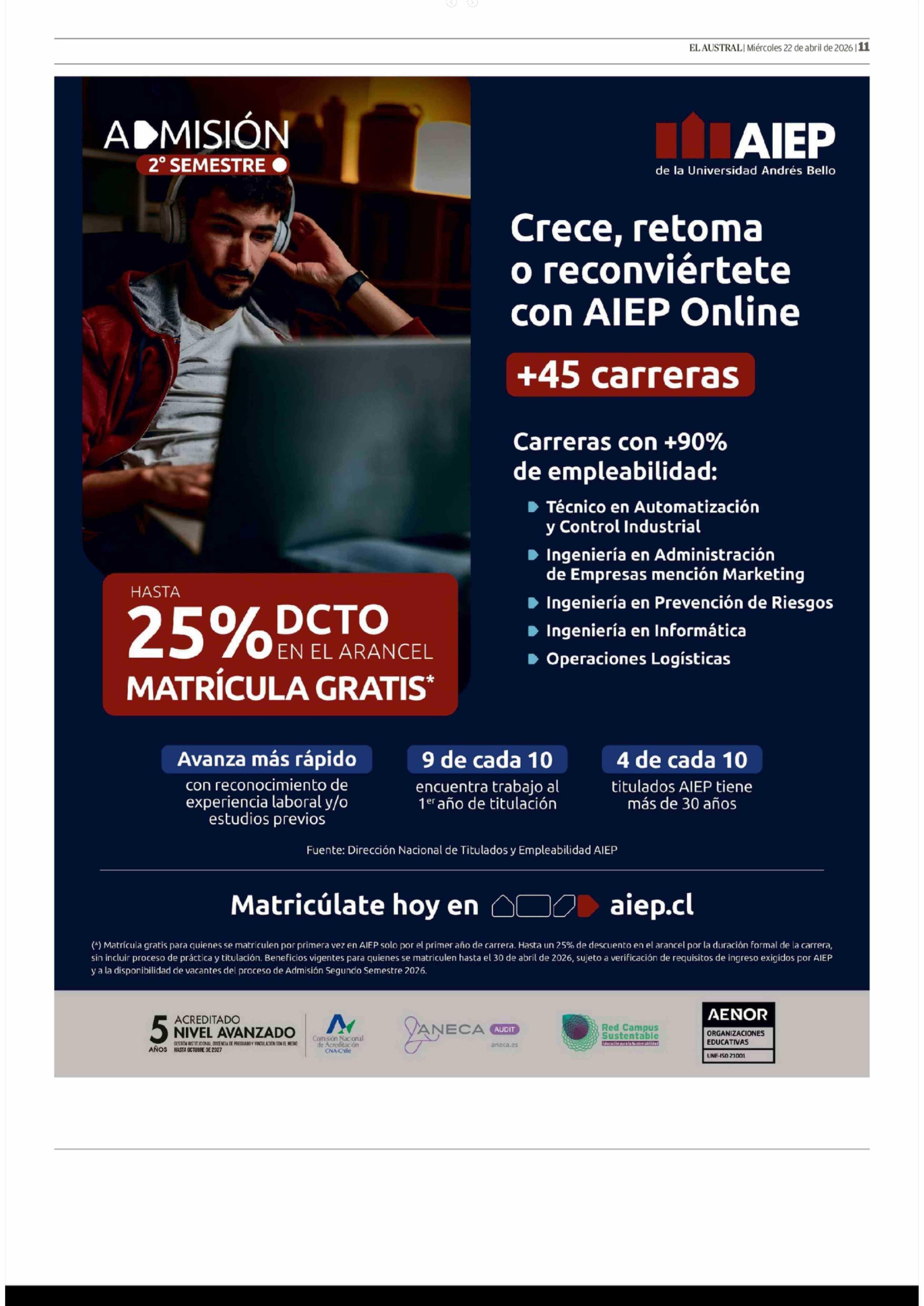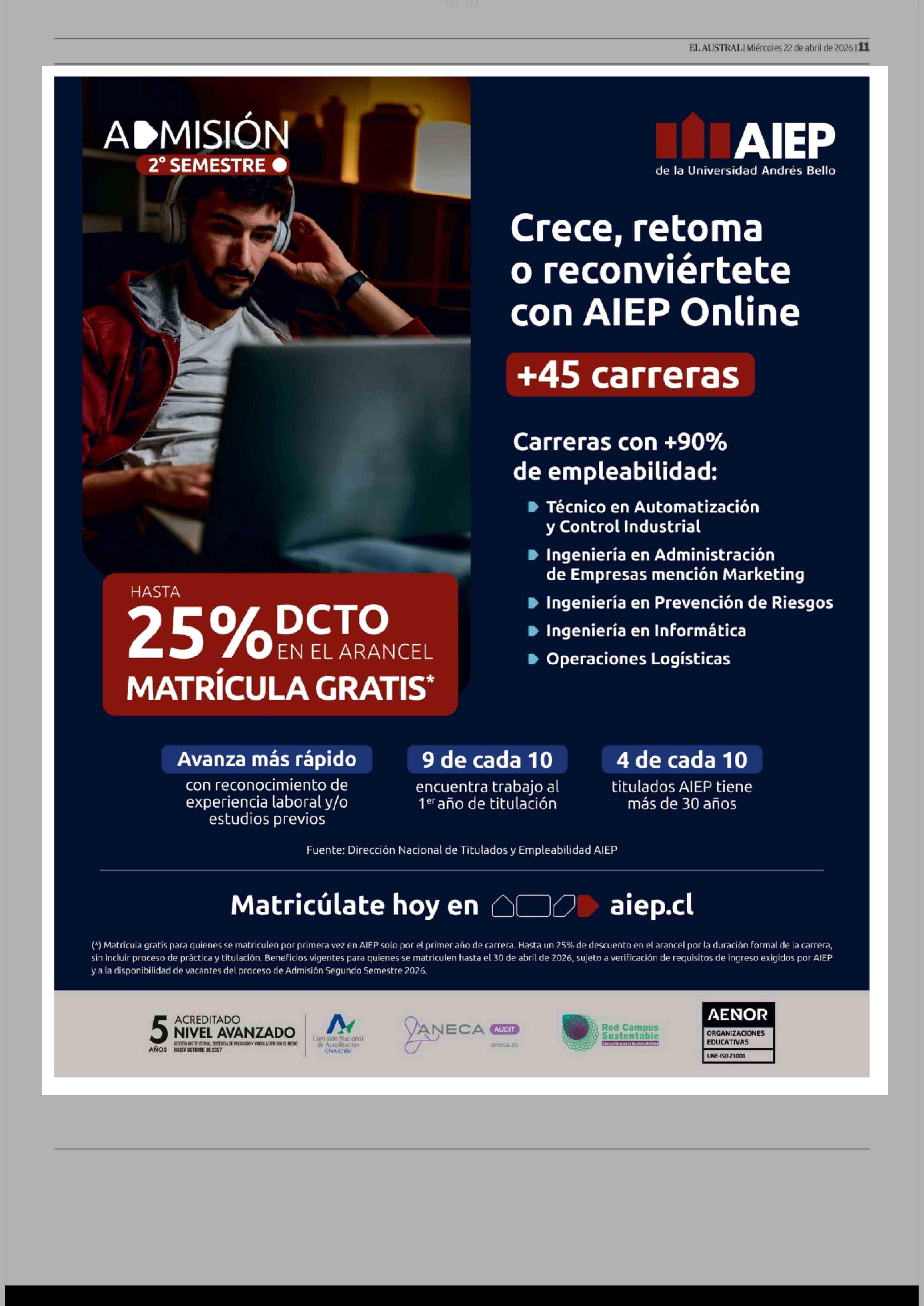 Aviso Educación: AIEP 22-04-2026 El Austral de la Araucanía |