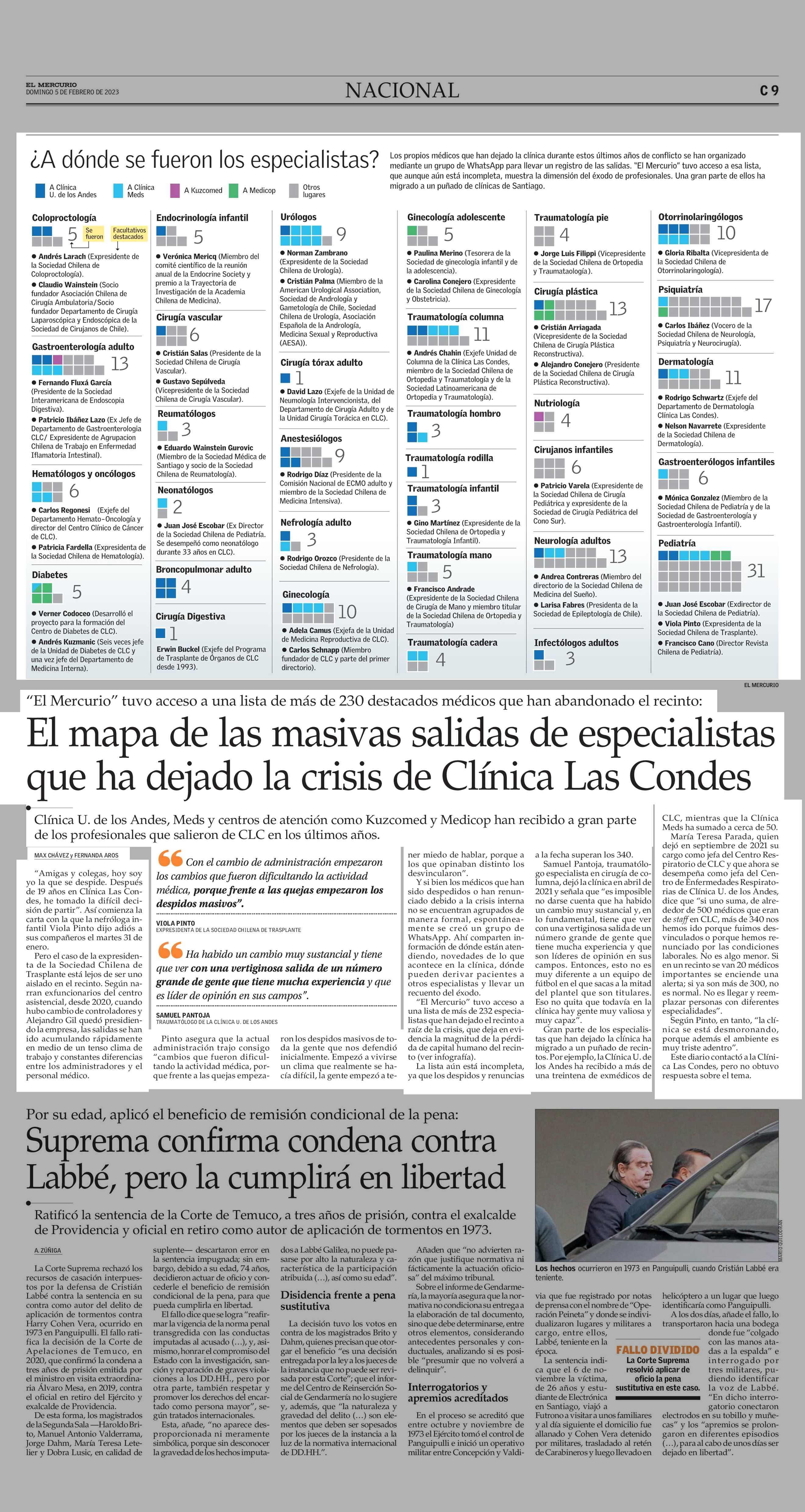 El mapa de las masivas salidas de especialistas que ha dejado la crisis de Clínica Las Condes 05-02-2023 El Mercurio |