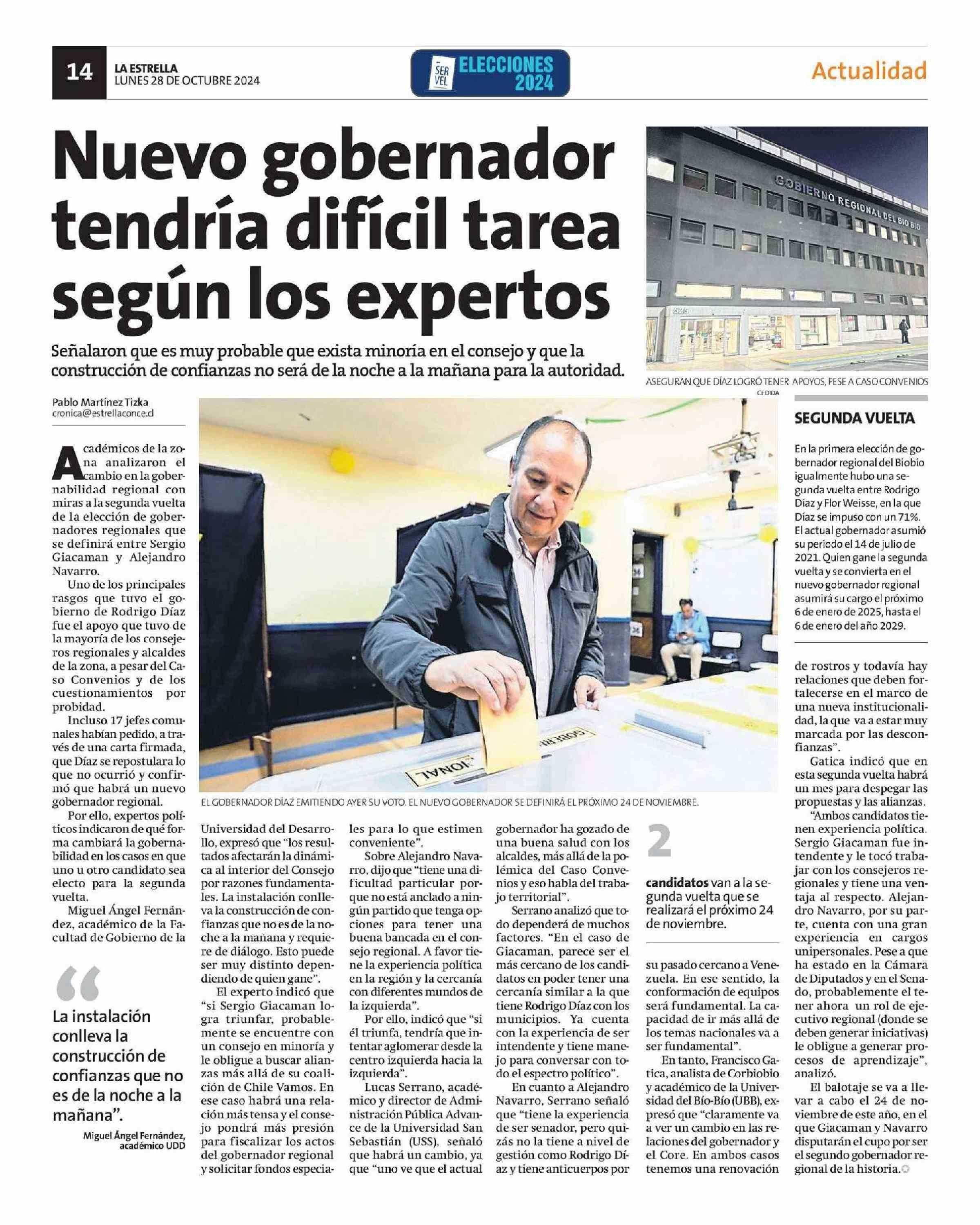 Nuevo gobernador tendría dificil tarea según los expertos 28-10-2024 La Estrella de Concepción |