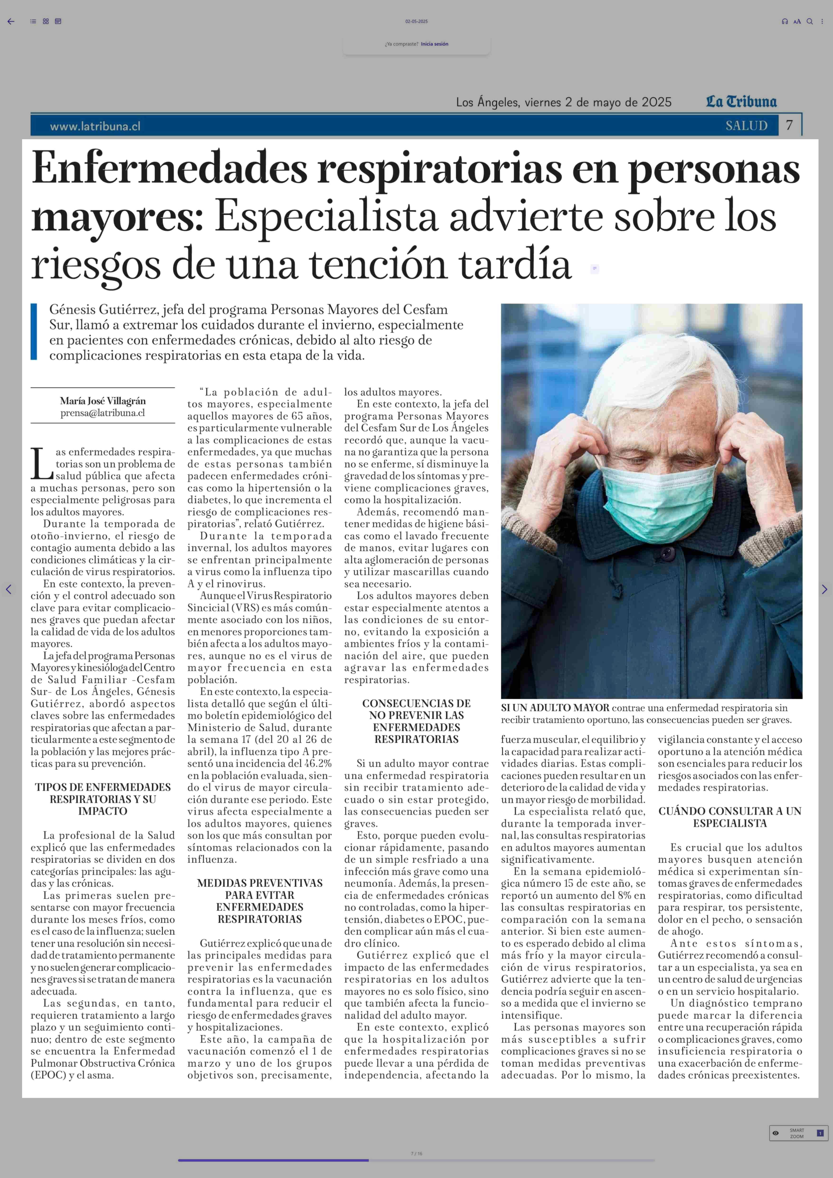 Enfermedades respiratorias en personas mayores: Especialista advierte sobre los riesgos de una tención tardía 02-05-2025 La Tribuna |