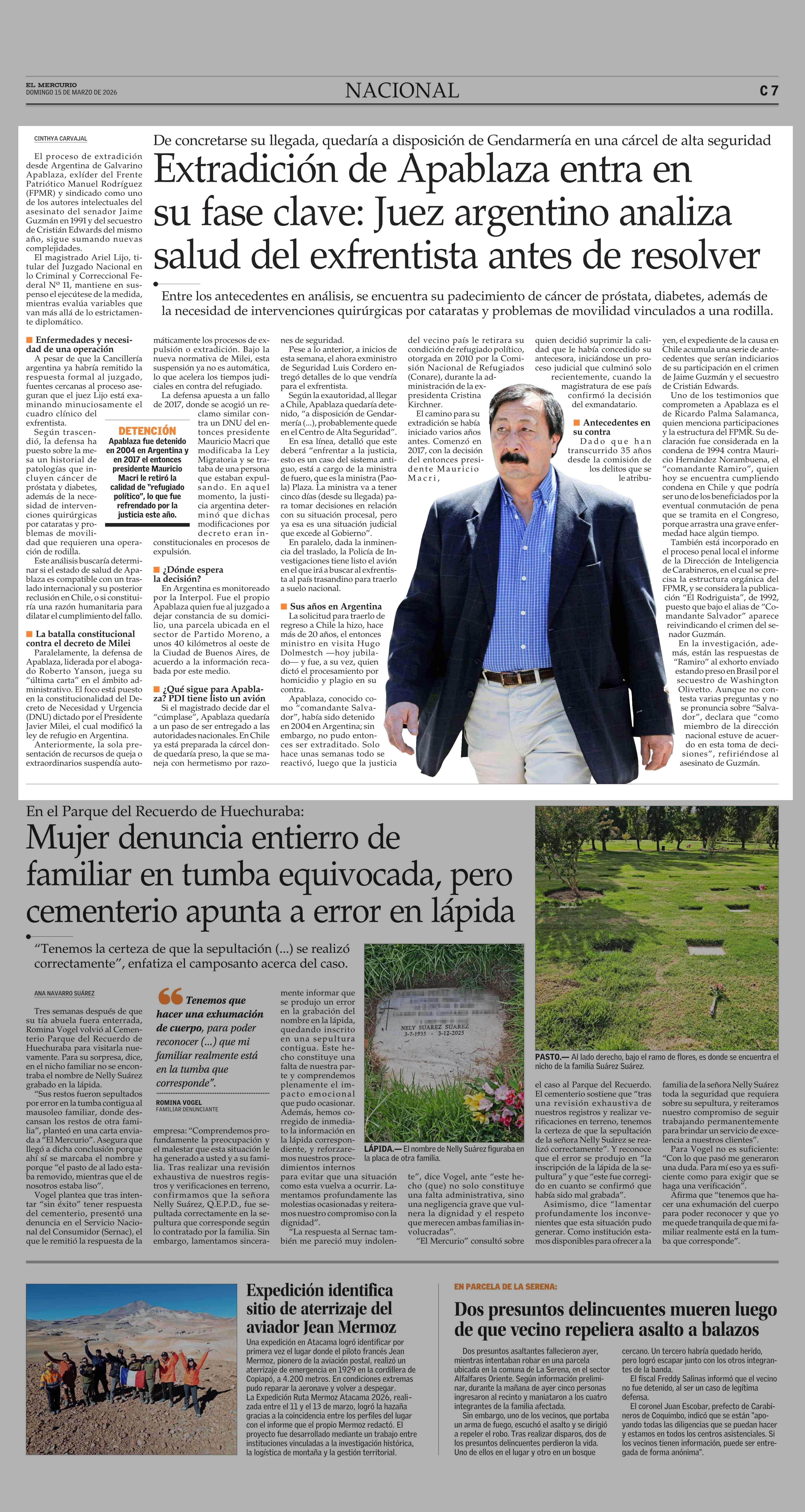Extradición de Apablaza entra en su fase clave: Juez argentino analiza salud del exfrentista antes de resolver 15-03-2026 El Mercurio |