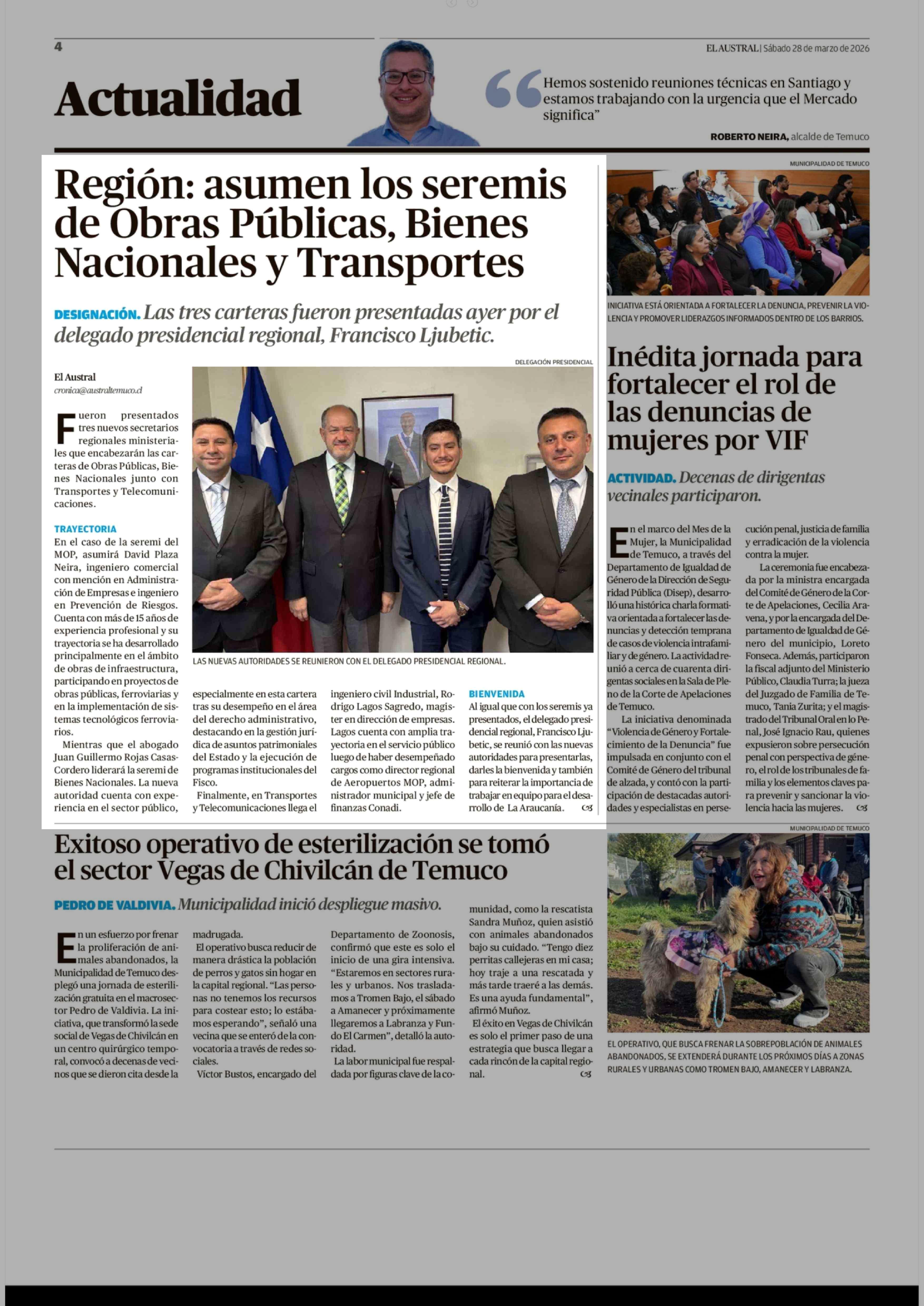 Región: asumen los seremis de Obras Públicas, Bienes Nacionales y Transportes 28-03-2026 El Austral de la Araucanía |