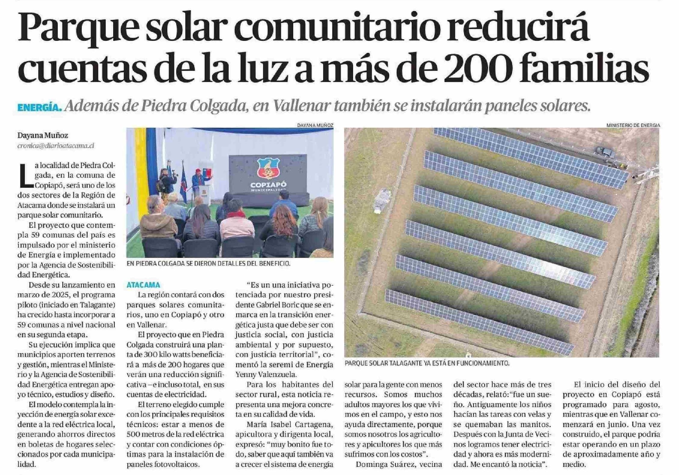 Parque solar comunitario reducirá cuentas de la luz a más de 200 familias 09-06-2025 El Diario de Atacama |