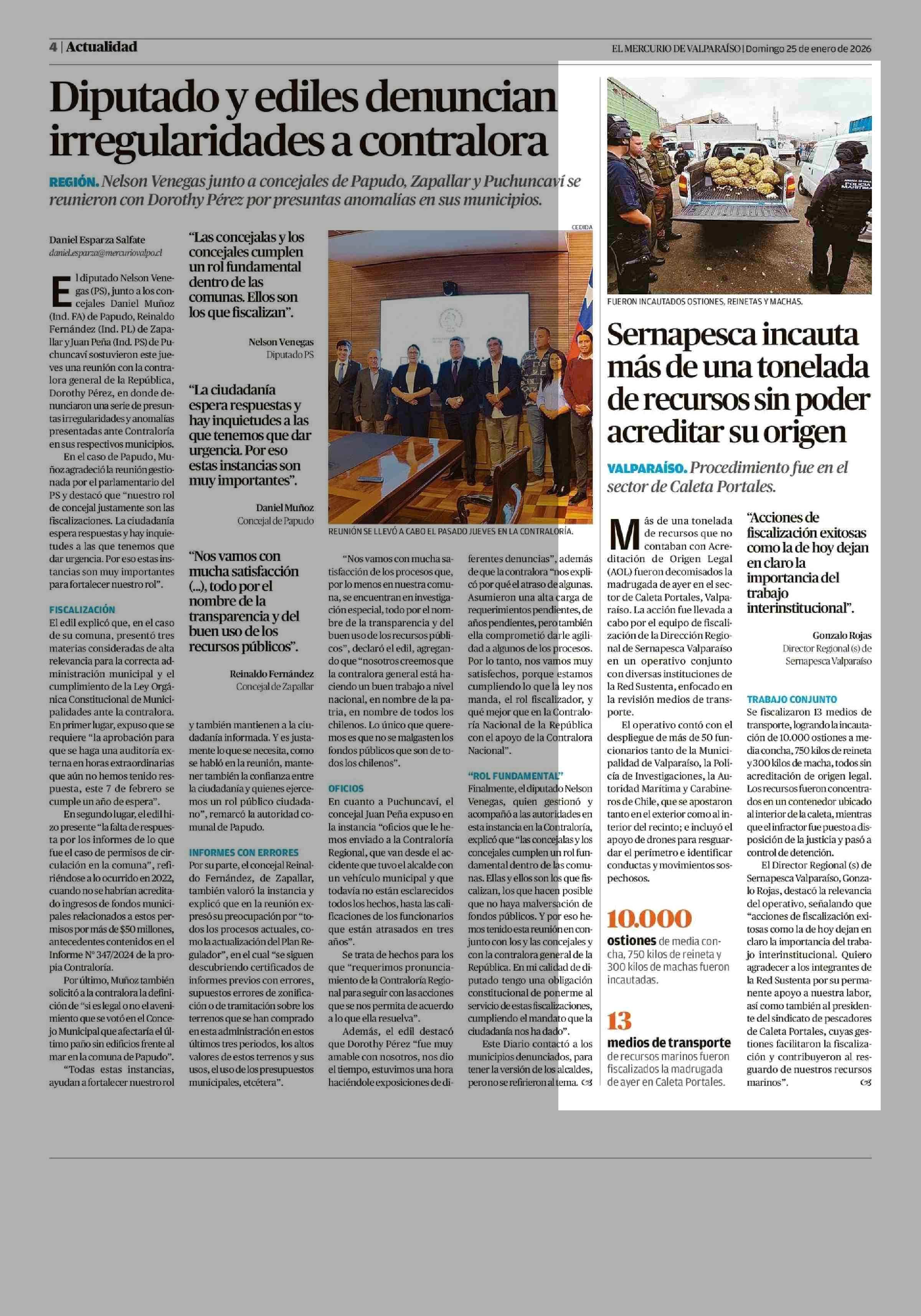 Sernapesca incauta más de una tonelada de recursos sin poder acreditar su origen 25-01-2026 El Mercurio de Valparaíso |