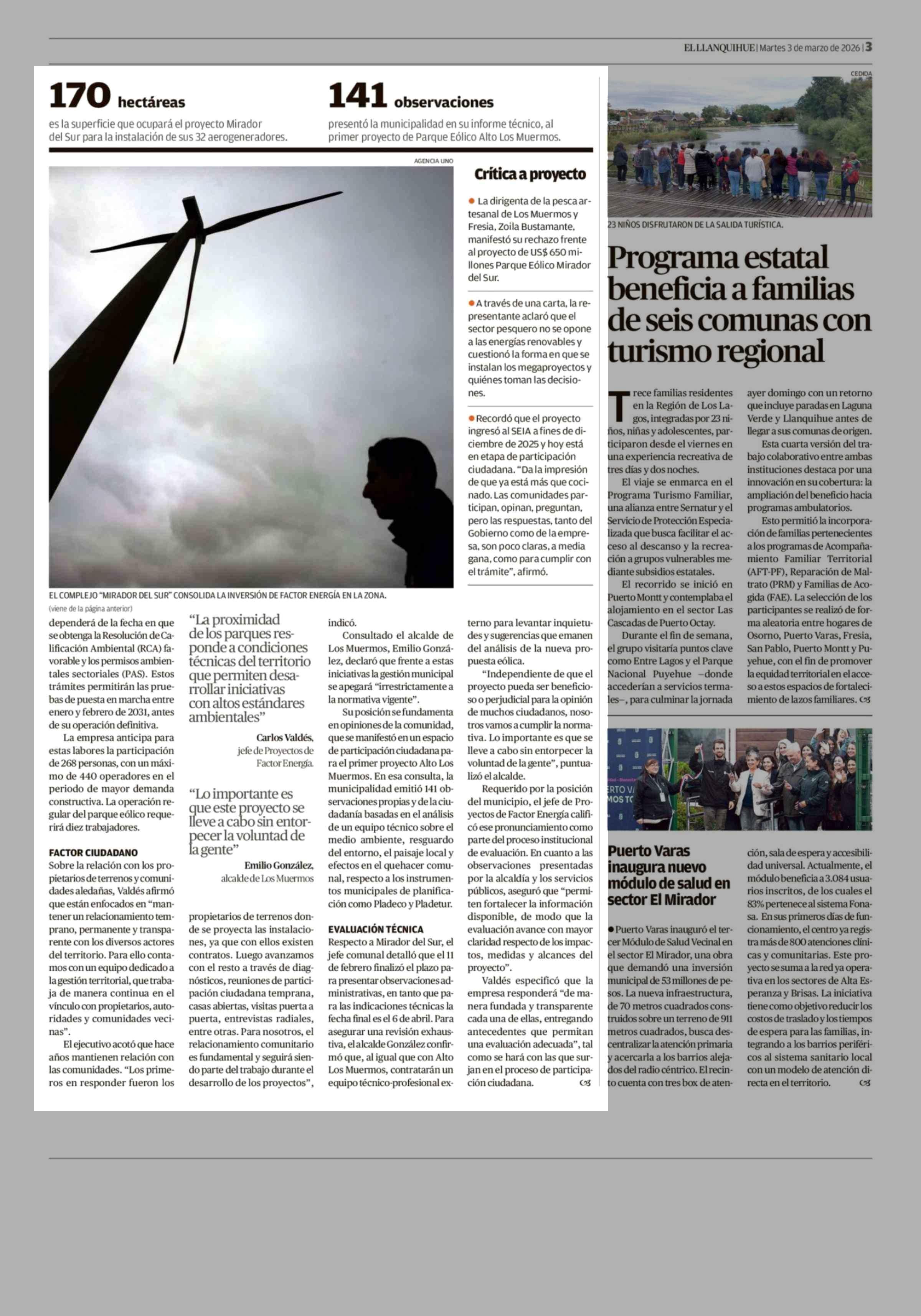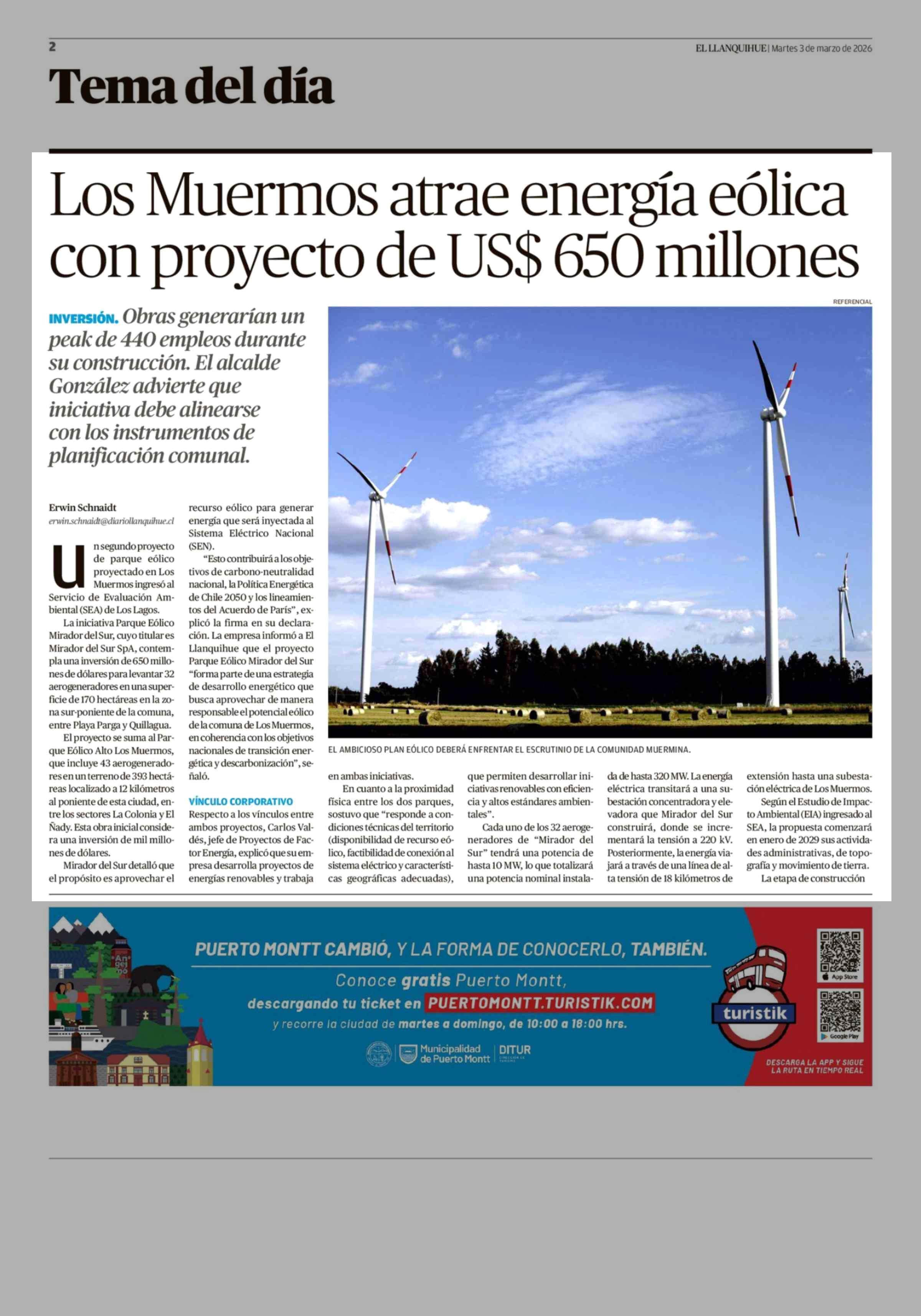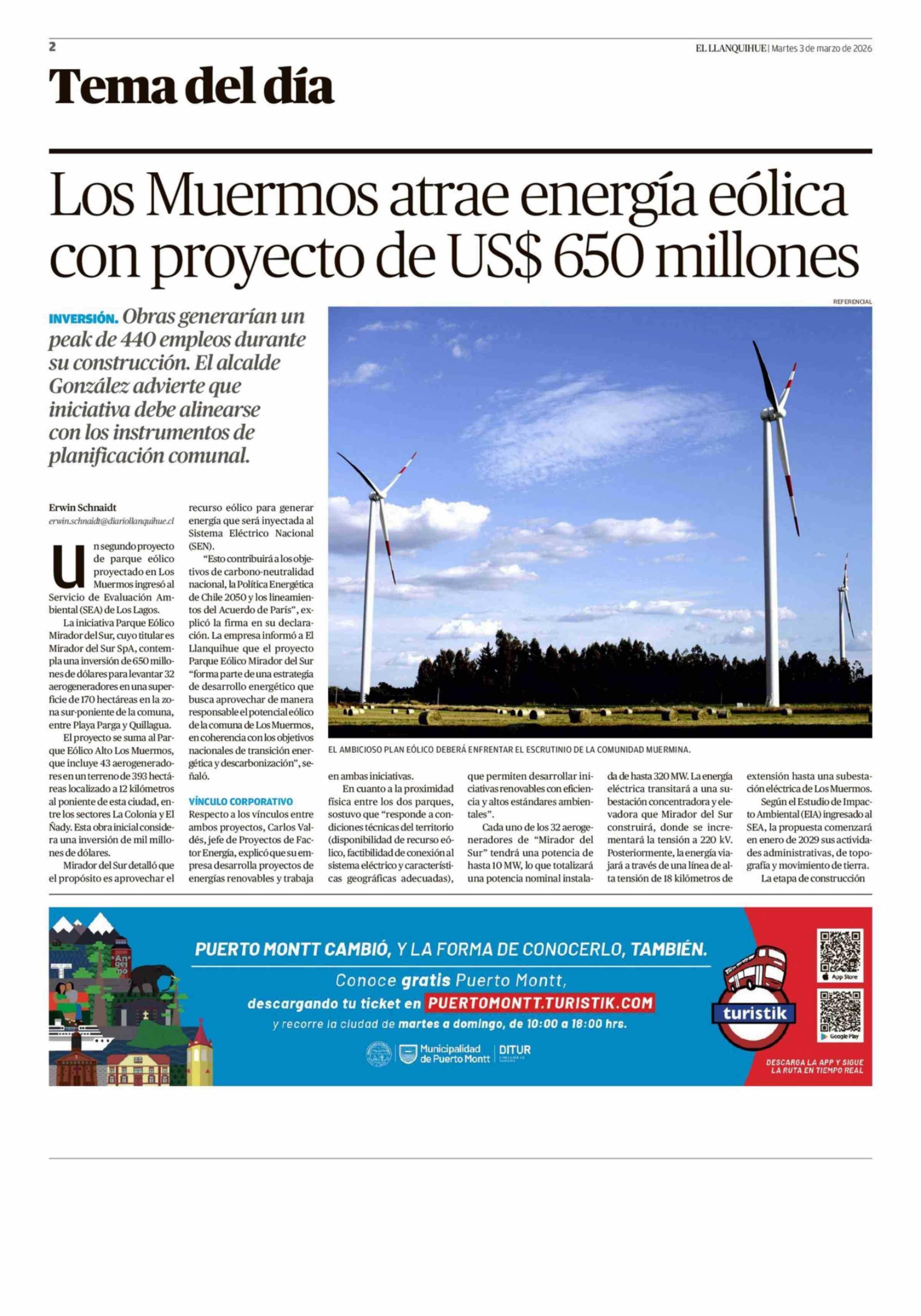 Los Muermos atrae energía eólica con proyecto de US$ 650 millones 03-03-2026 El Llanquihue |