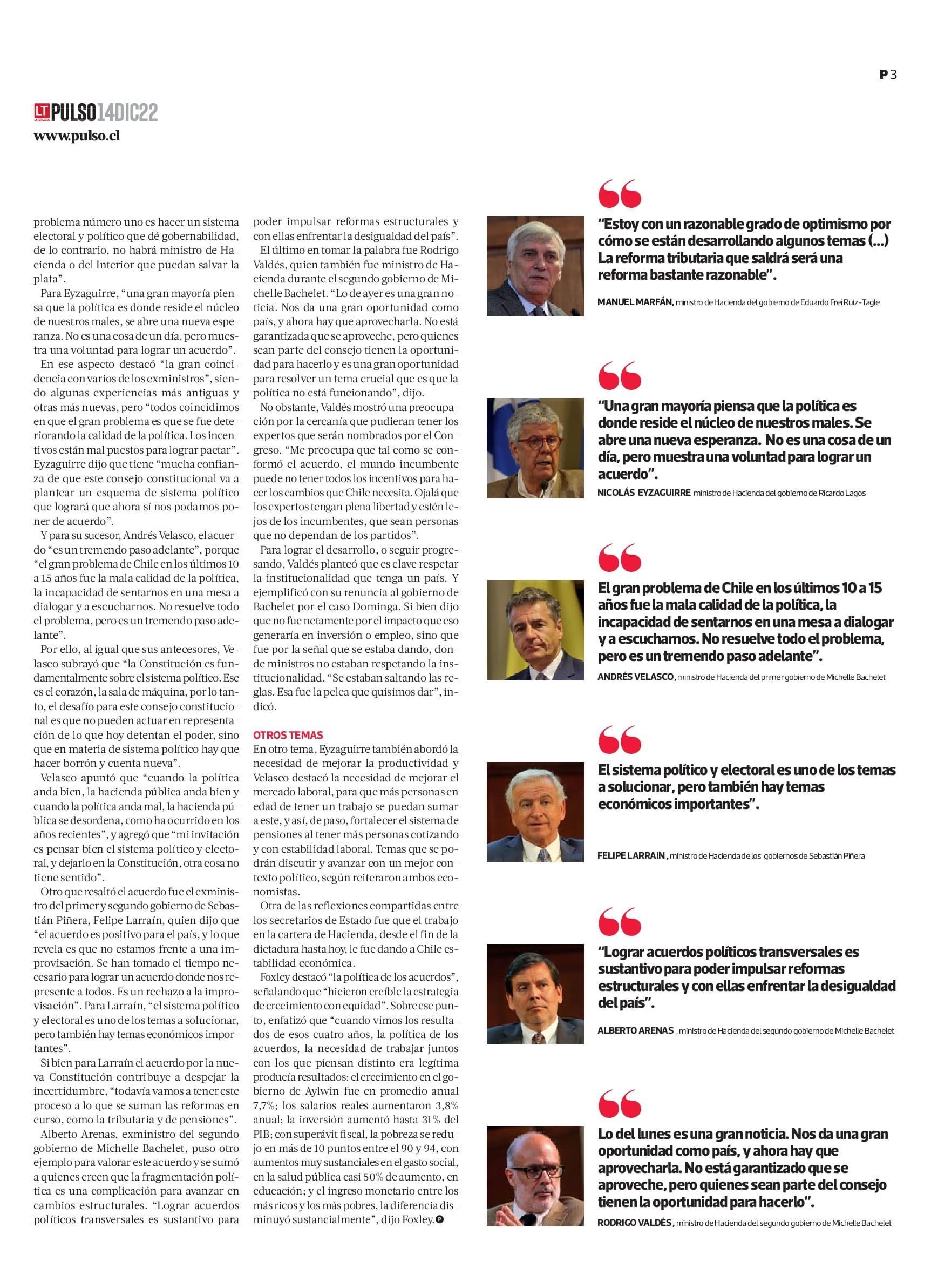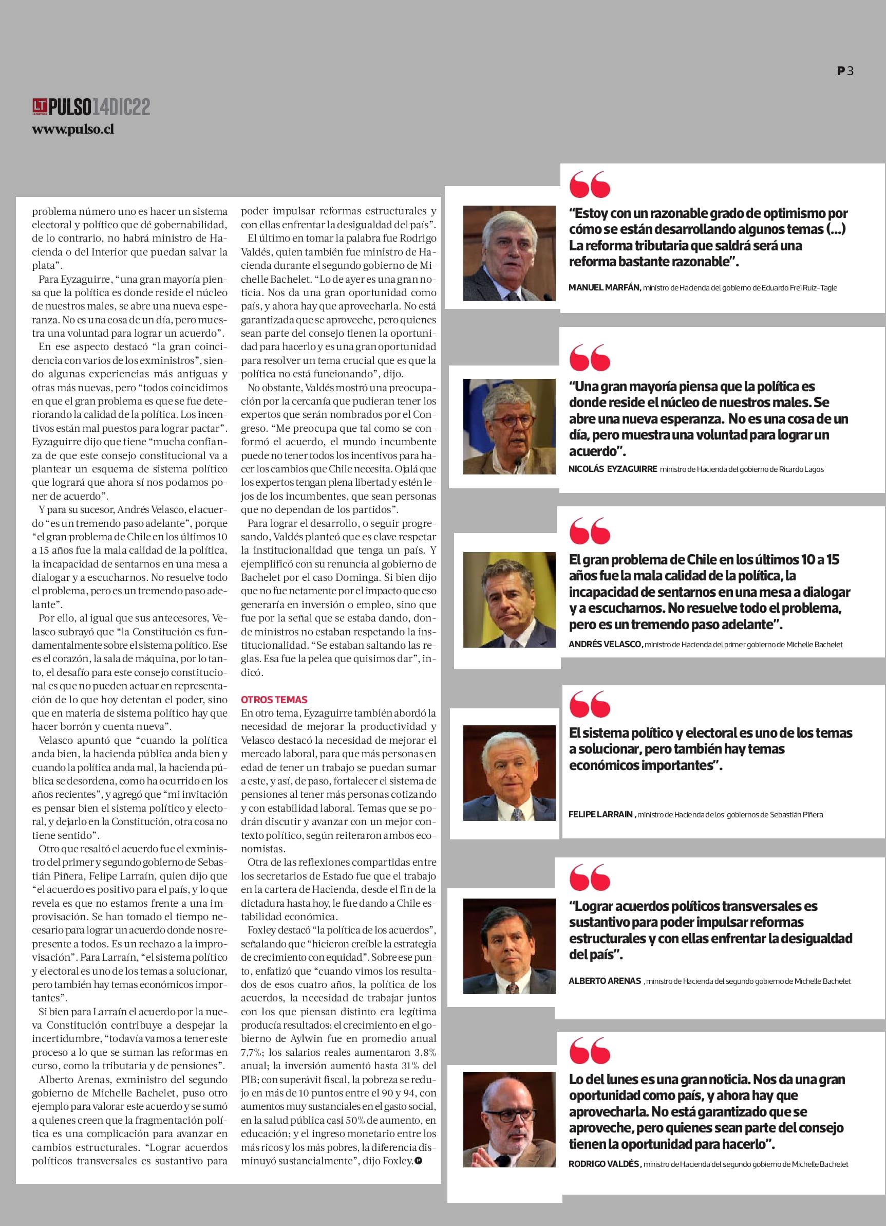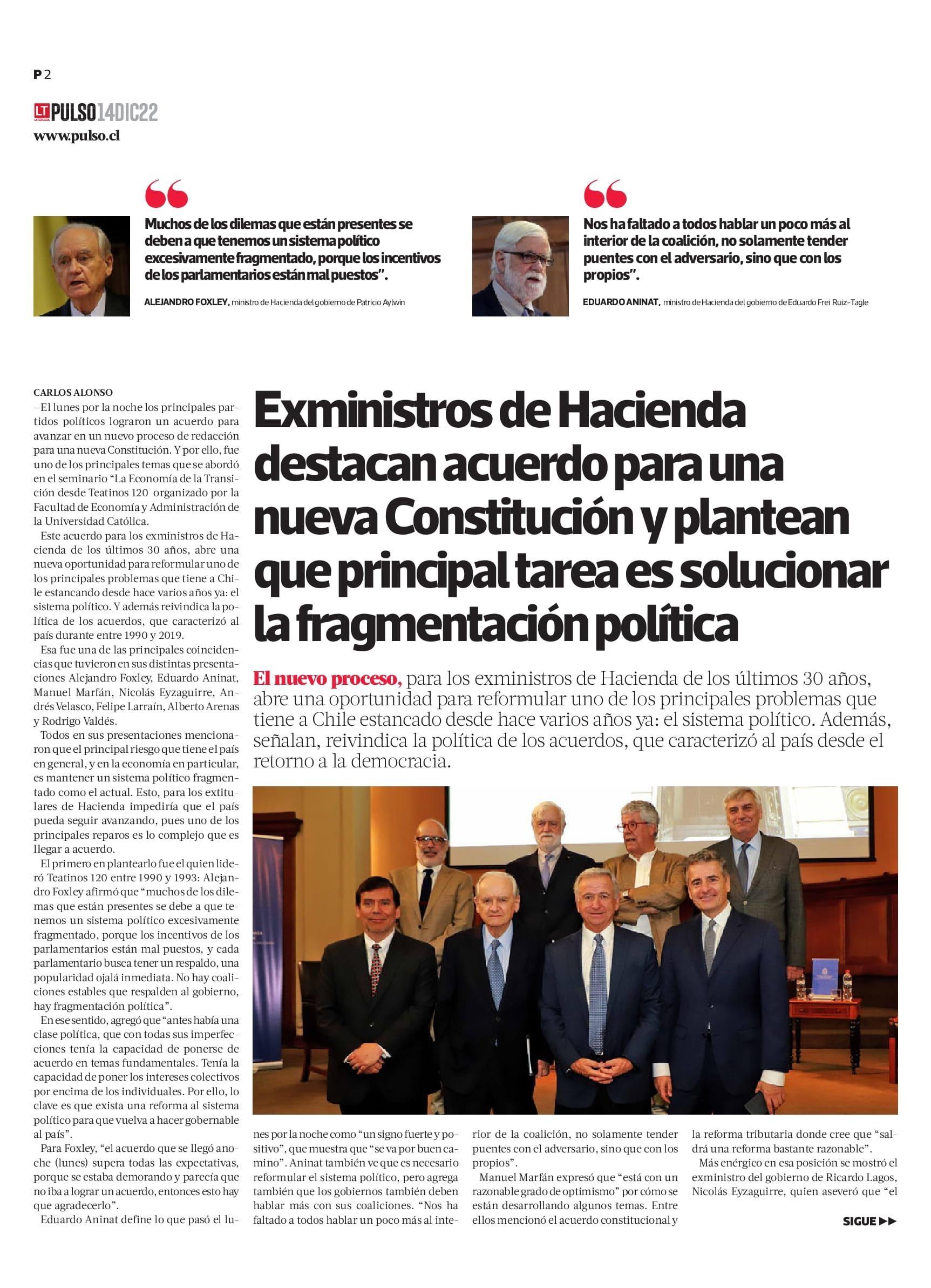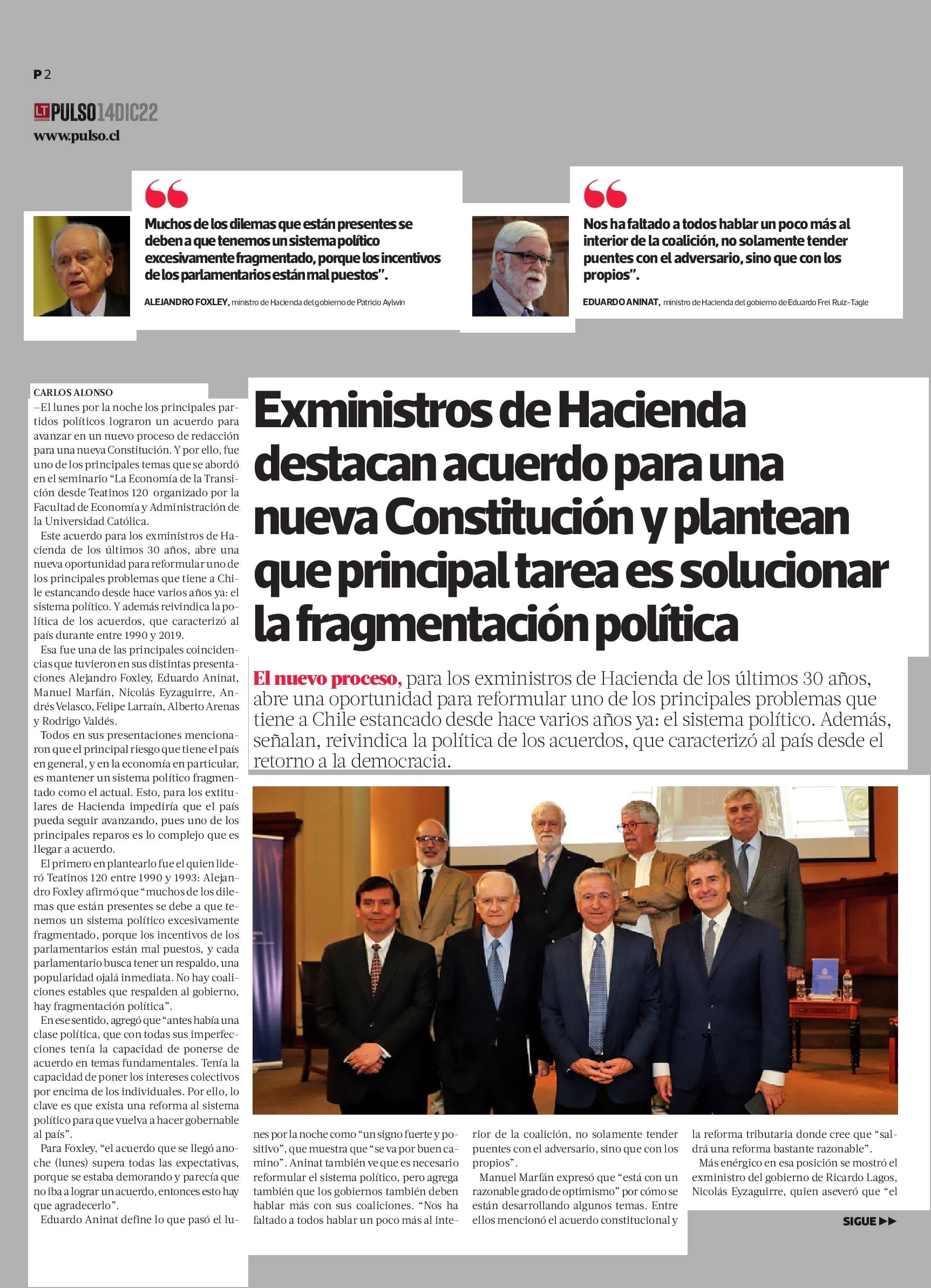 Exministros de Hacienda destacan acuerdo para una nueva Constitución y plantean que principal tarea es solucionar la fragmentación política 14-12-2022 La Tercera |