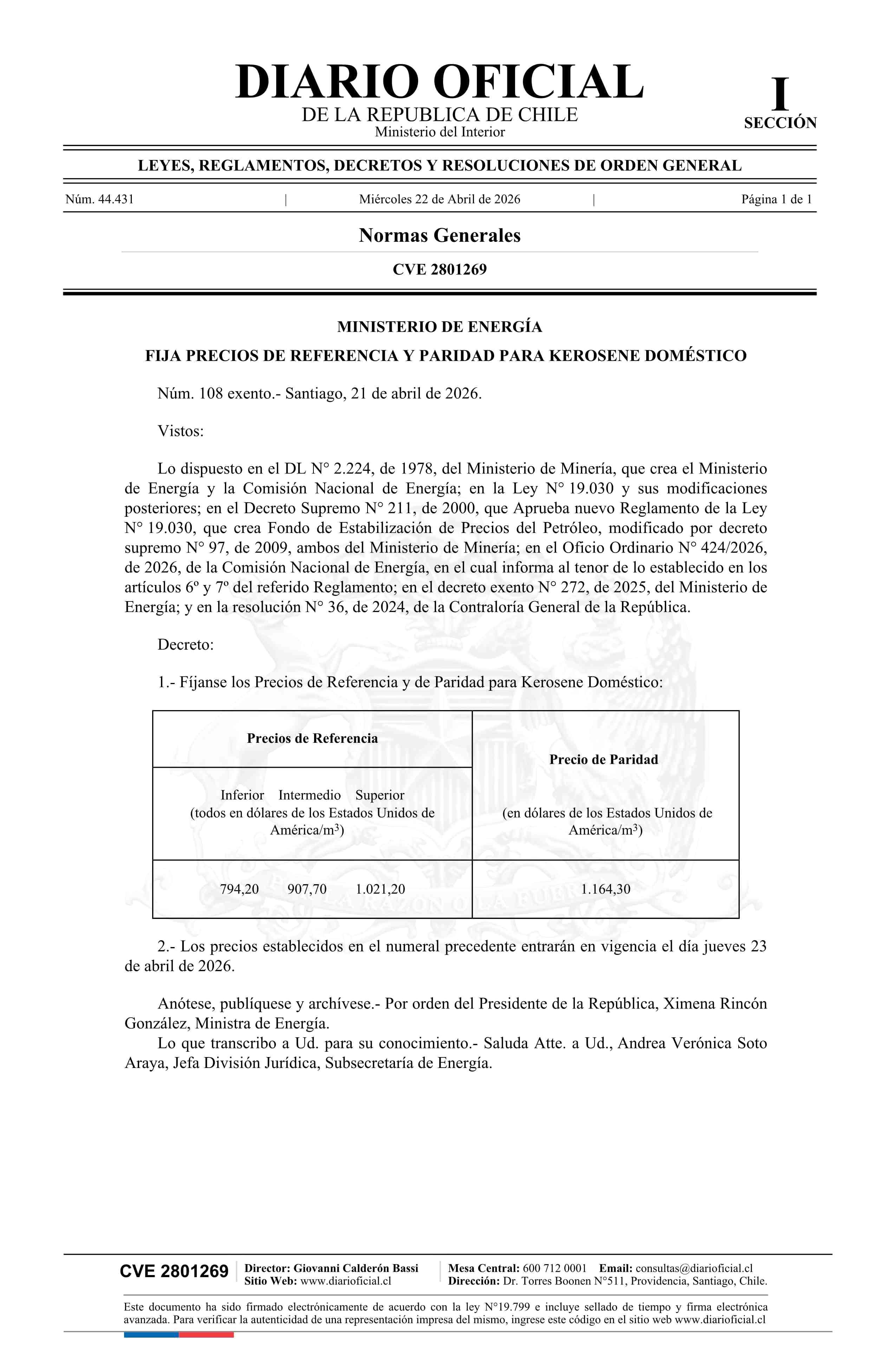 Título: Decreto exento número 108, de 2026.- Fija precios de referencia y paridad para kerosene doméstico