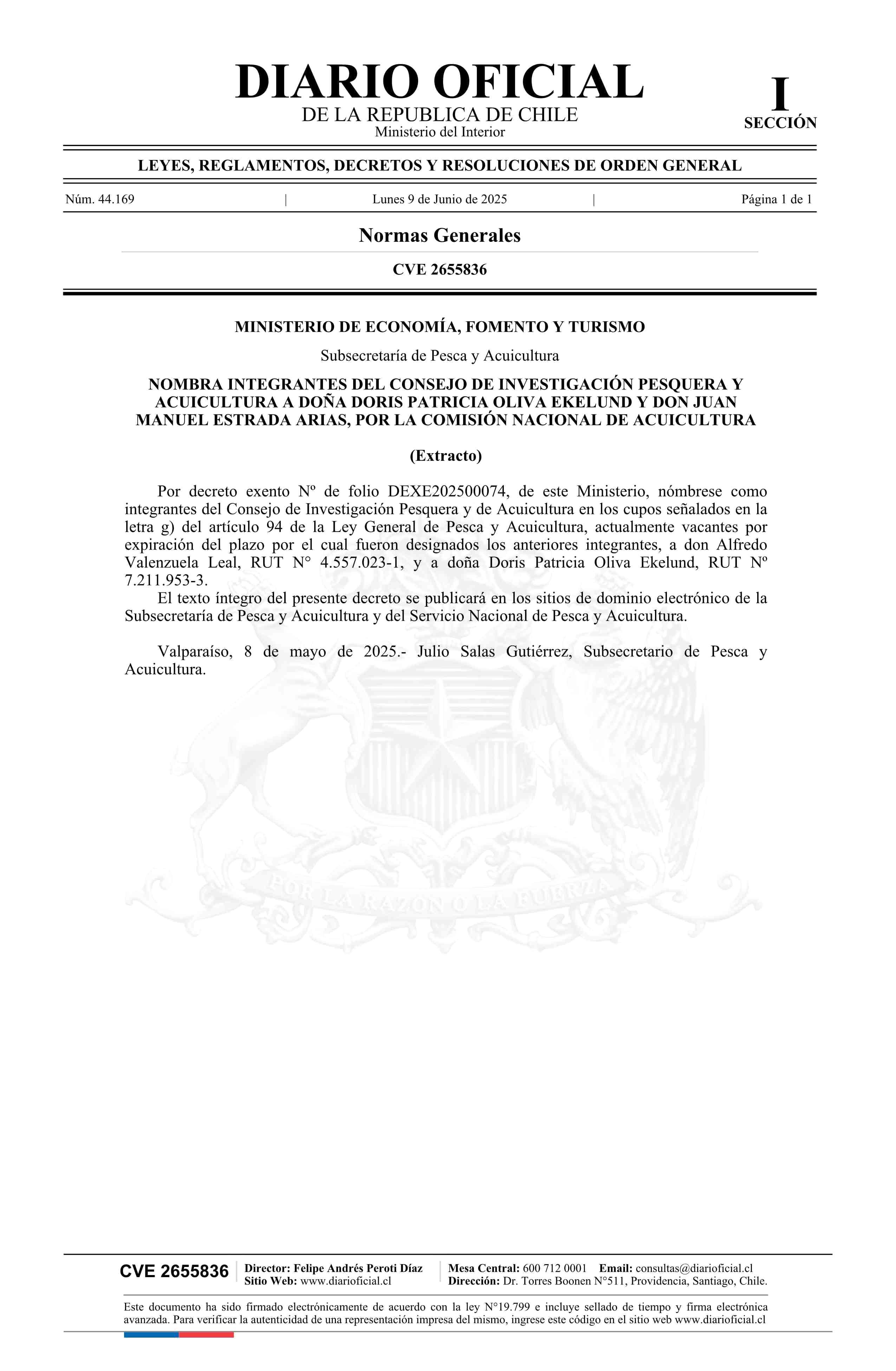 | Título: | Extracto de decreto exento número DEXE202500074, de 2025.- Nombra como integrantes del Consejo de Investigación Pesquera y Acuicultura a doña Doris Patricia Oliva Ekelund y don Juan Manuel Estrada Arias, por la Comisión Nacional de Acuicultura |
