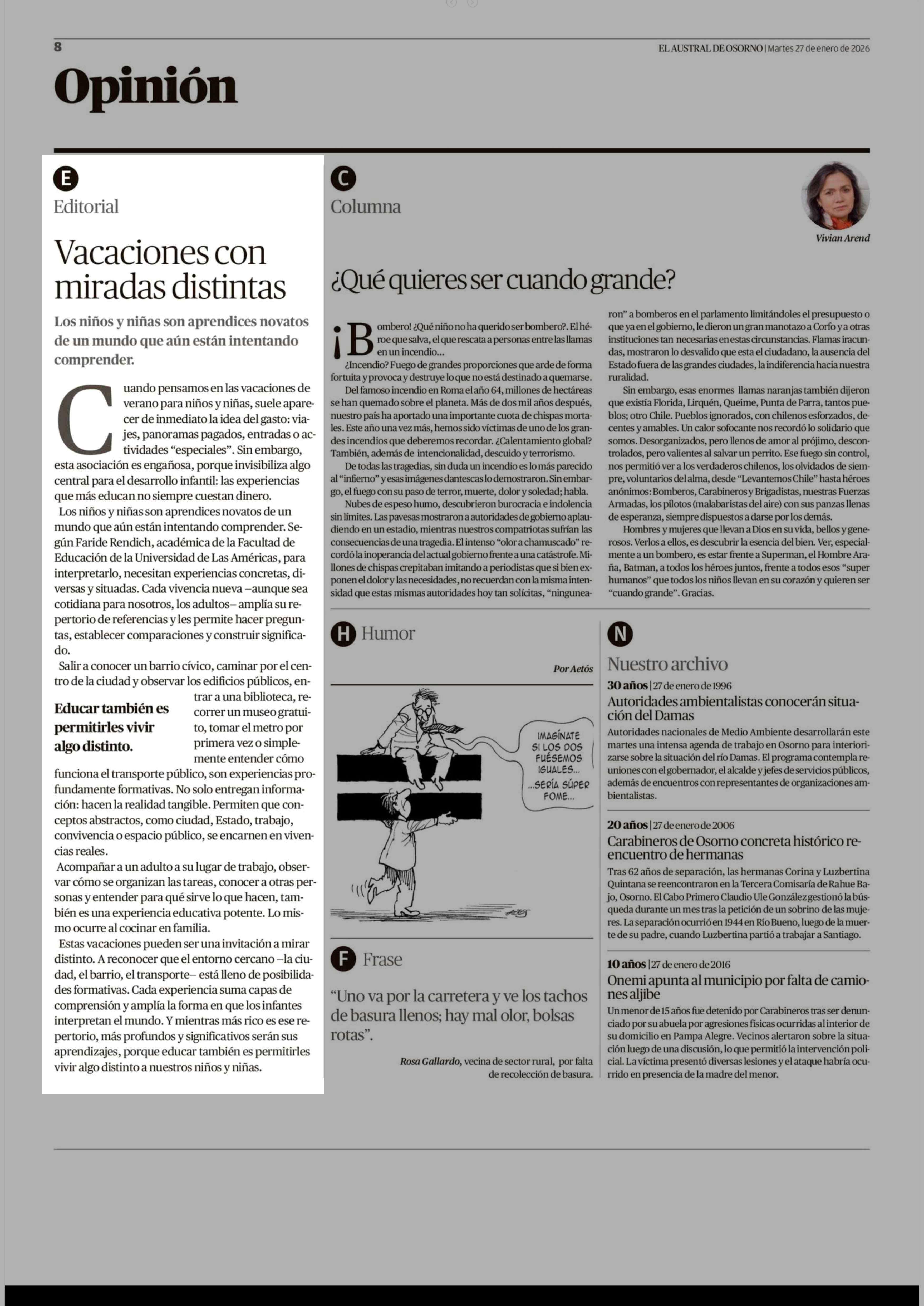 Editorial: Vacaciones con miradas distintas 27-01-2026 El Austral de Osorno |