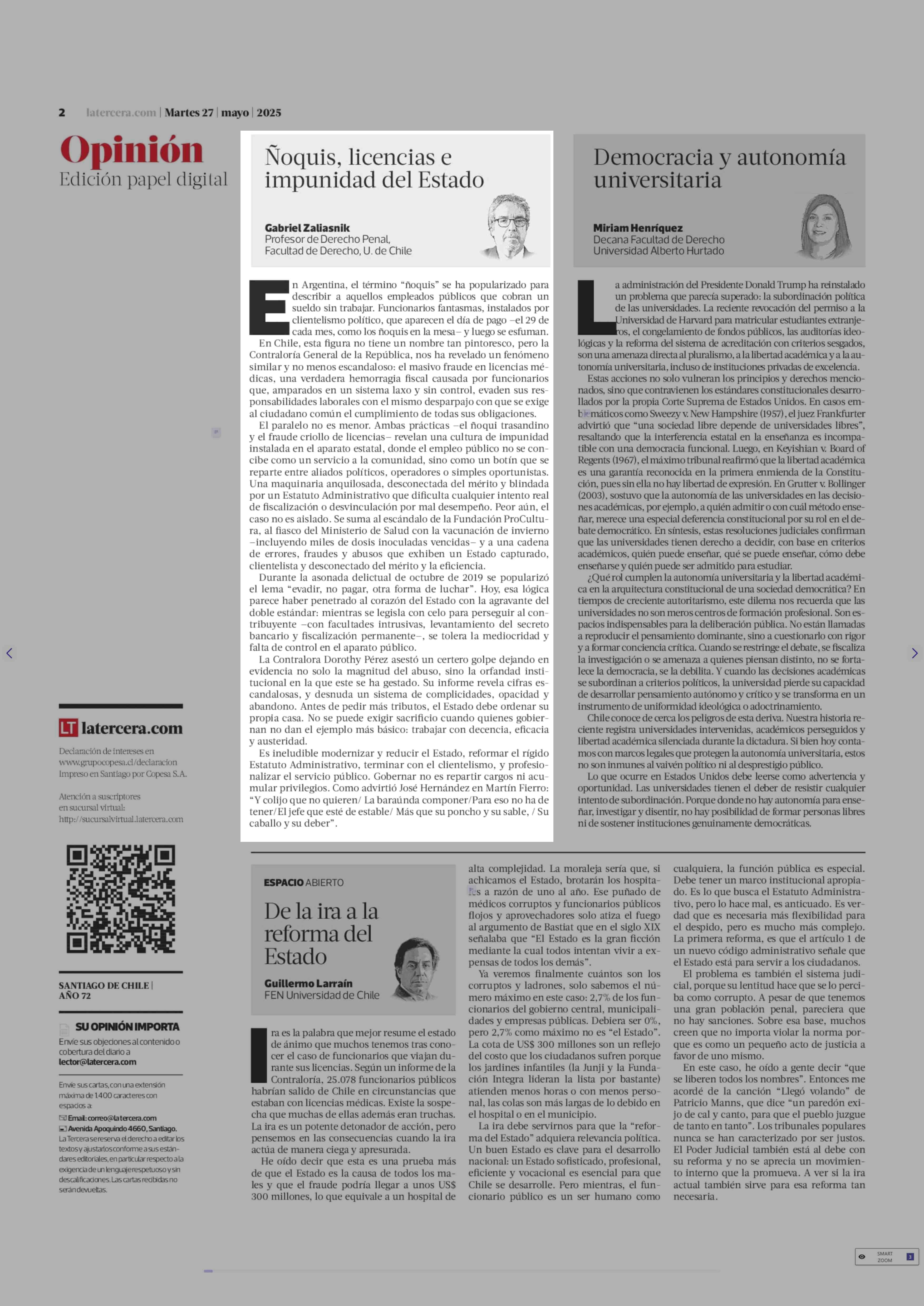Título: Columnas de Opinión: Ñoquis, licencias e impunidad del Estado