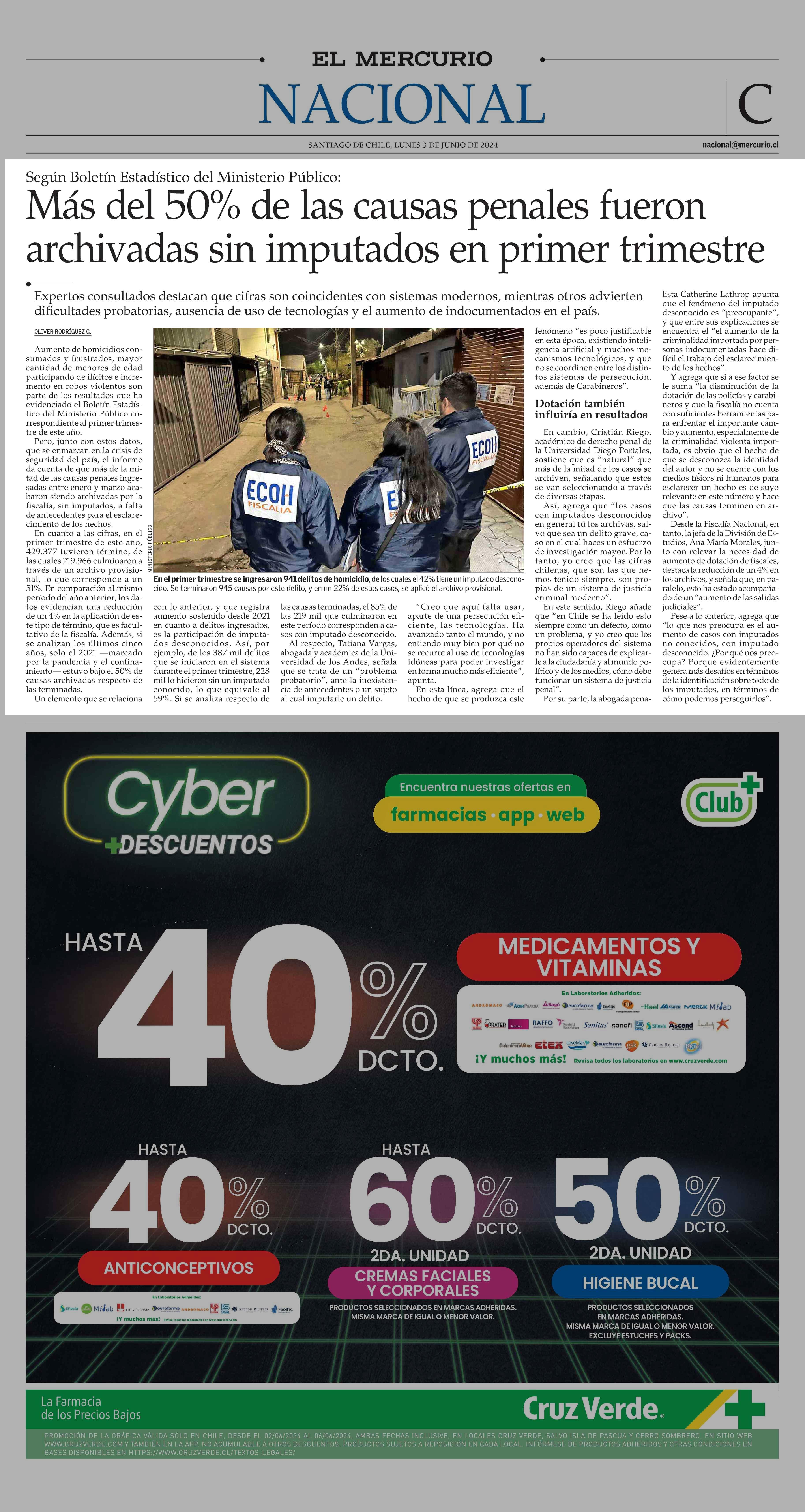 Más del 50% de las causas penales fueron archivadas sin imputados en primer trimestre 03-06-2024 El Mercurio |