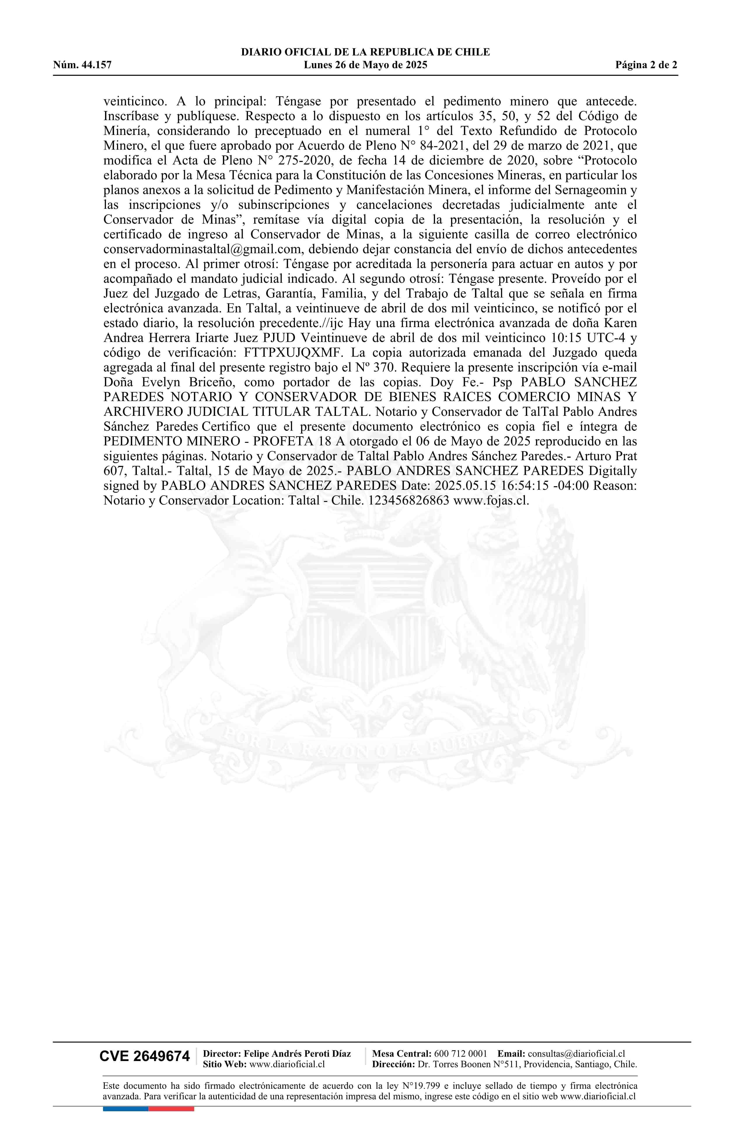 PROFETA 18 A / Sociedad Química y Minera de Chile S.A. 26-05-2025 DIARIO OFICIAL CHILE - BOLETÍN OFICIAL DE MINERÍA |