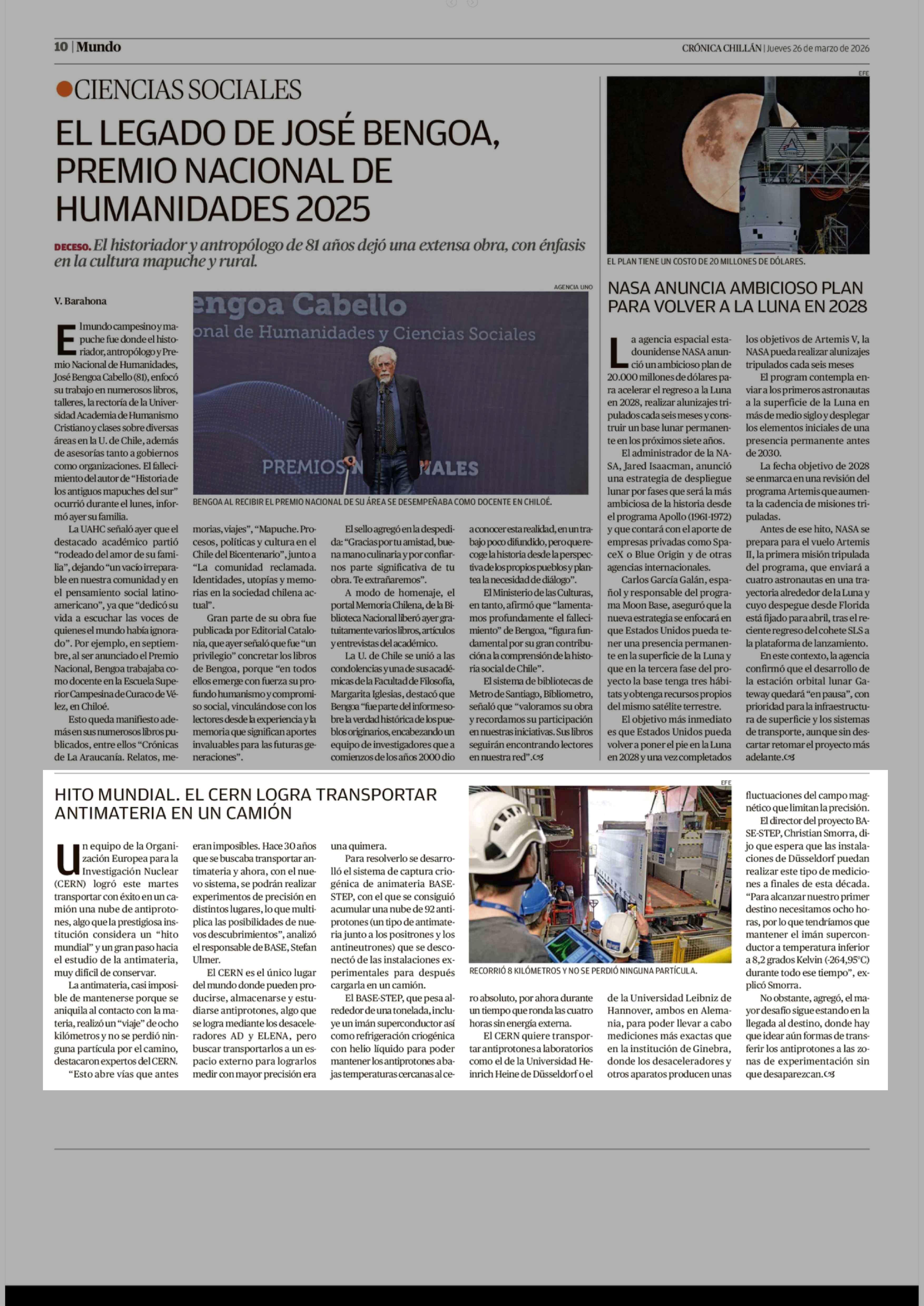 HITO MUNDIAL. EL CERN LOGRA TRANSPORTAR ANTIMATERIA EN UN CAMIÓN 26-03-2026 Crónica de Chillán |