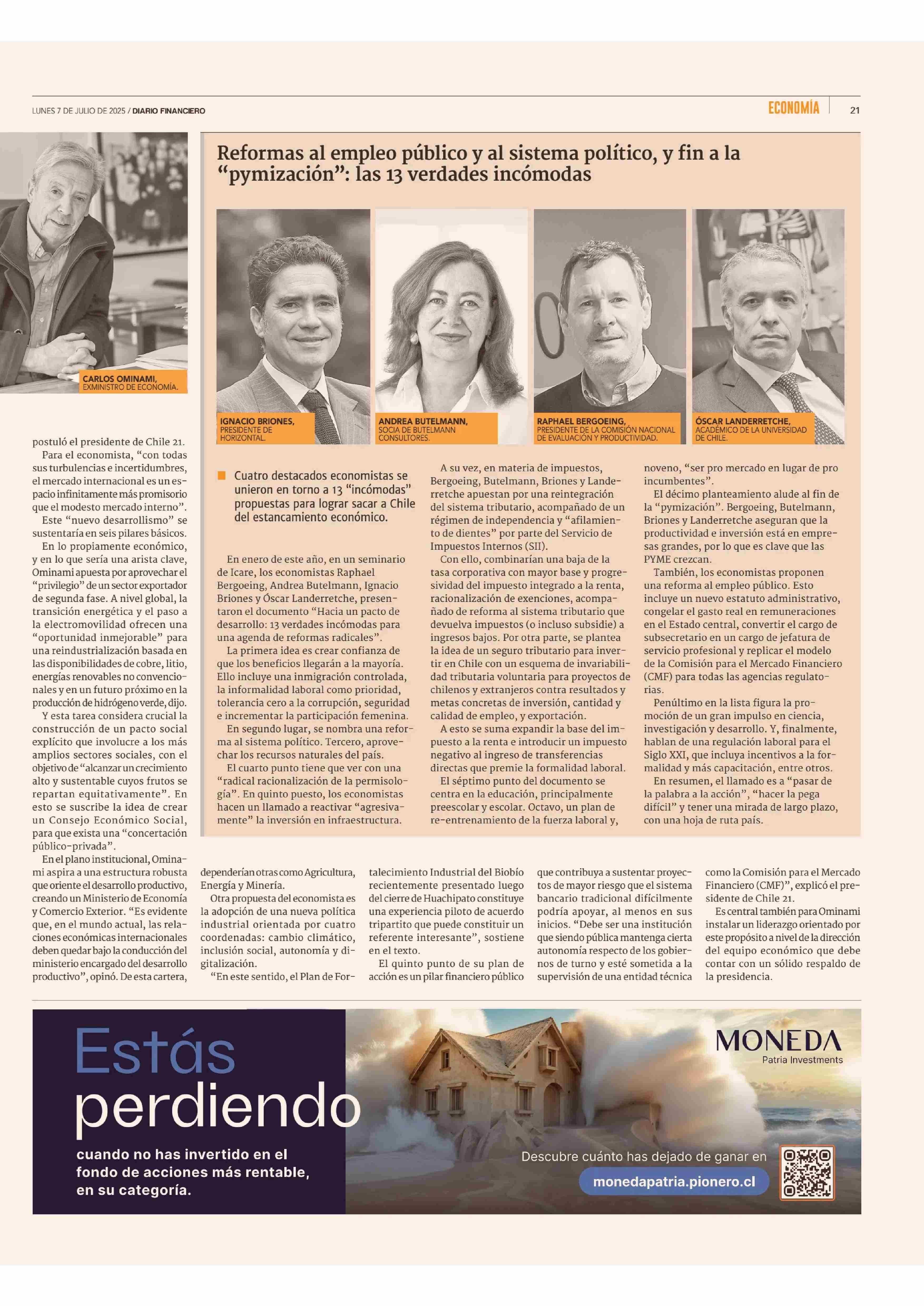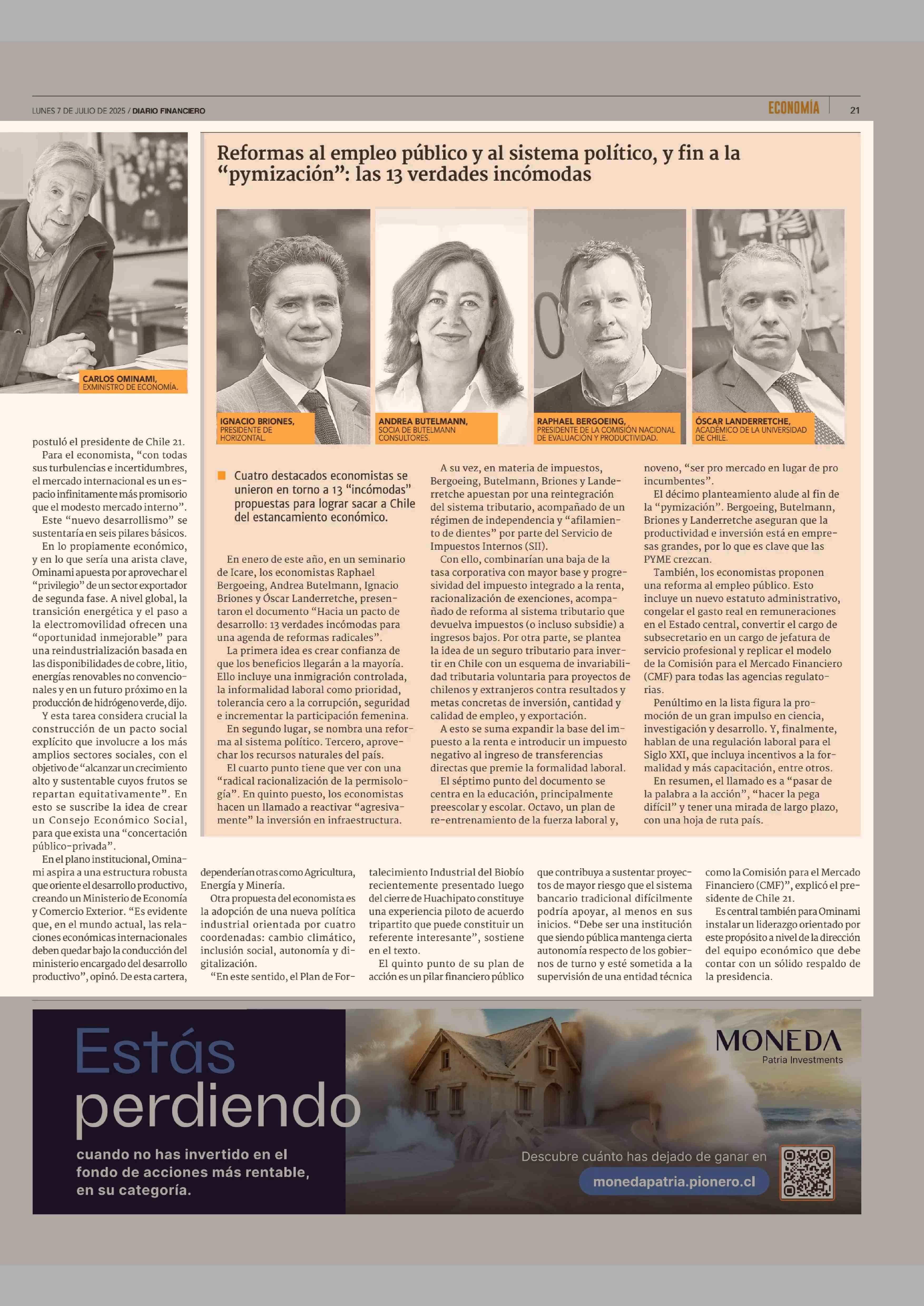 El crecimiento se toma el debate de los técnicos y entra en escena una nueva propuesta de Carlos Ominami 07-07-2025 Diario Financiero |