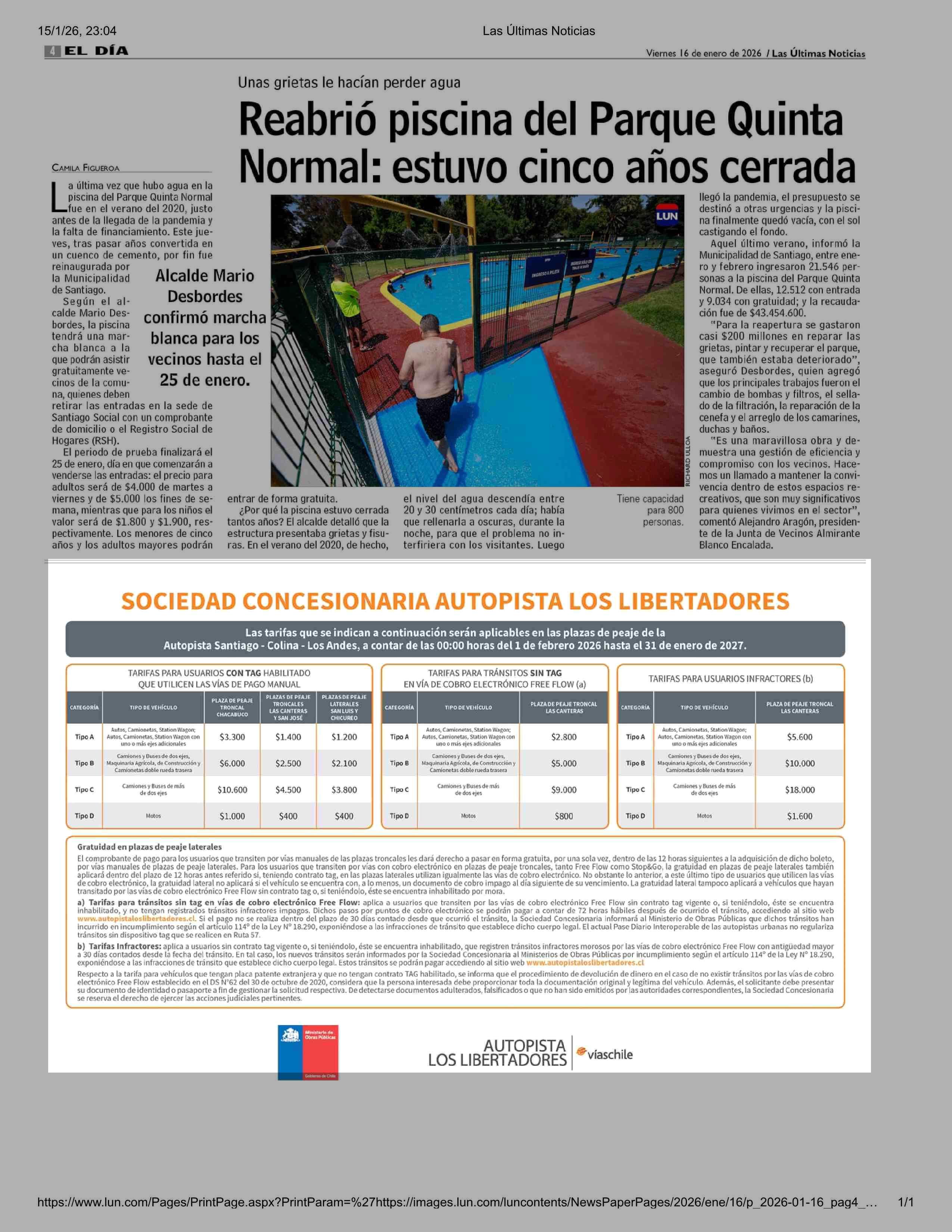 Aviso Autopistas: SOCIEDAD CONCESIONARIA AUTOPISTA LOS LIBERTADORES 16-01-2026 Las Últimas Noticias |