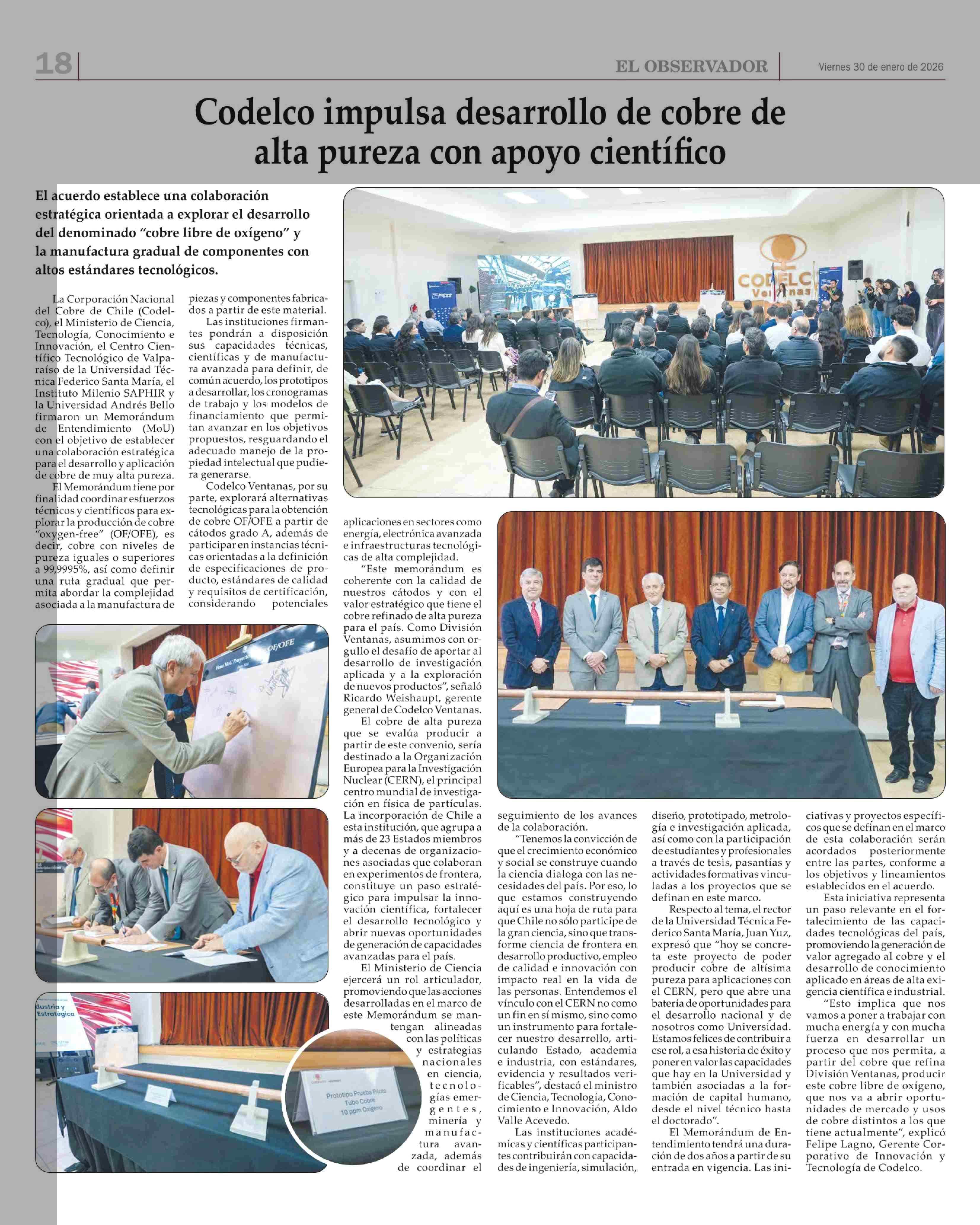 Codelco impulsa desarrollo de cobre de alta pureza con apoyo científico 30-01-2026 El Observador |