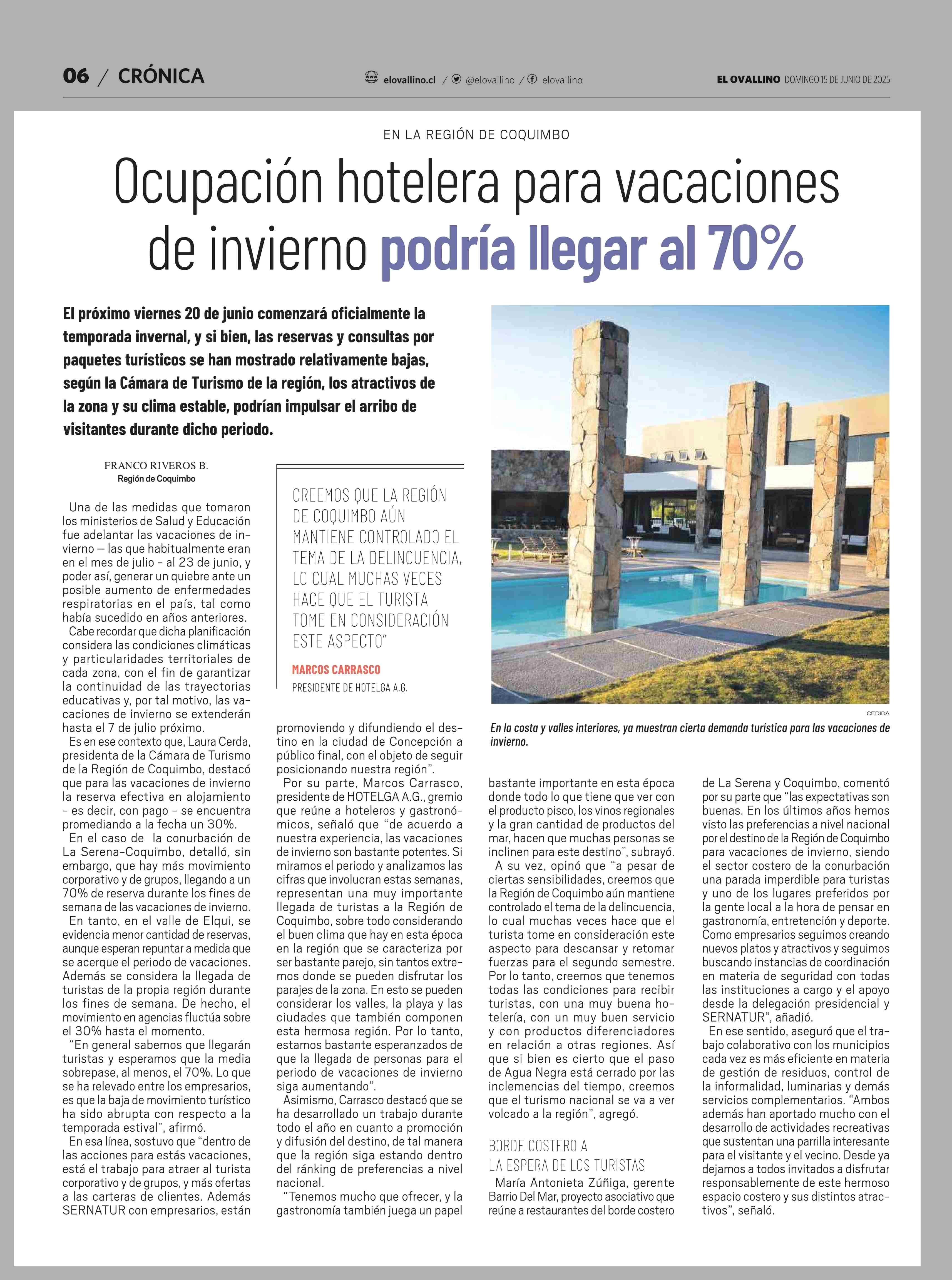 Ocupación hotelera para vacaciones de invierno podría llegar al 70% 15-06-2025 El Ovallino |