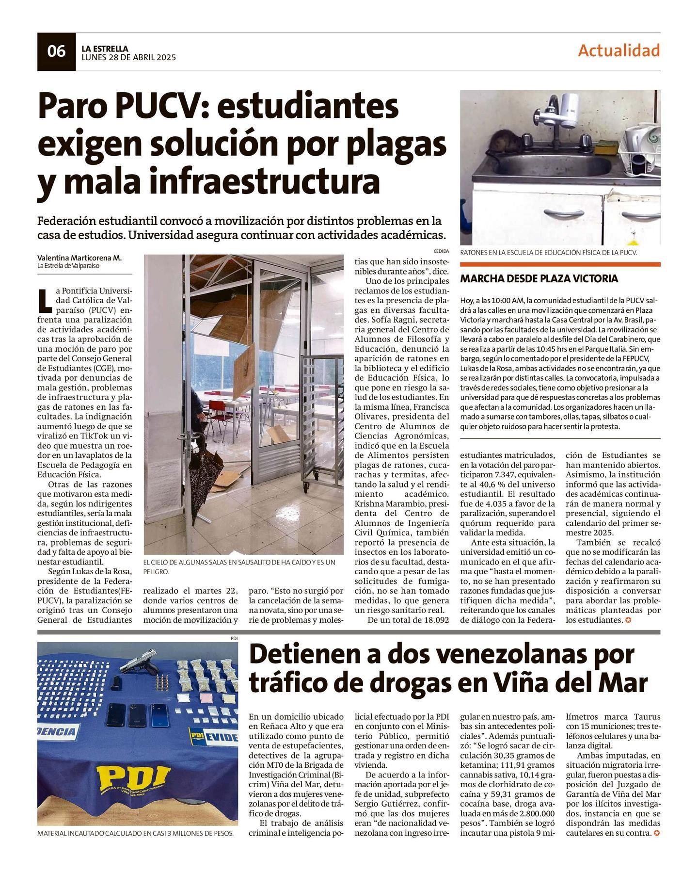 Paro PUCV: estudiantes exigen solución por plagas y mala infraestructura 28-04-2025 La Estrella de Valparaíso |