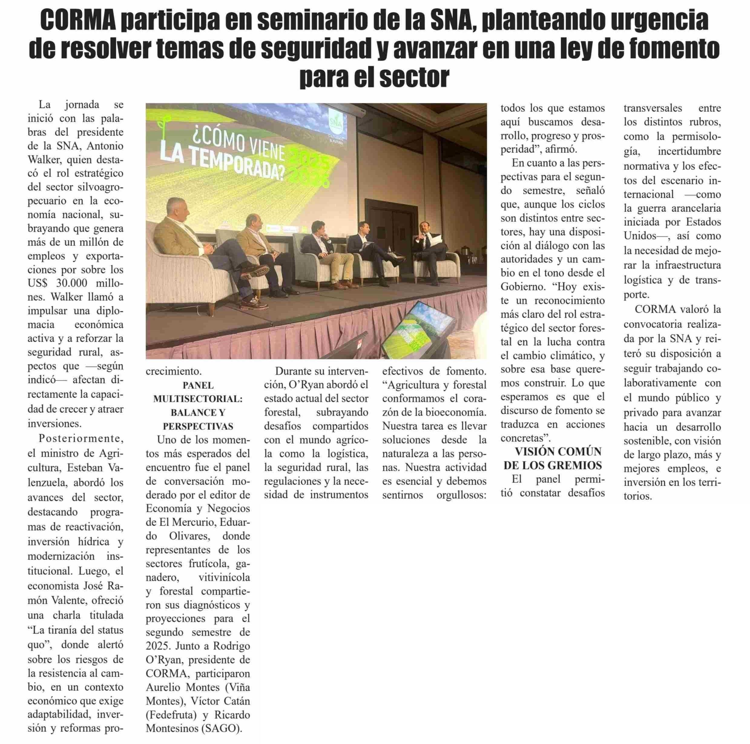 CORMA participa en seminario de la SNA, planteando urgencia de resolver temas de seguridad y avanzar en una ley de fomento para el sector 14-06-2025 El Heraldo |