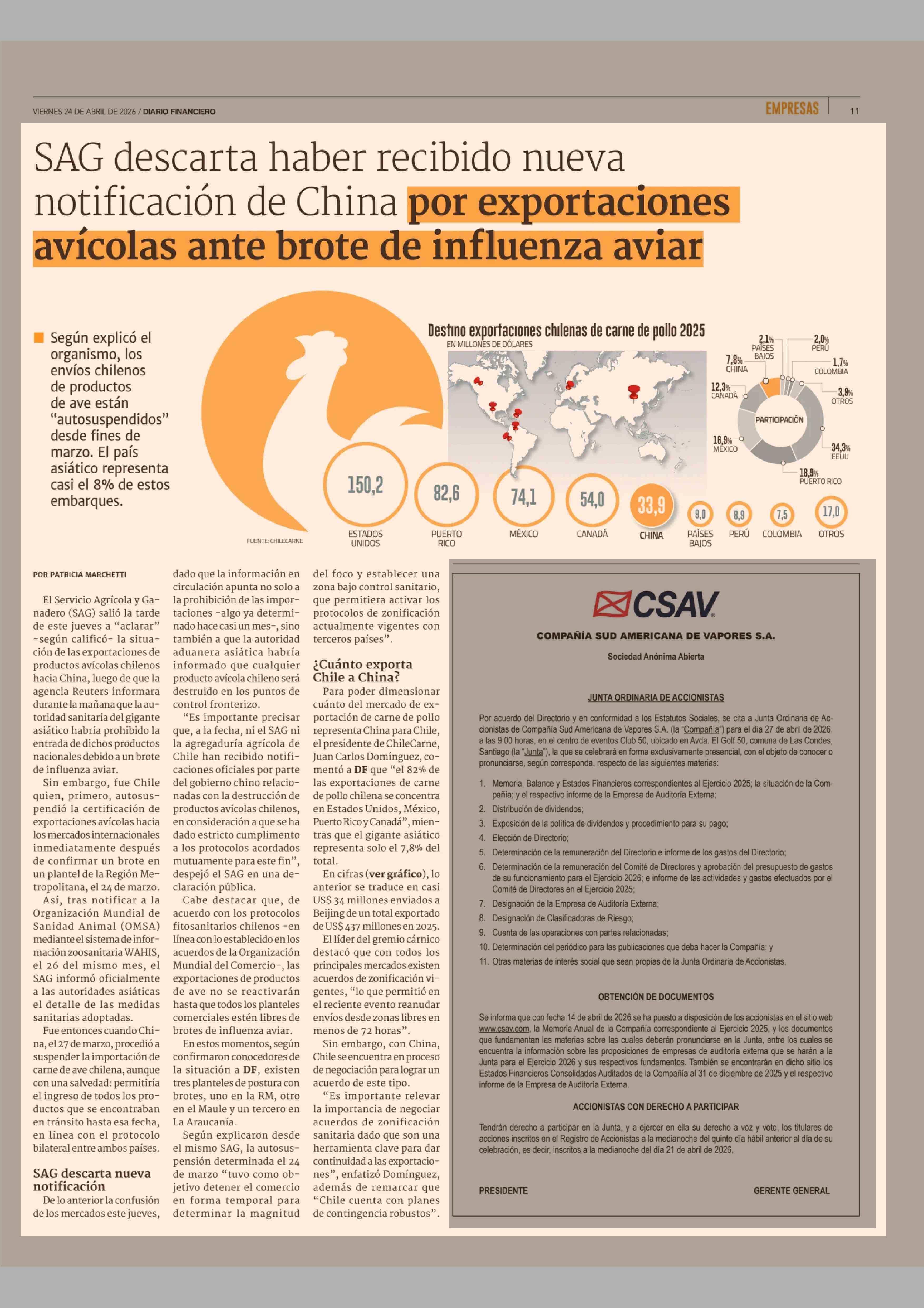 Título: SAG descarta haber recibido nueva notificación de China por exportaciones avícolas ante brote de influenza aviar