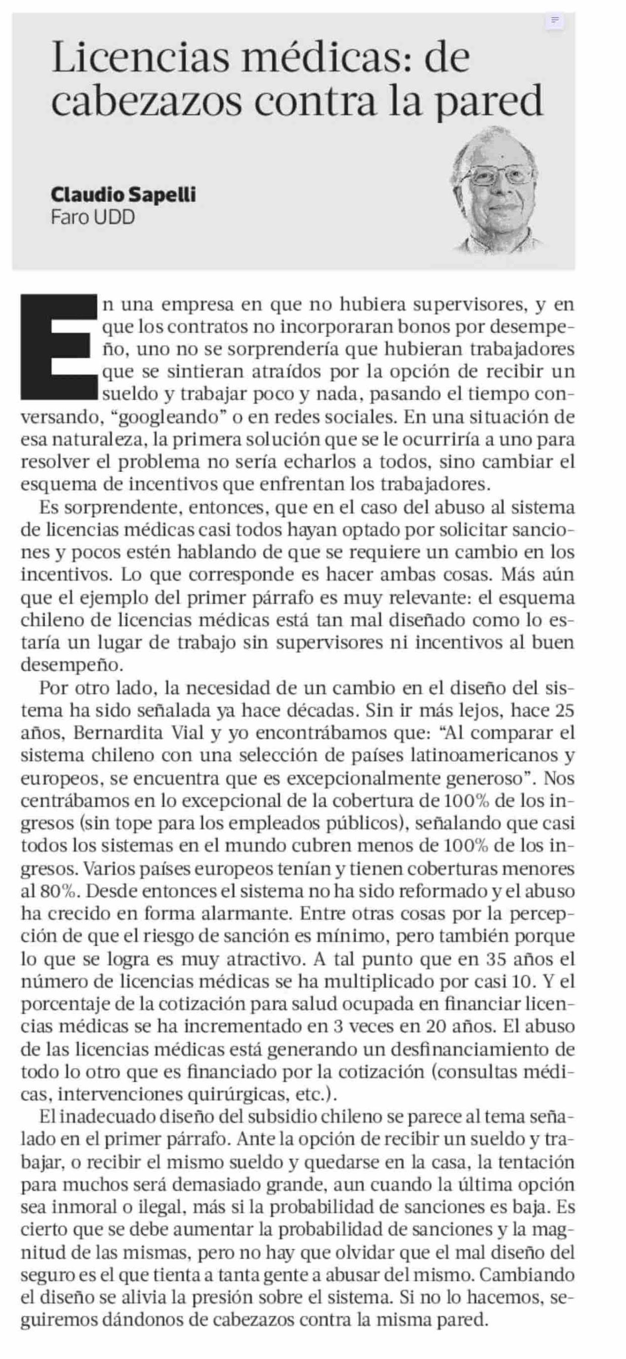 COLUMNAS DE OPINIÓN: Licencias médicas: de cabezazos contra la pared 02-06-2025 La Tercera |