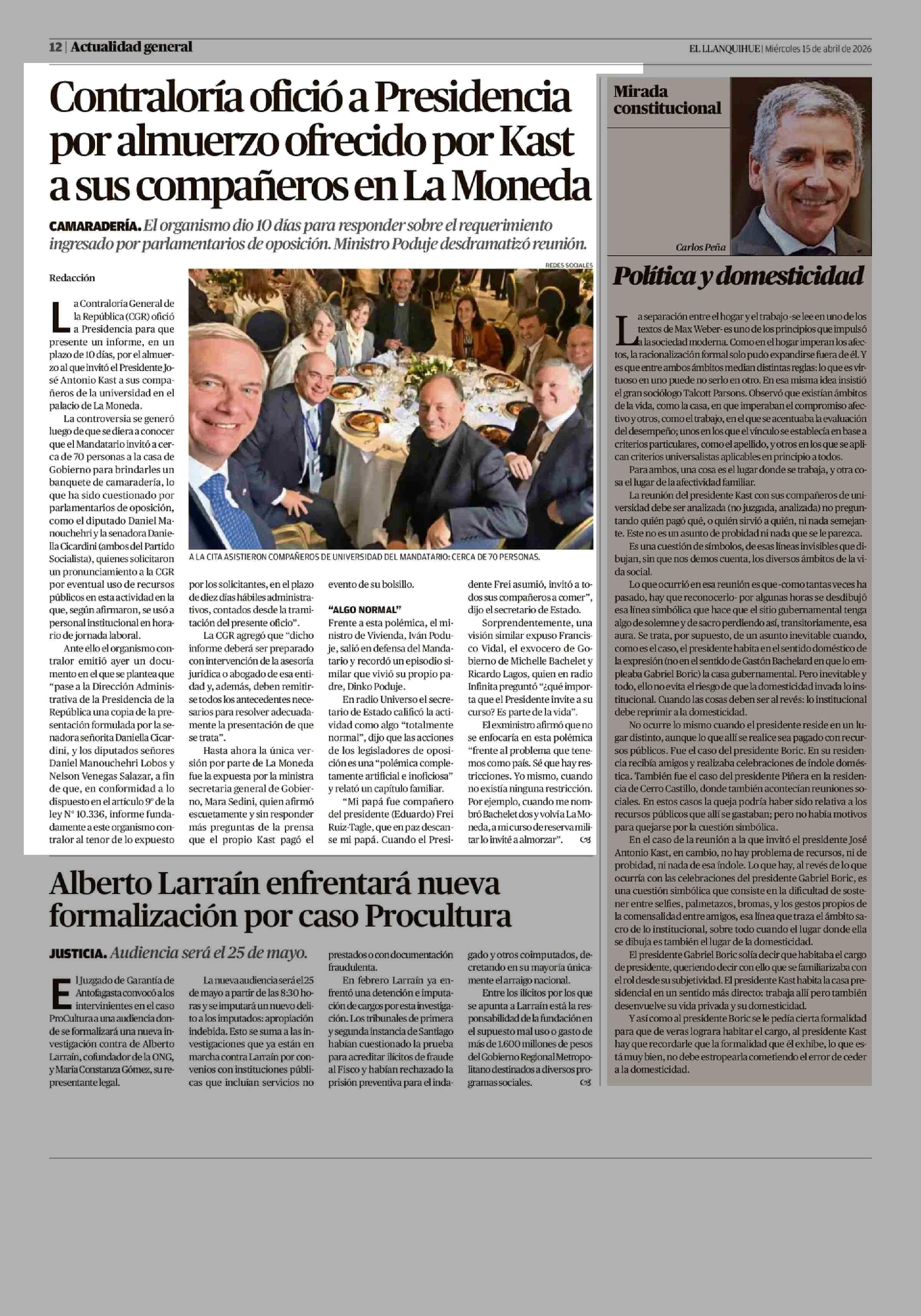 Título: Contraloría ofició a Presidencia por almuerzo ofrecido por Kast a sus compañeros en La Moneda