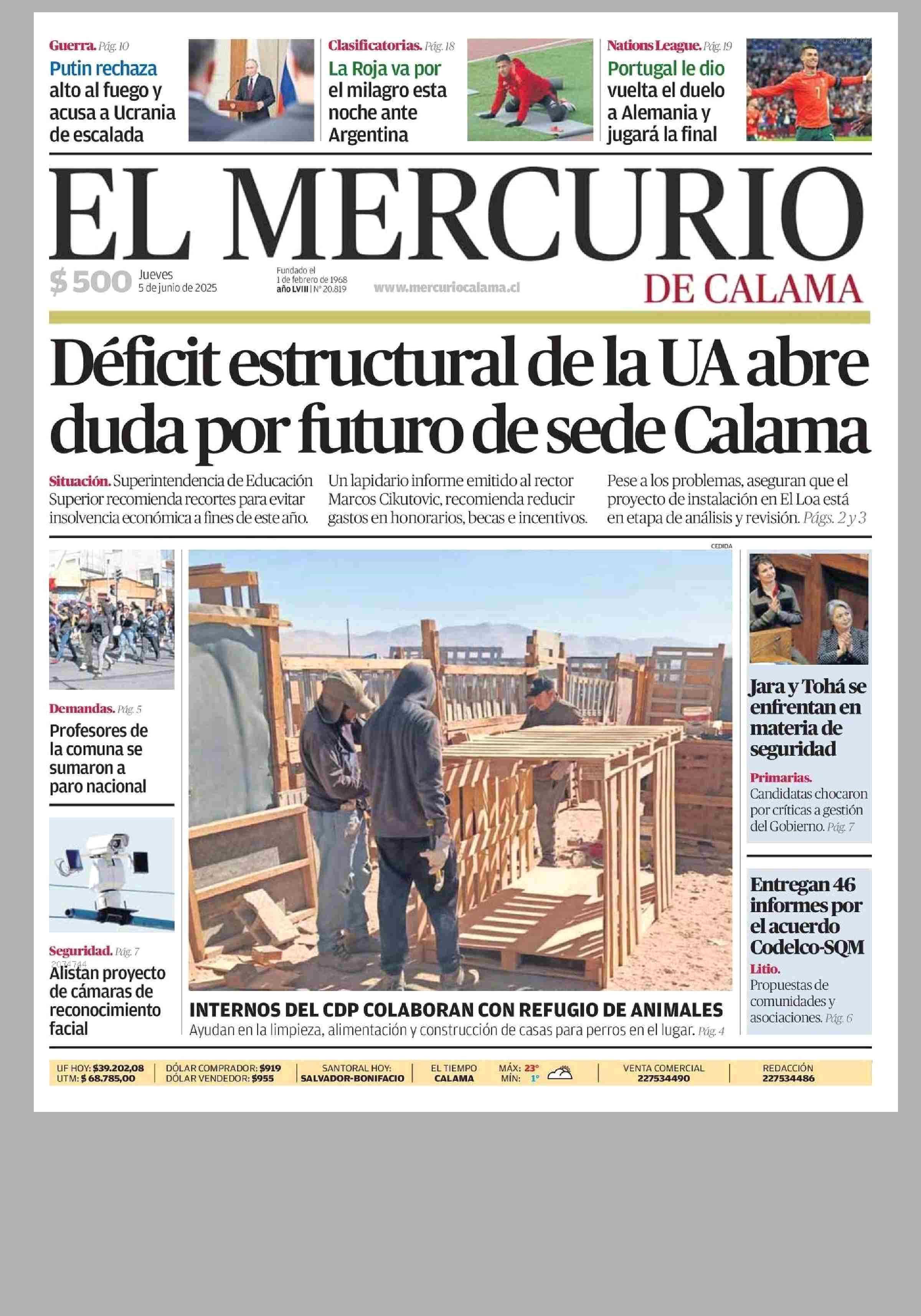 PORTADA EL MERCURIO DE CALAMA - CHILE 05-06-2025 El Mercurio de Calama |