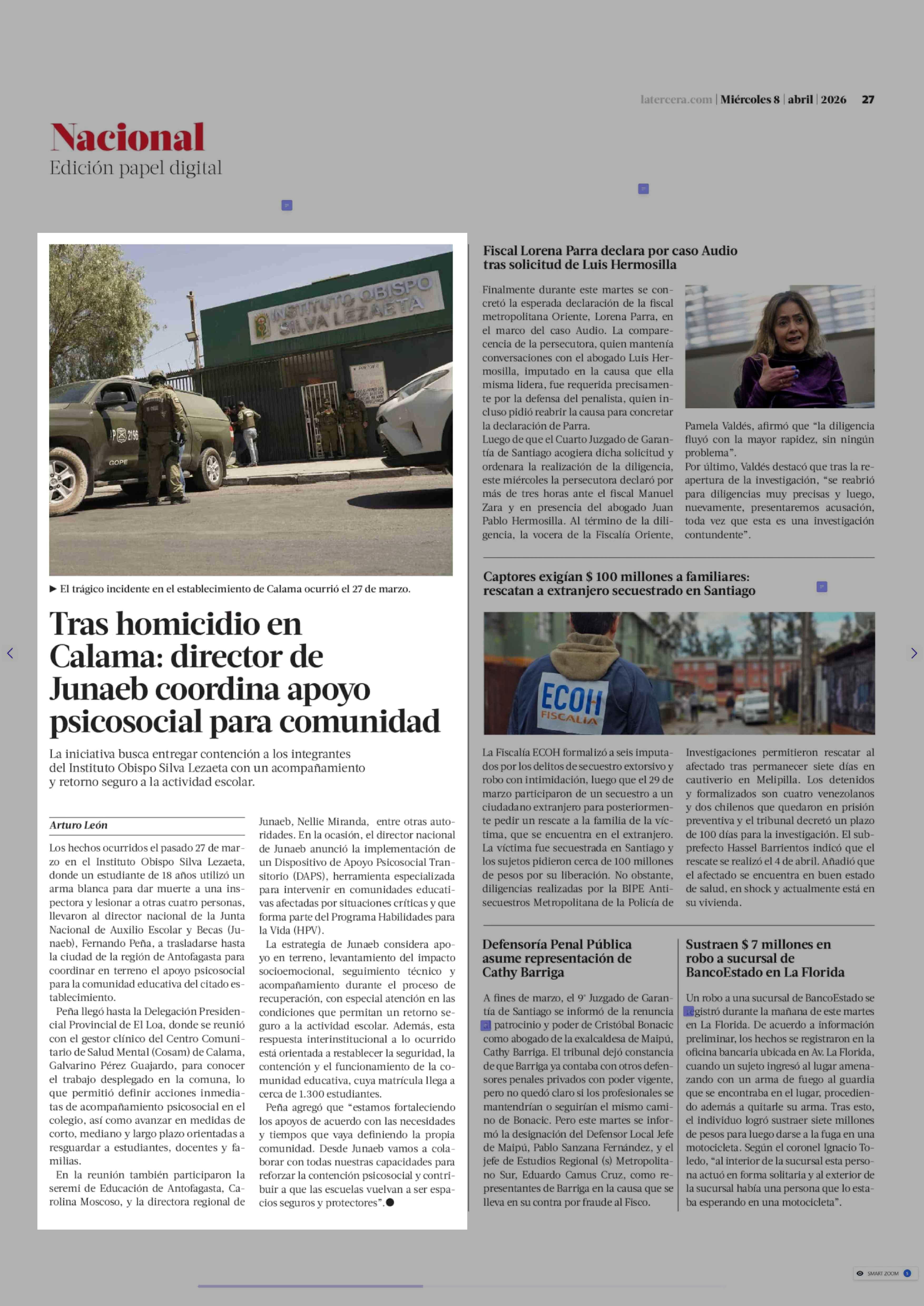 Tras homicidio en Calama: director de Junaeb coordina apoyo psicosocial para comunidad 08-04-2026 La Tercera |