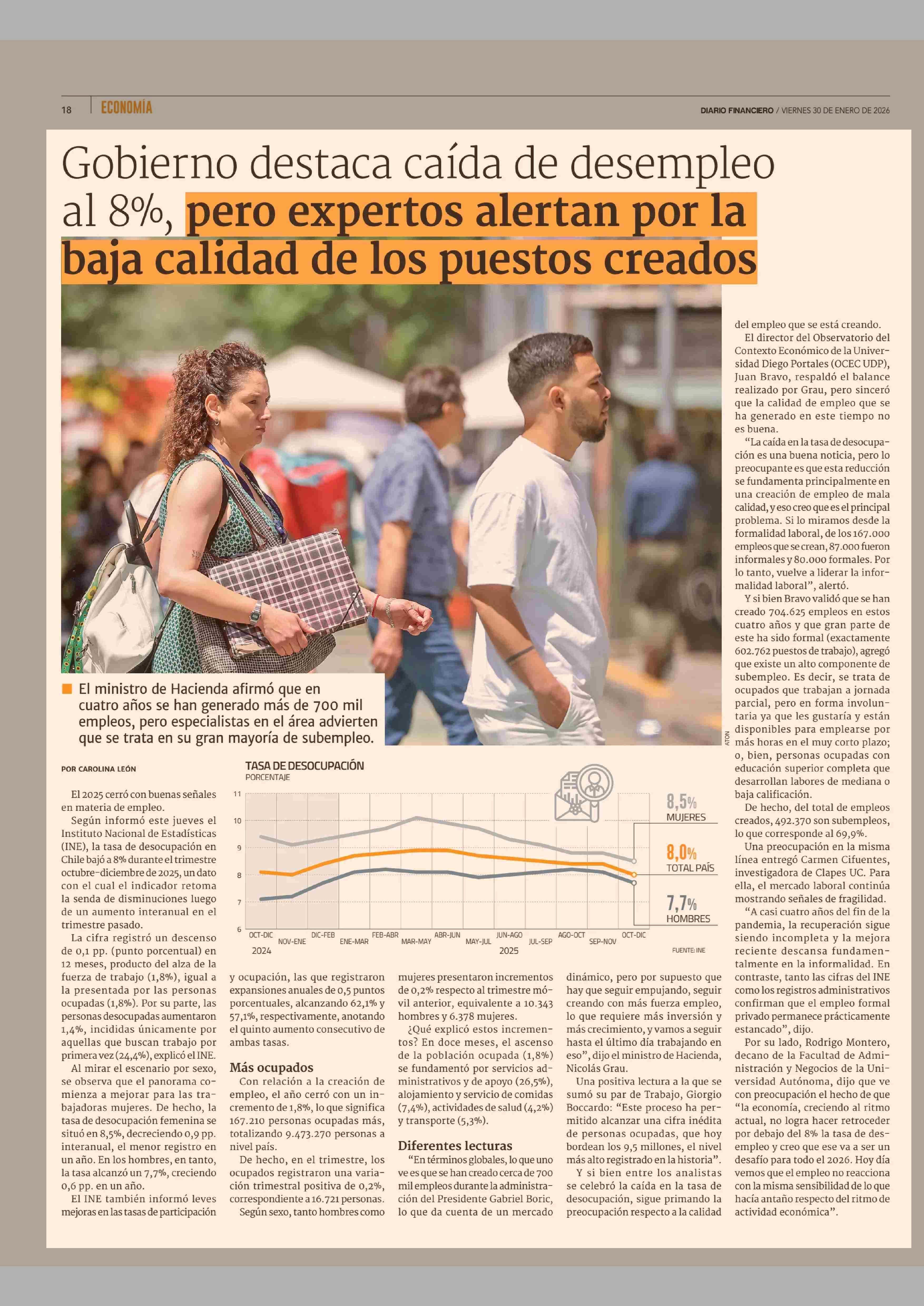 Gobierno destaca caída de desempleo al 8%, pero expertos alertan por la baja calidad de los puestos creados 30-01-2026 Diario Financiero |