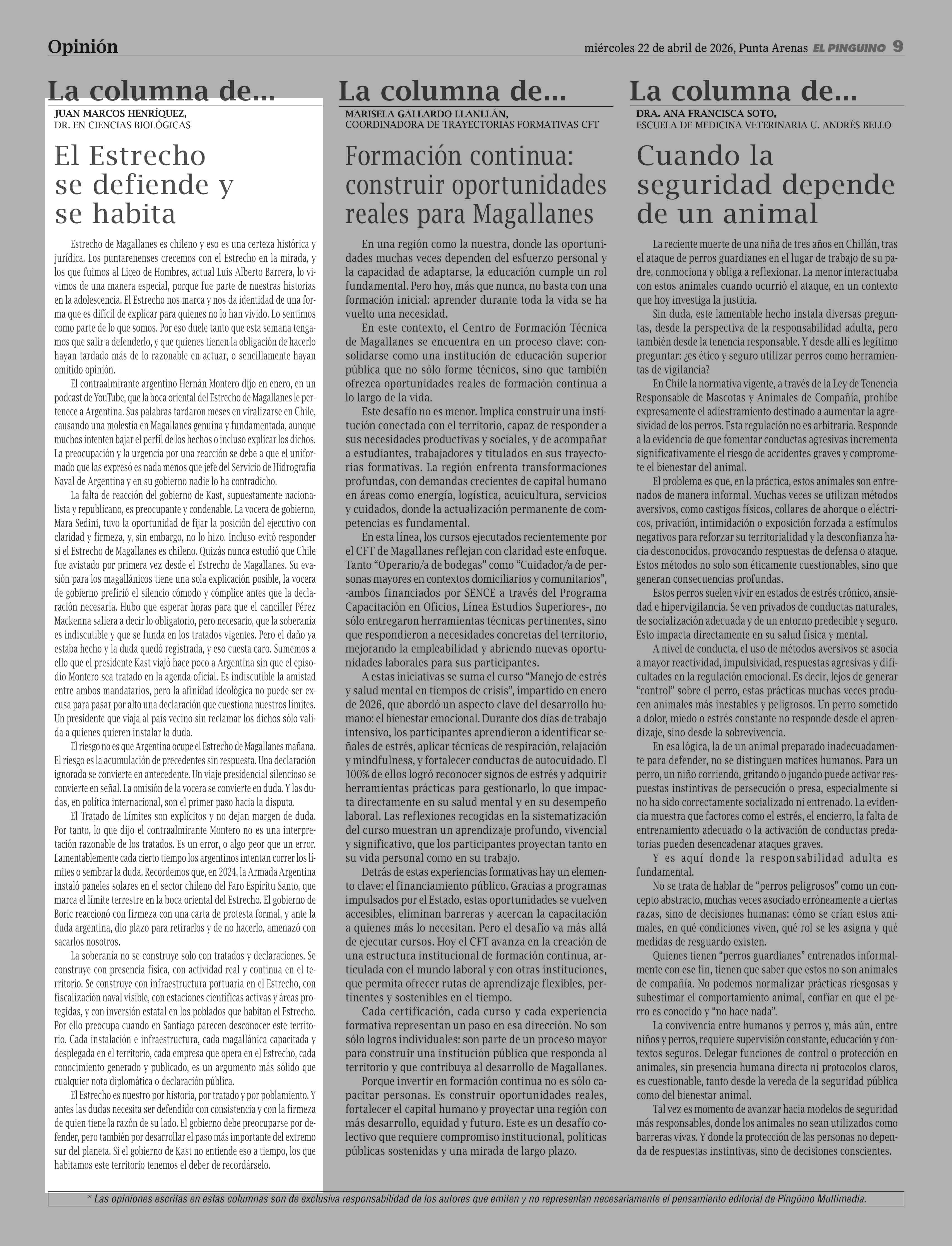Columnas de Opinión: El Estrecho se defiende y se habita 22-04-2026 El Pingüino |