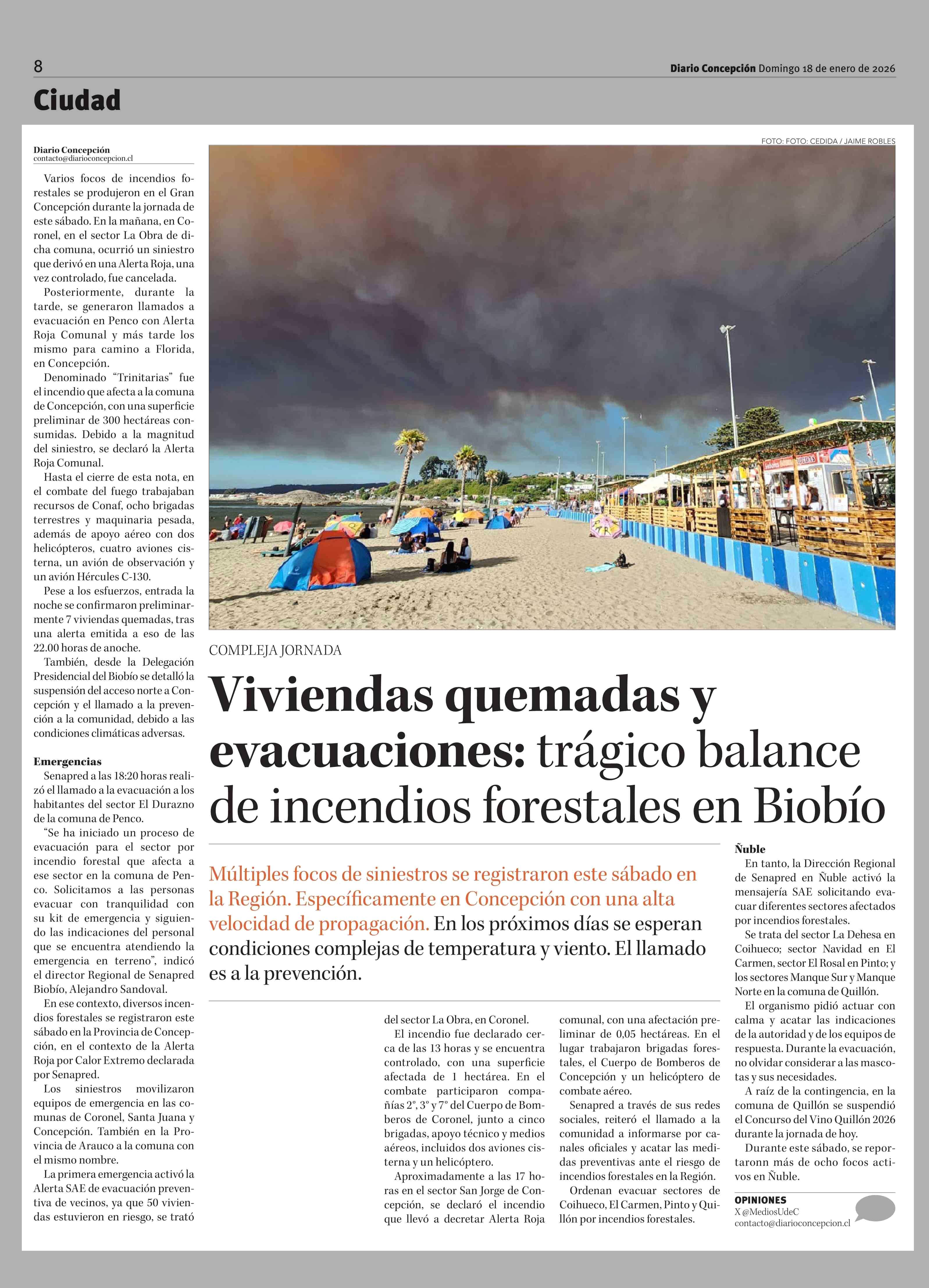 Viviendas quemadas y evacuaciones: trágico balance de incendios forestales en Biobío 18-01-2026 Diario Concepción |