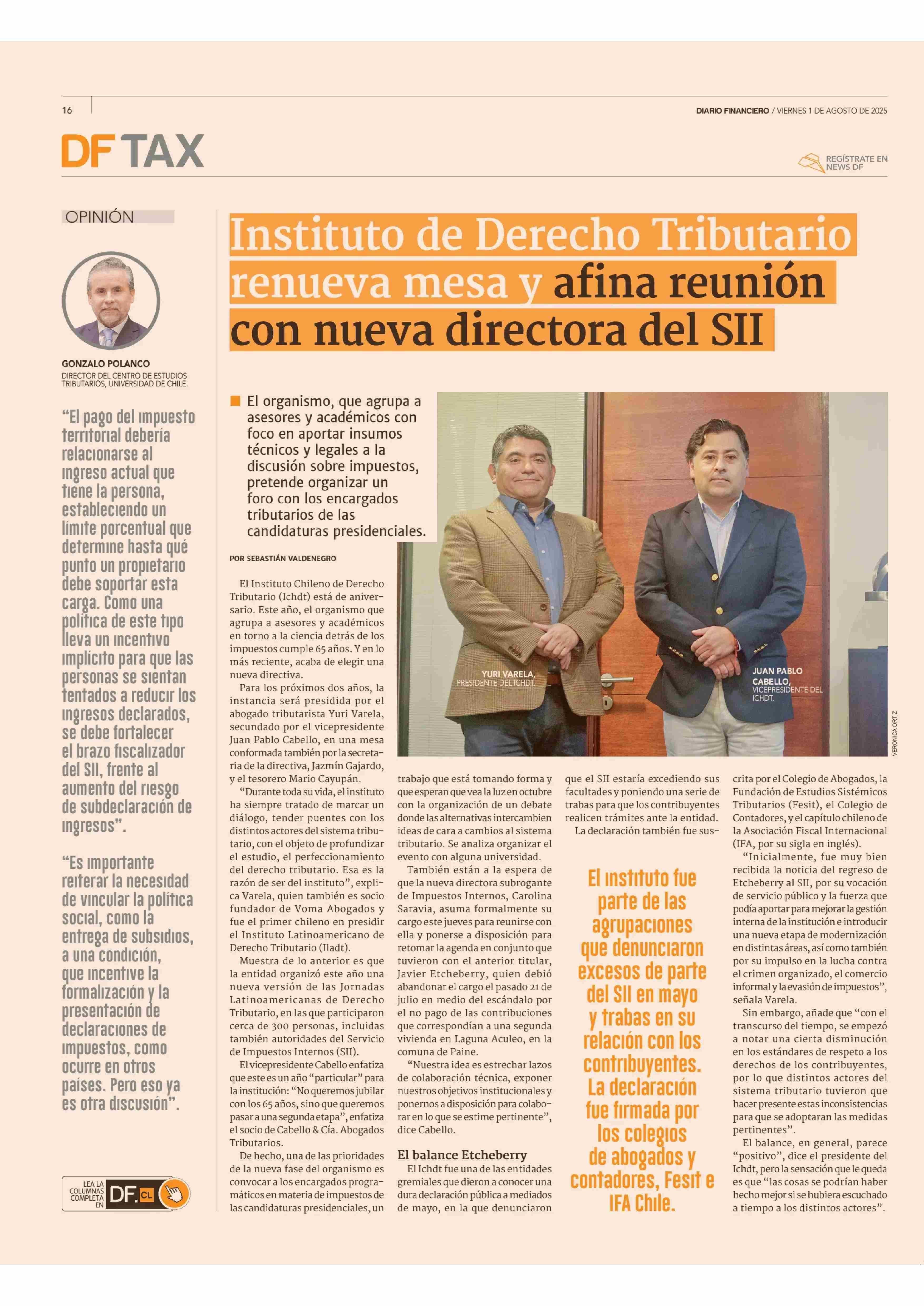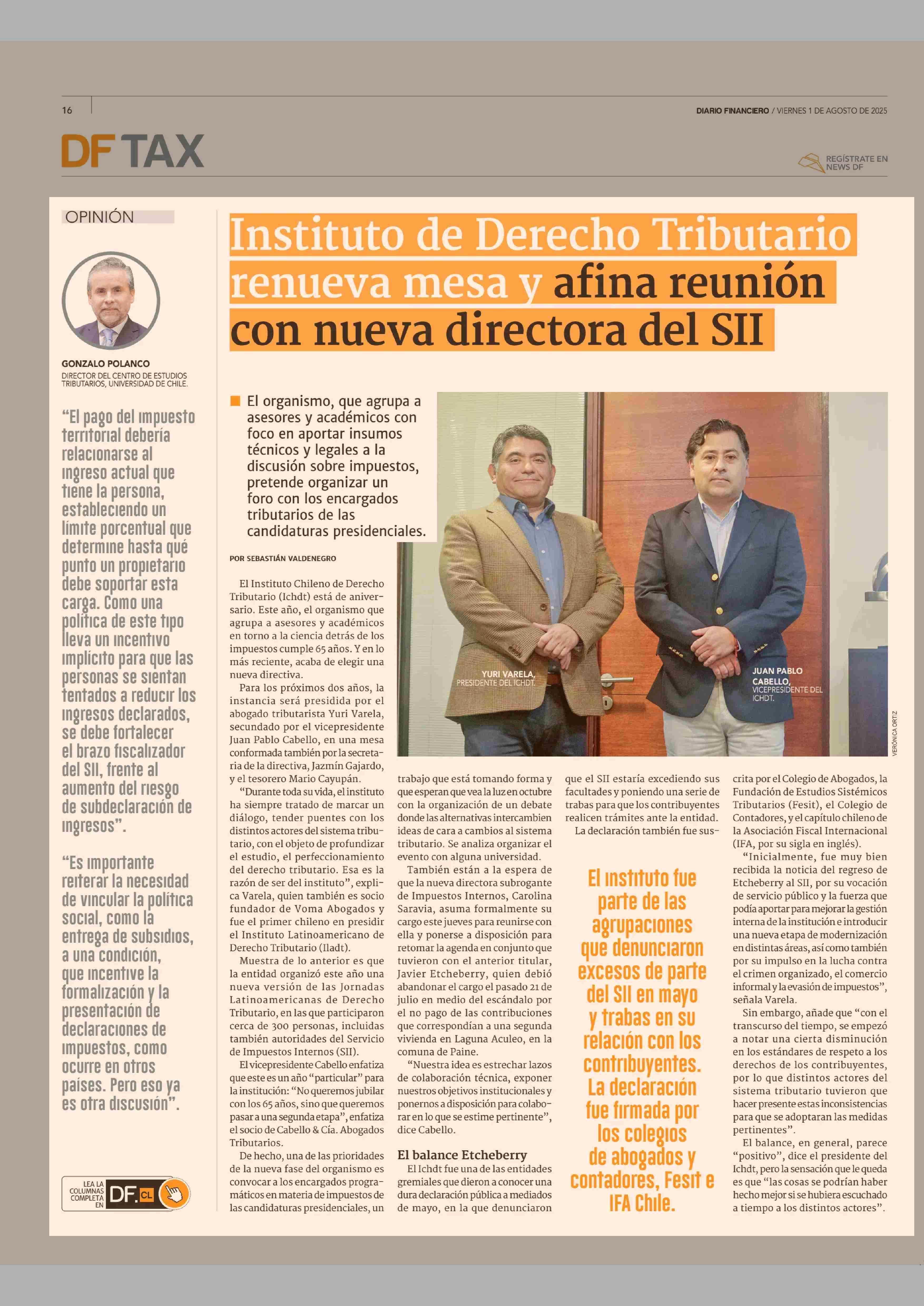 Instituto de Derecho Tributario renueva mesa y afina reunión con nueva directora del SII 01-08-2025 Diario Financiero |