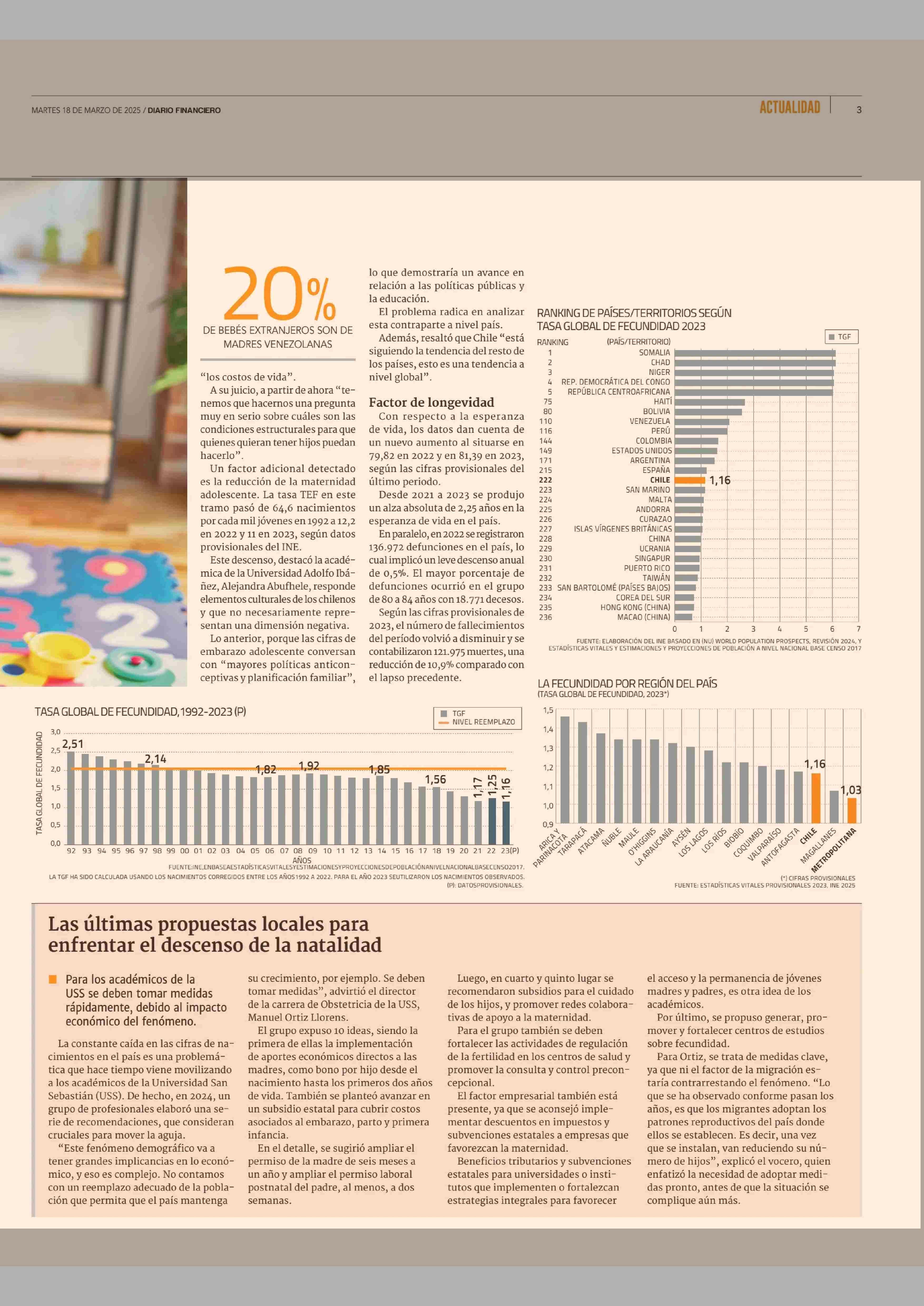 La fecundidad en Chile cae a mínimo histórico y el país queda en la parte baja de ranking mundial 18-03-2025 Diario Financiero |