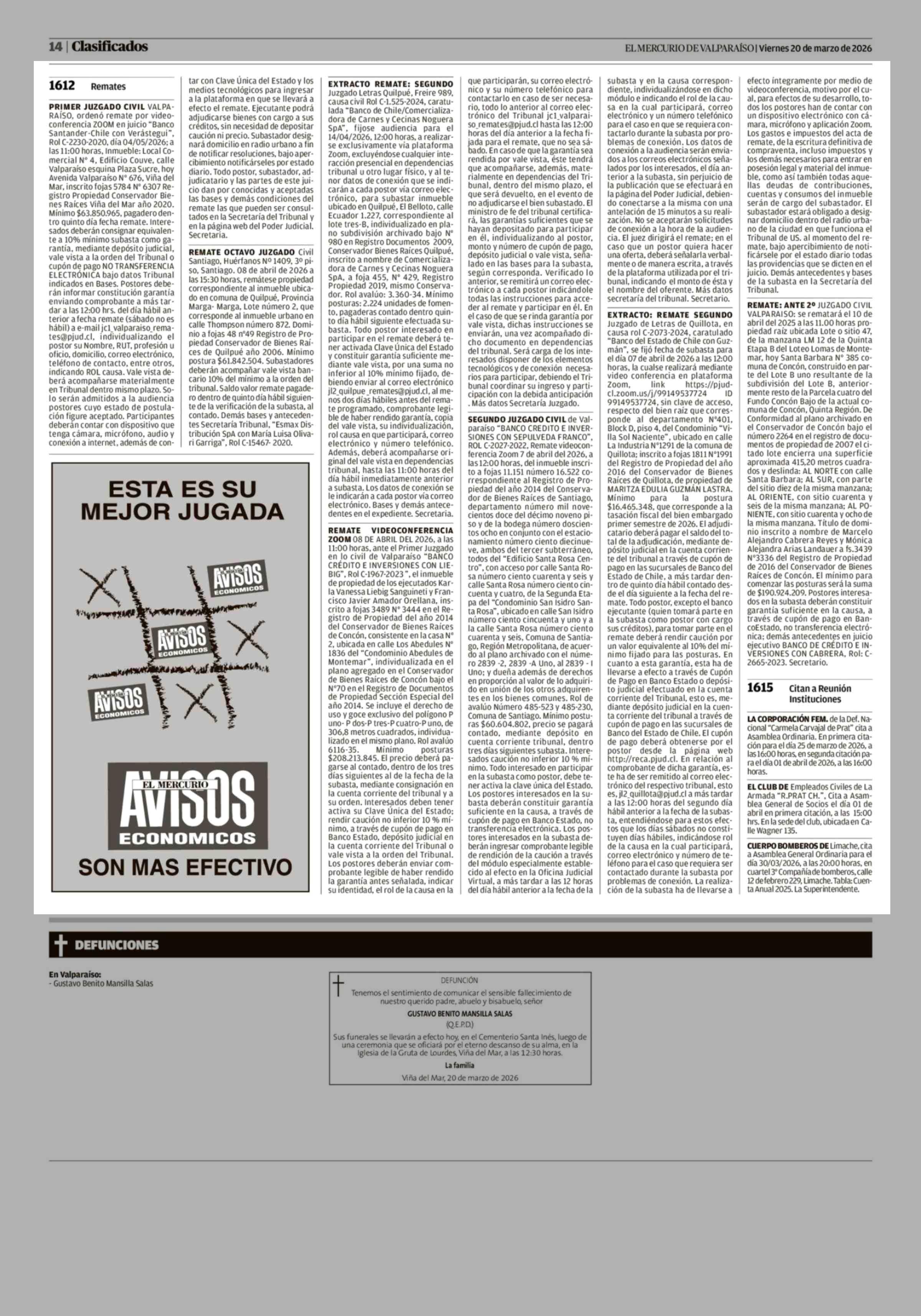 Remates: Remates 20-03-2026 El Mercurio de Valparaíso |