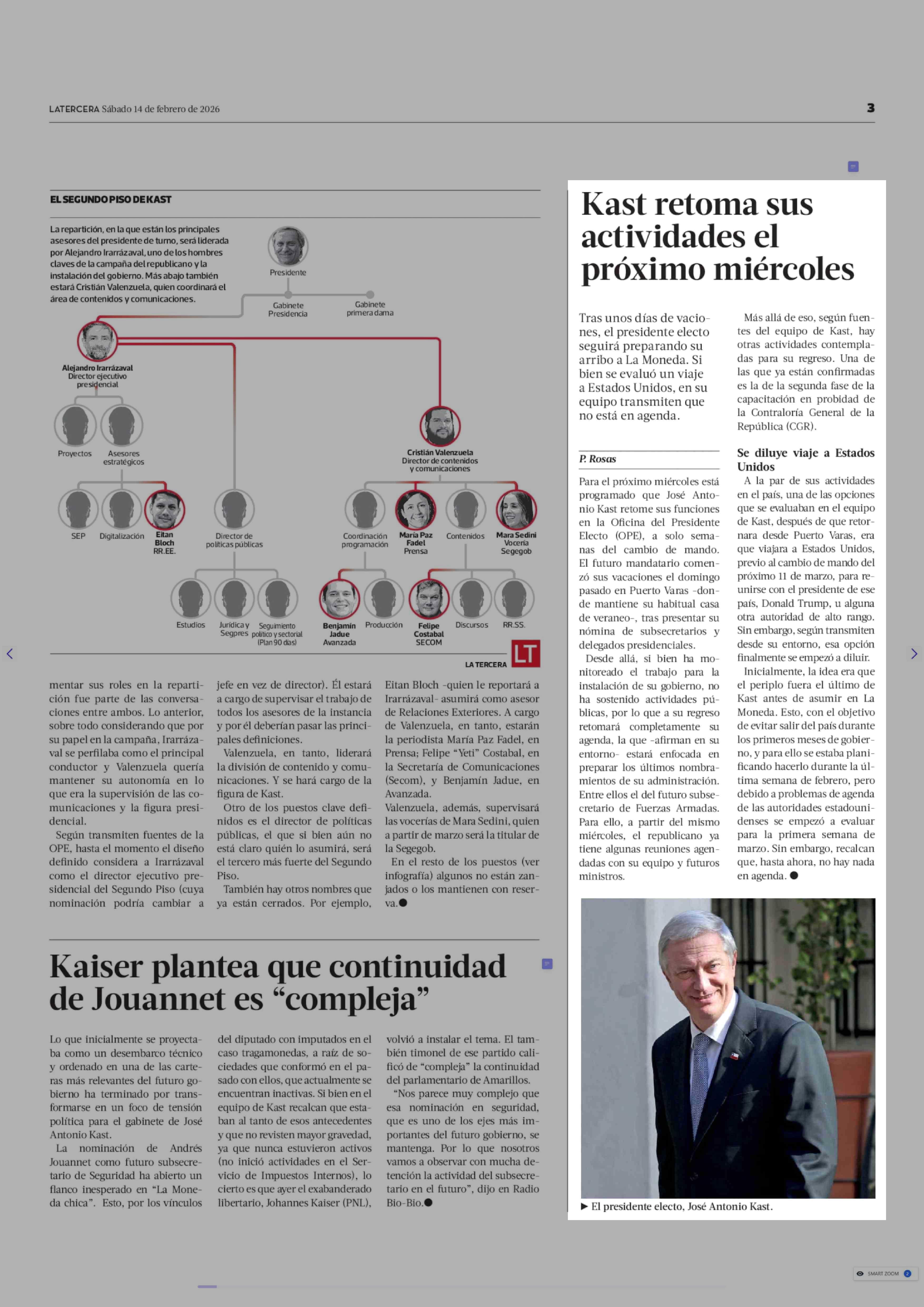 Kast retoma sus actividades el próximo miércoles 14-02-2026 La Tercera |
