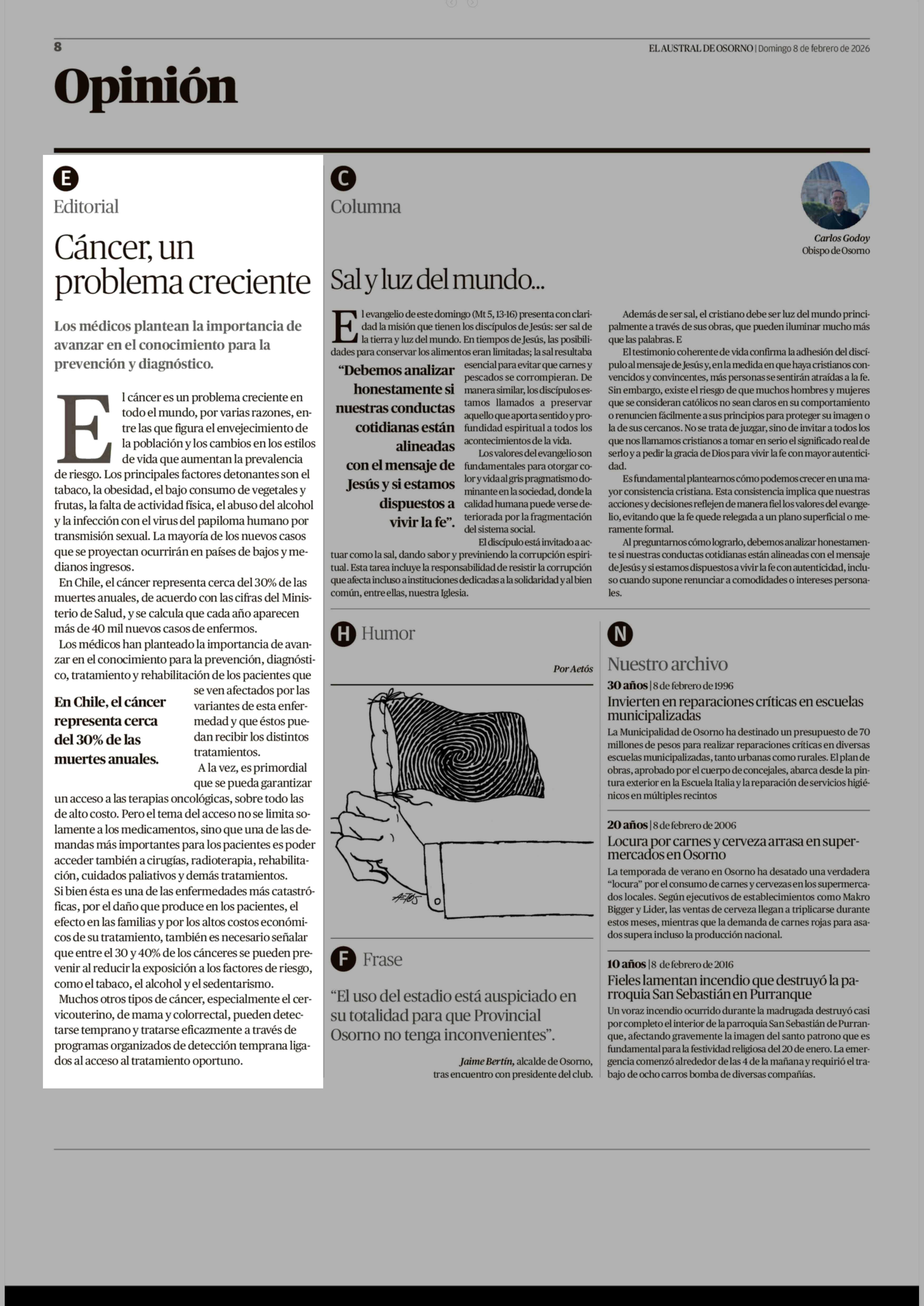 Editorial: Cáncer, un problema creciente 08-02-2026 El Austral de Osorno |
