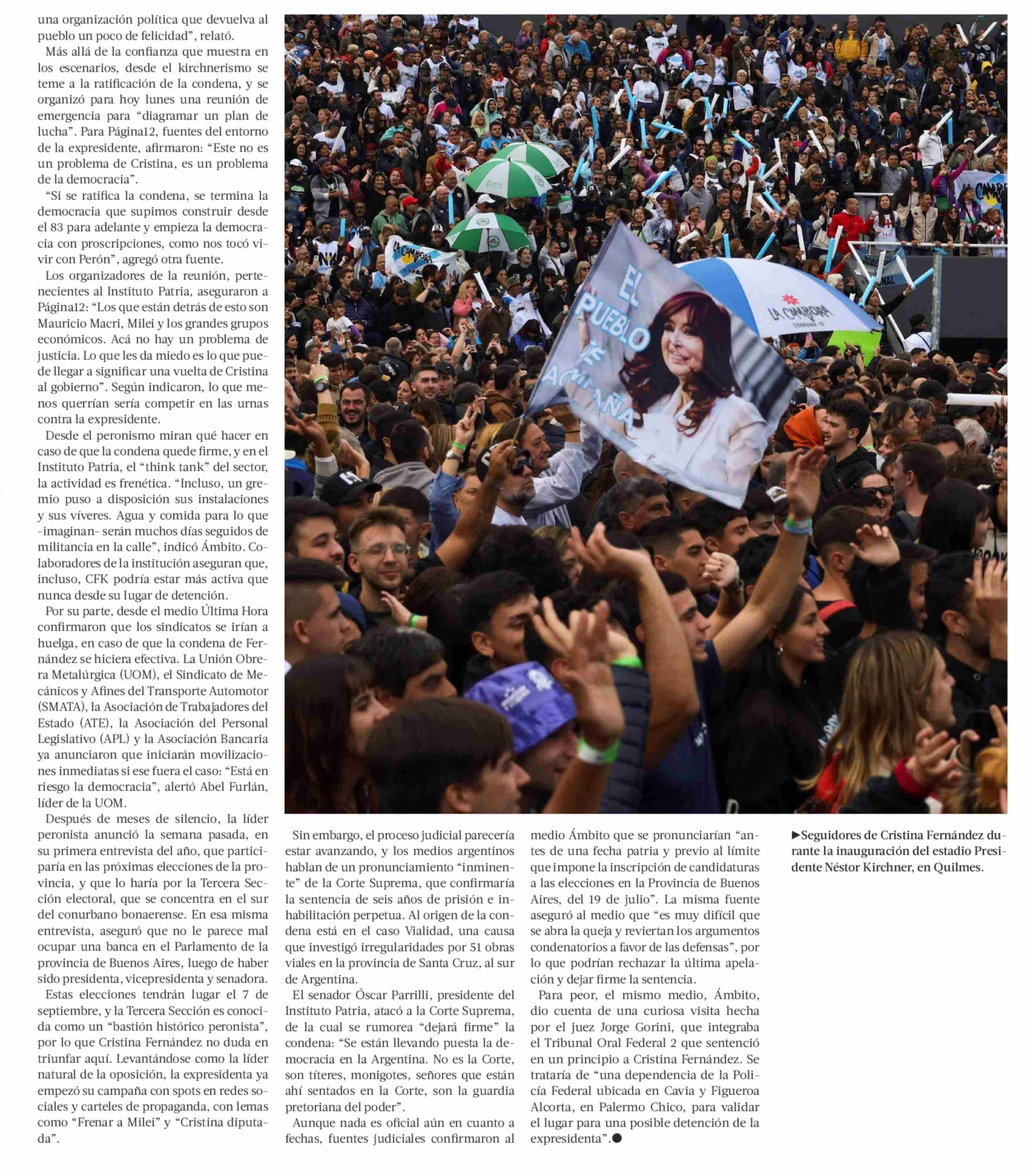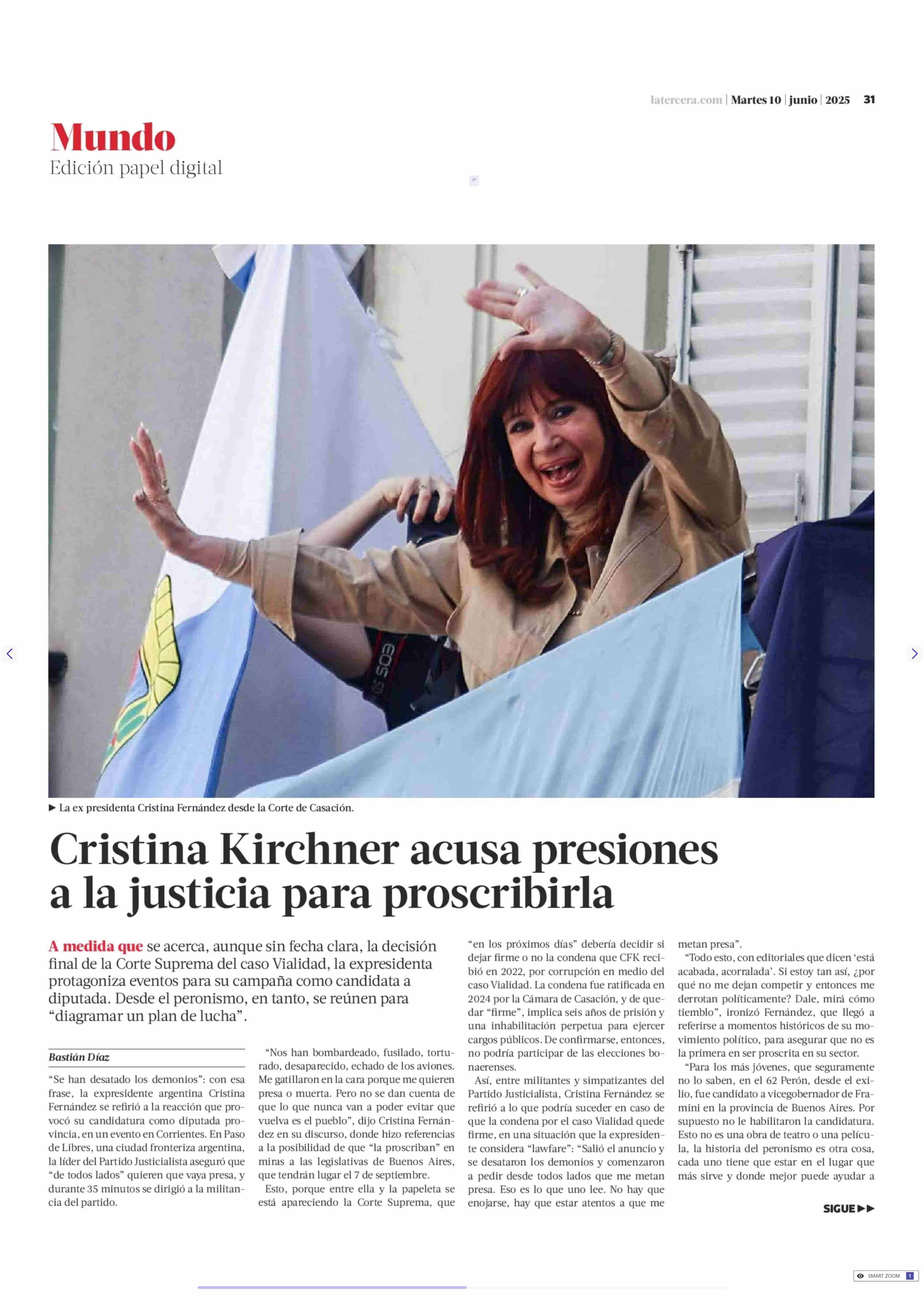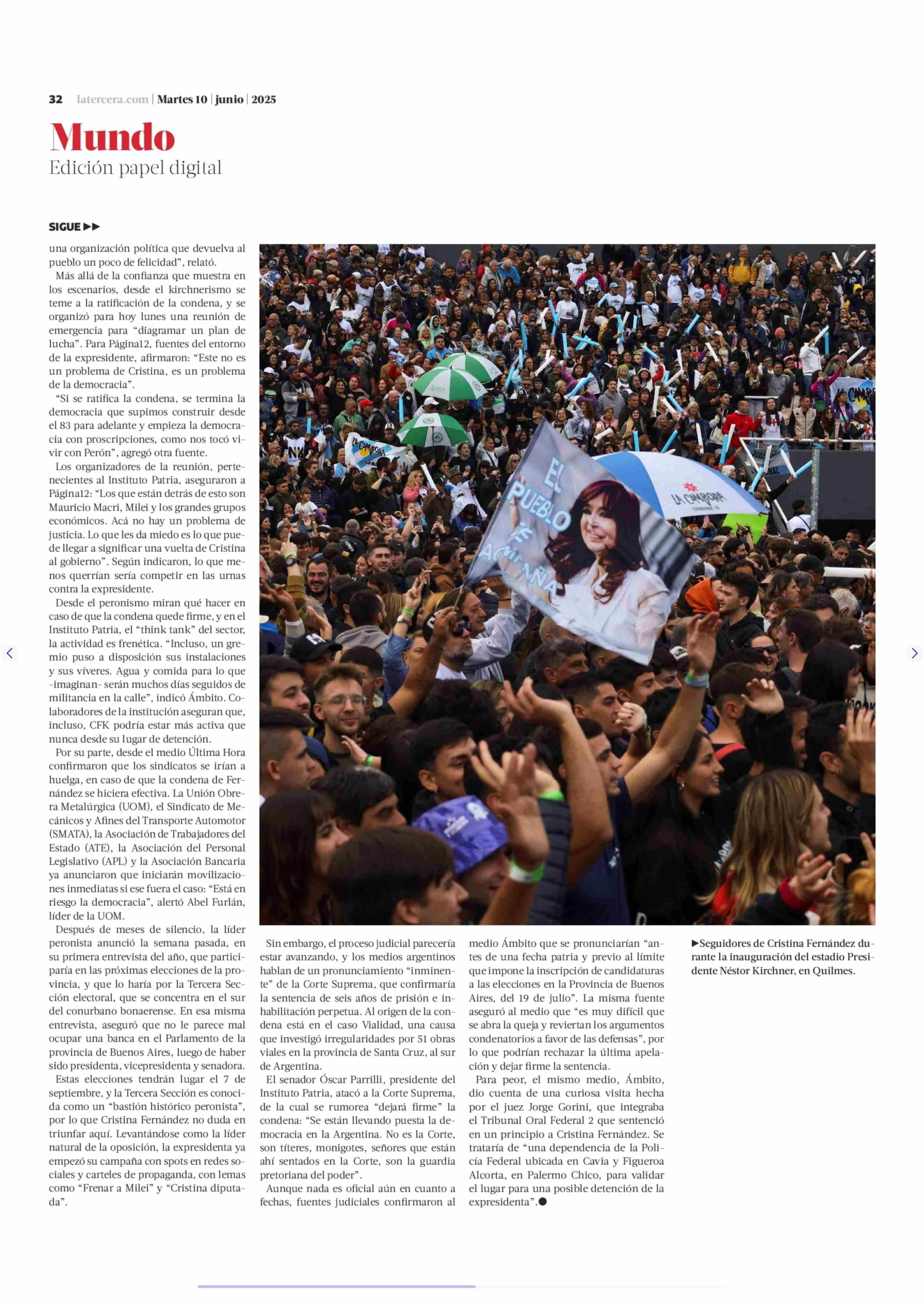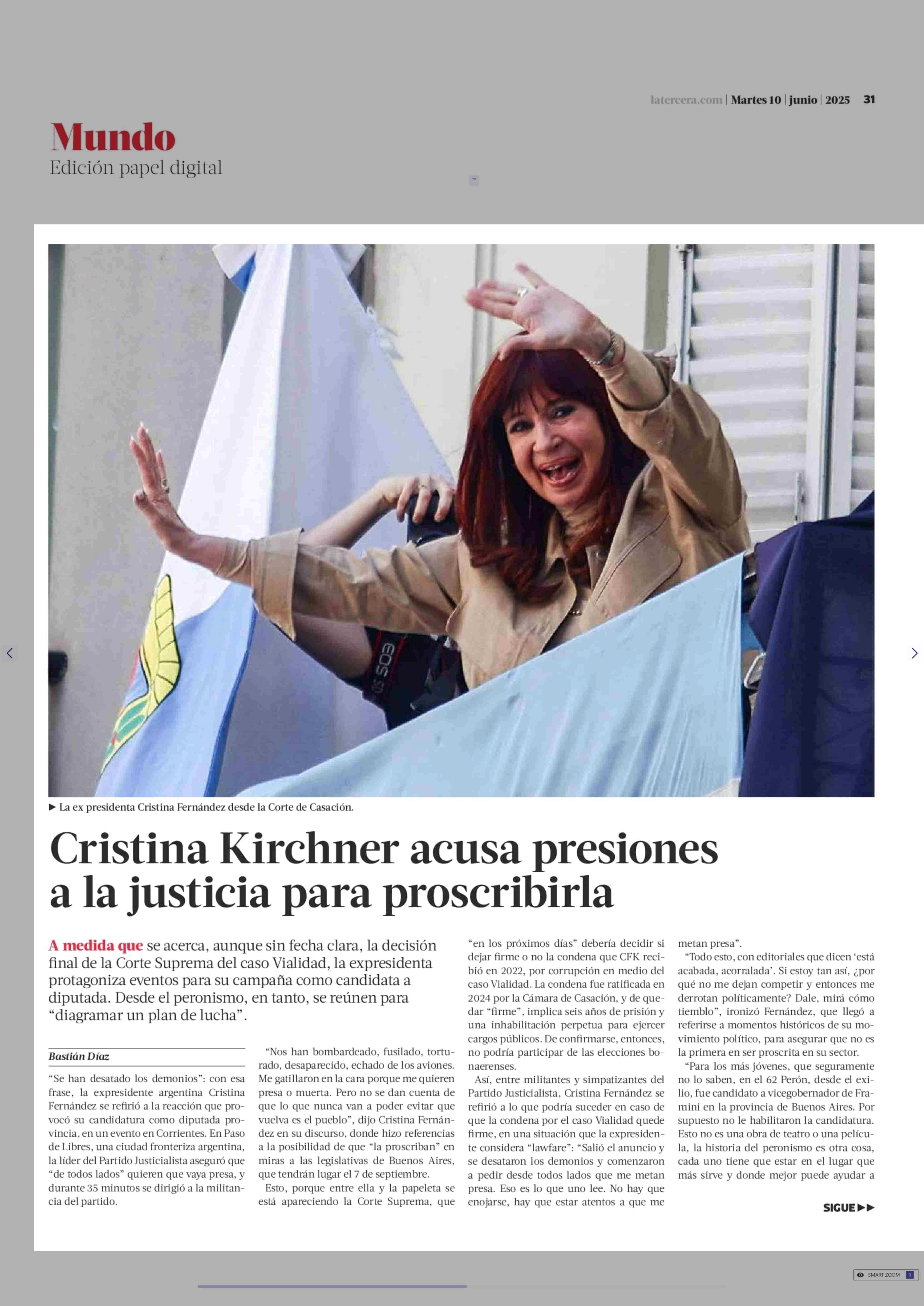 Cristina Kirchner acusa presiones a la justicia para proscribirla 10-06-2025 La Tercera |