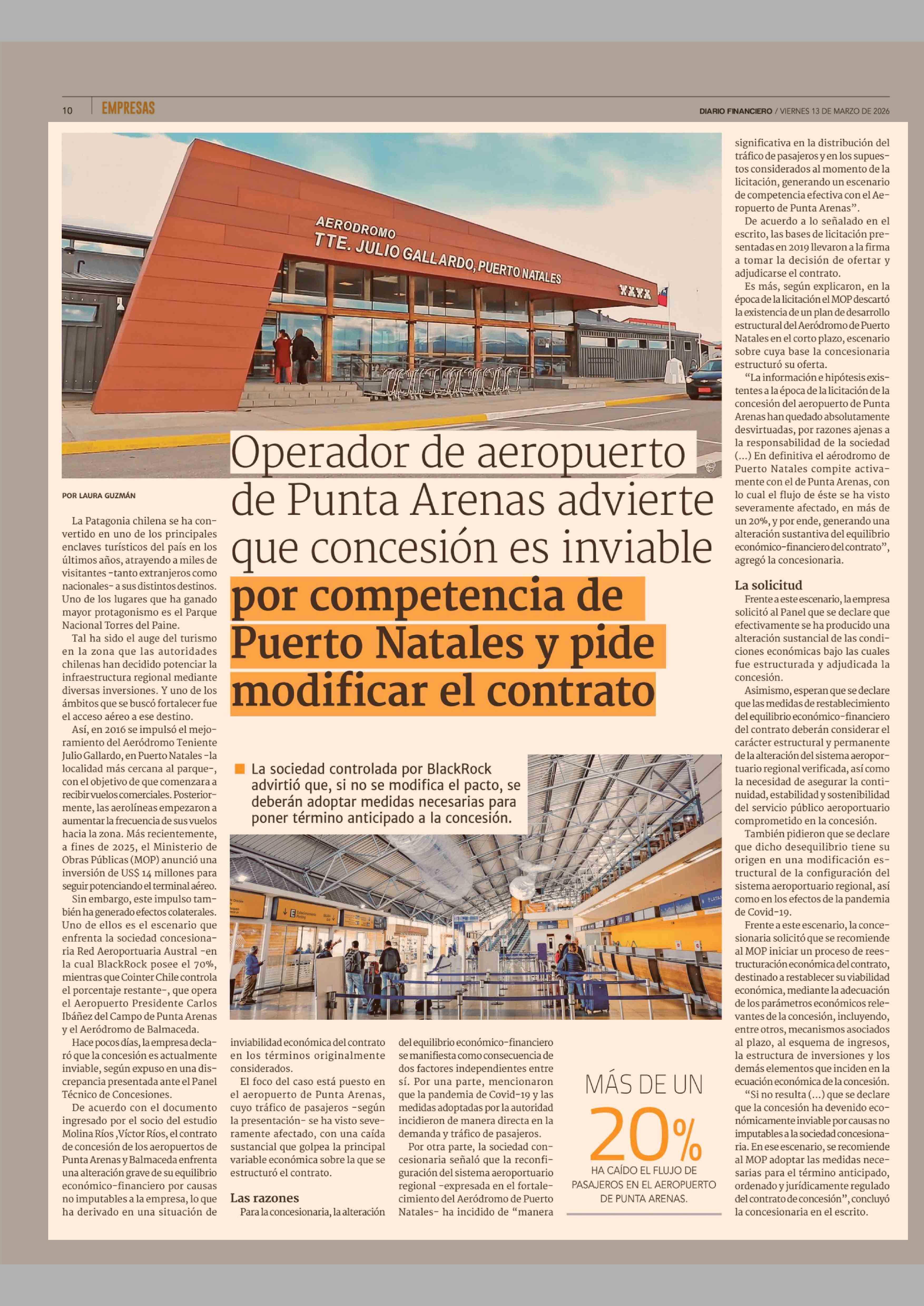 Título: Operador de aeropuerto de Punta Arenas advierte que concesión es inviable por competencia de Puerto Natales y pide modificar el contrato
