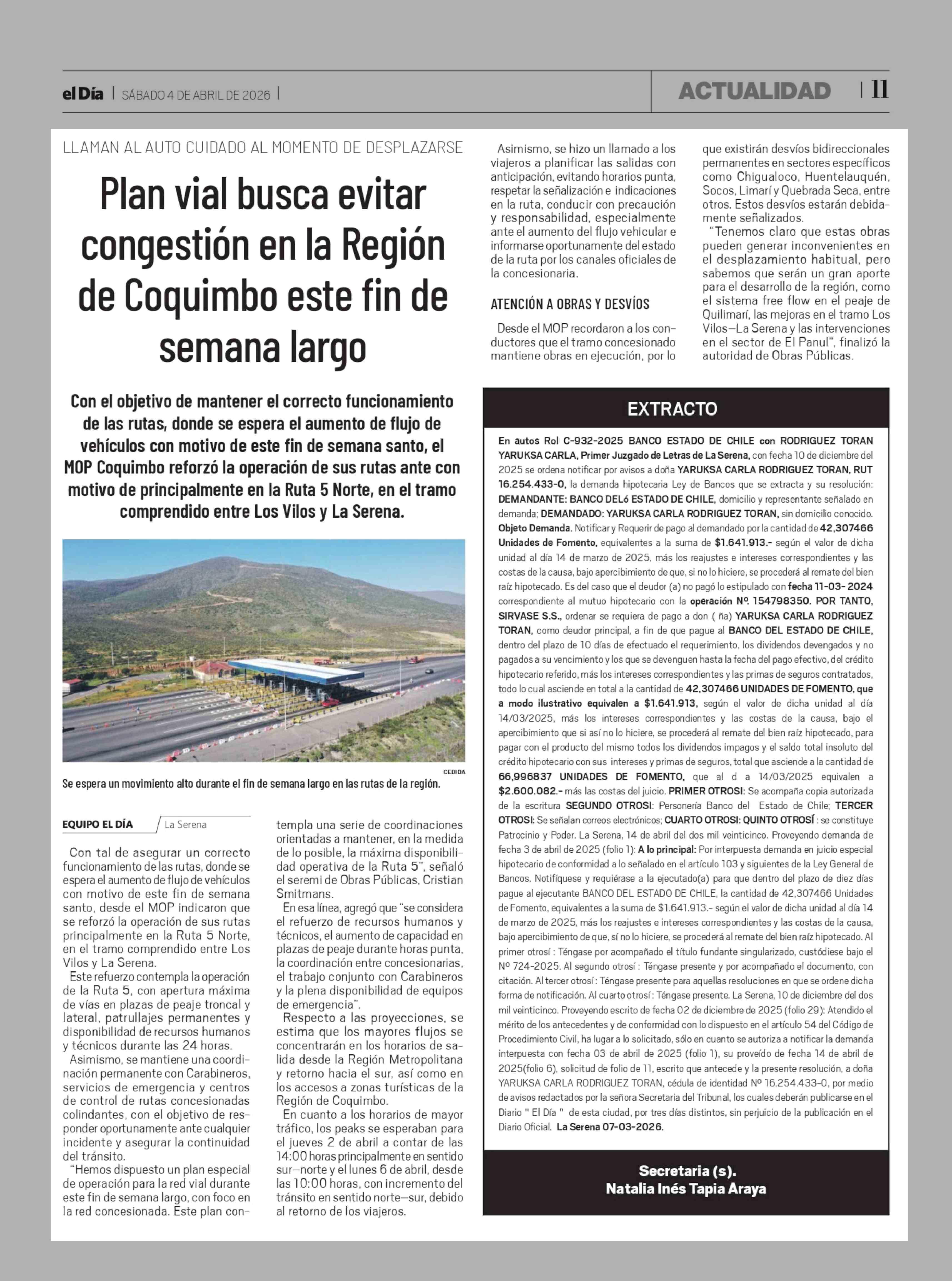 Plan vial busca evitar congestión en la Región de Coquimbo este fin de semana largo 04-04-2026 El Día |