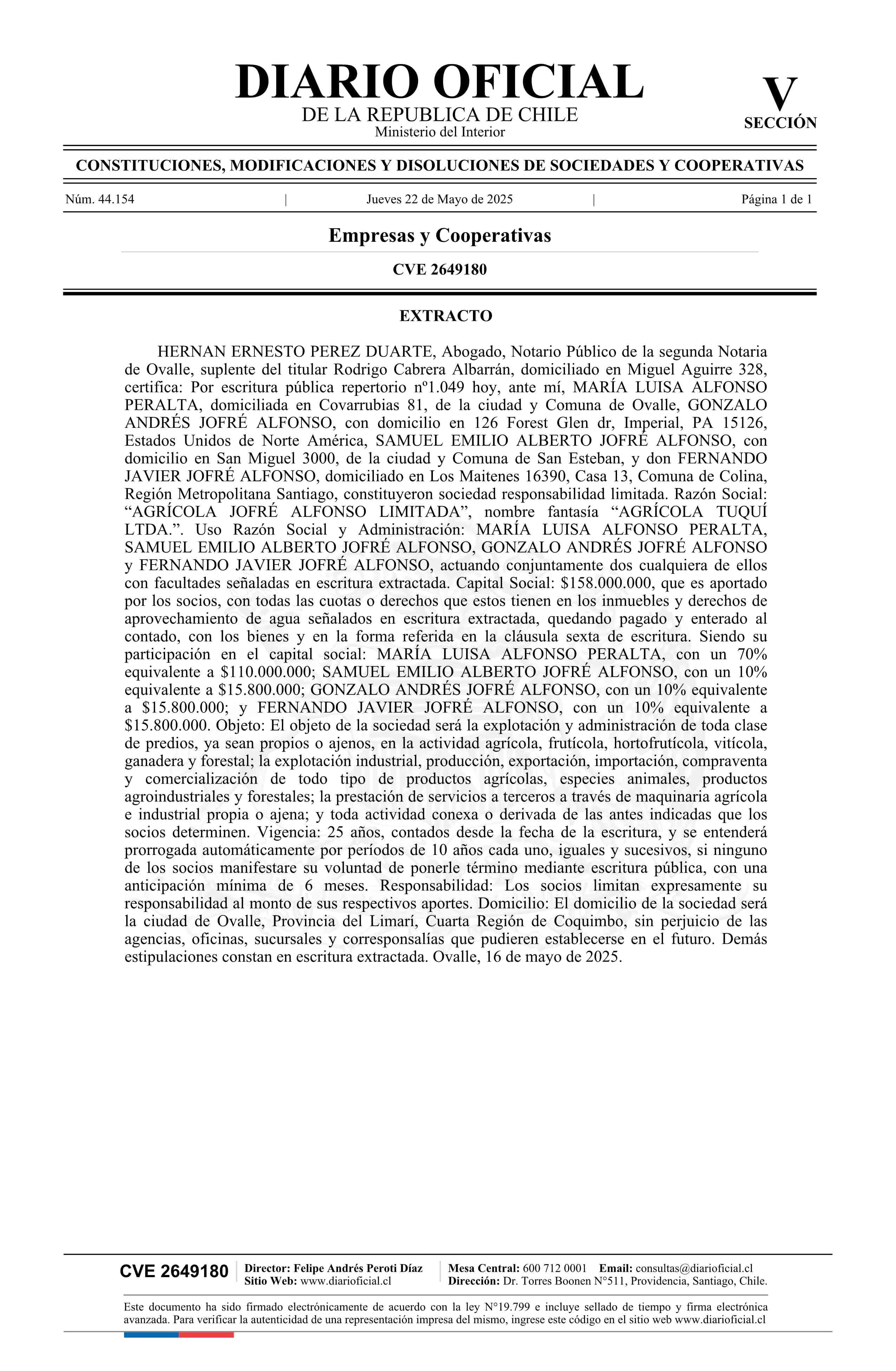 AGRÍCOLA JOFRÉ ALFONSO LIMITADA 22-05-2025 Diario Oficial Edición Electrónica |