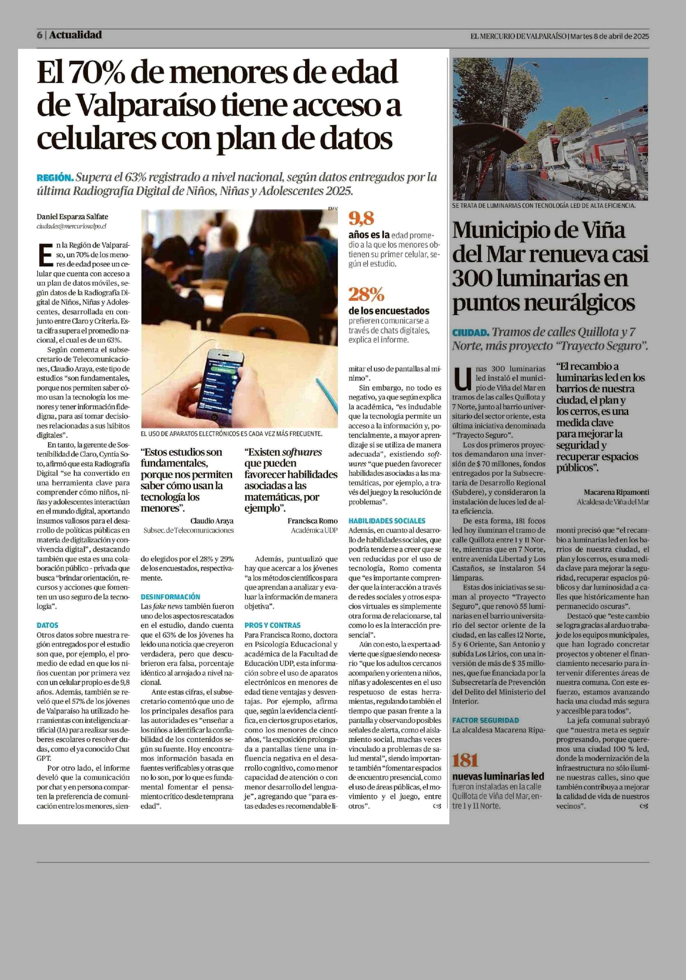 El 70% de menores de edad de Valparaíso tiene acceso a celulares con plan de datos 08-04-2025 El Mercurio de Valparaíso |