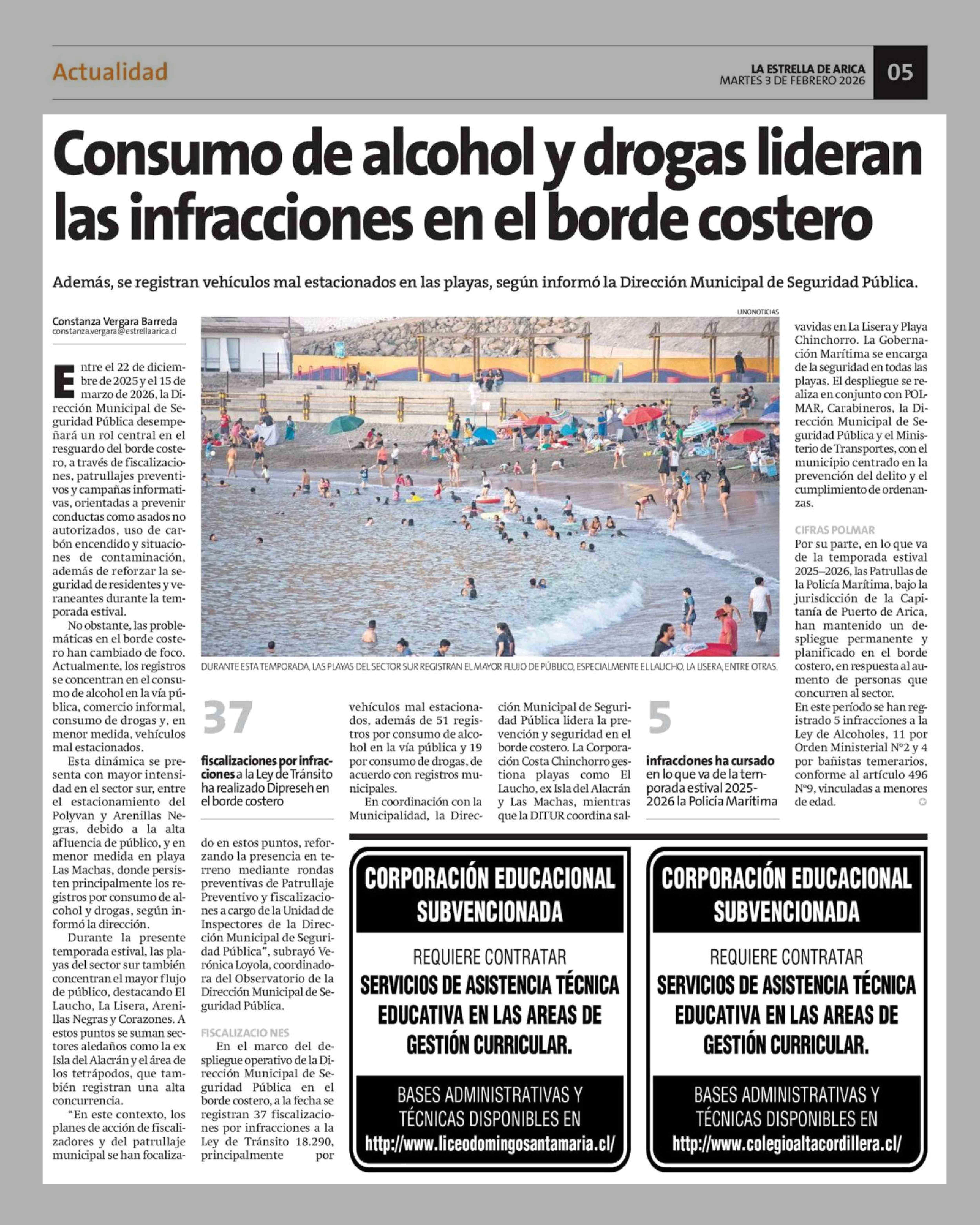 Consumo de alcohol y drogas lideran las infracciones en el borde costero 03-02-2026 La Estrella de Arica |