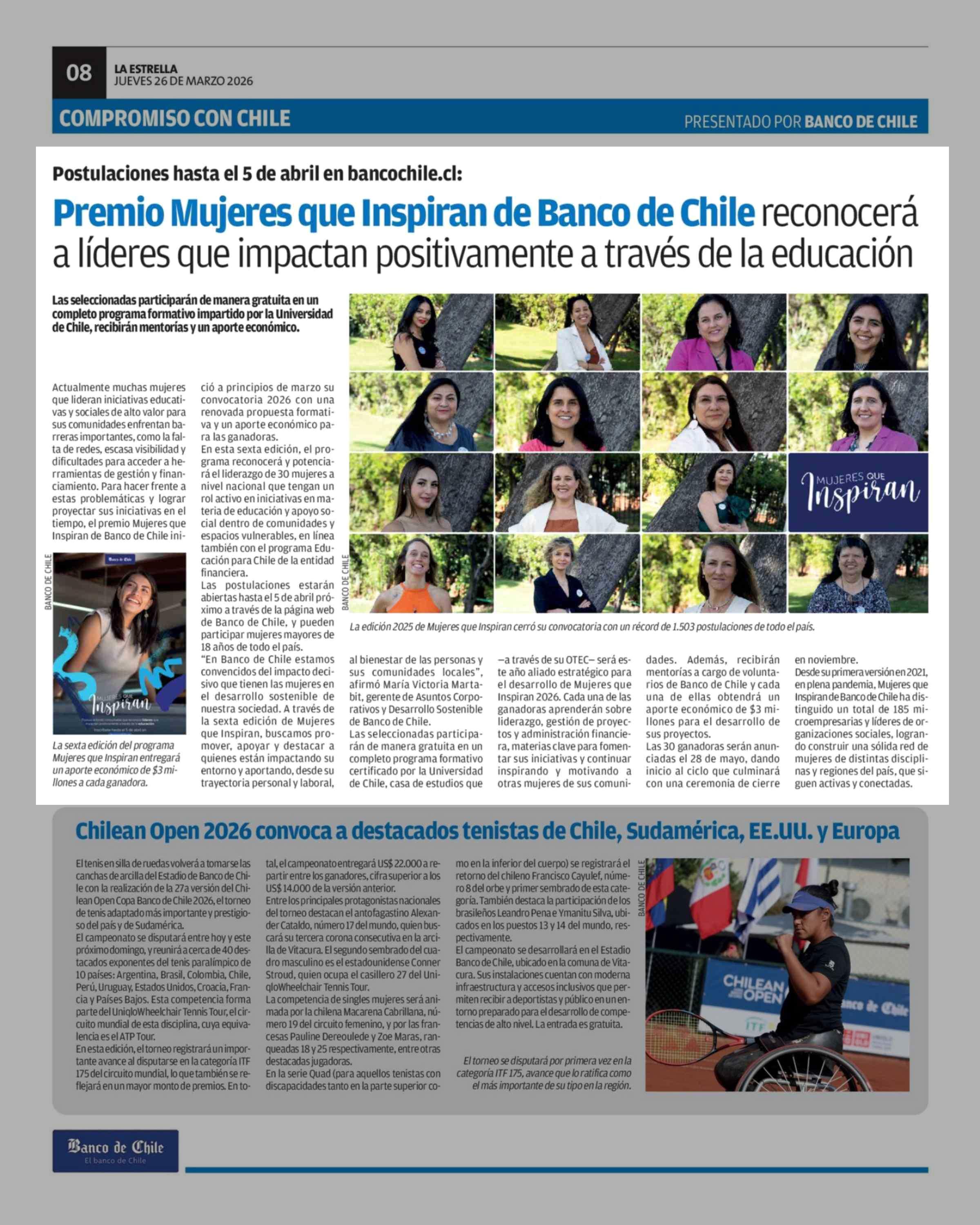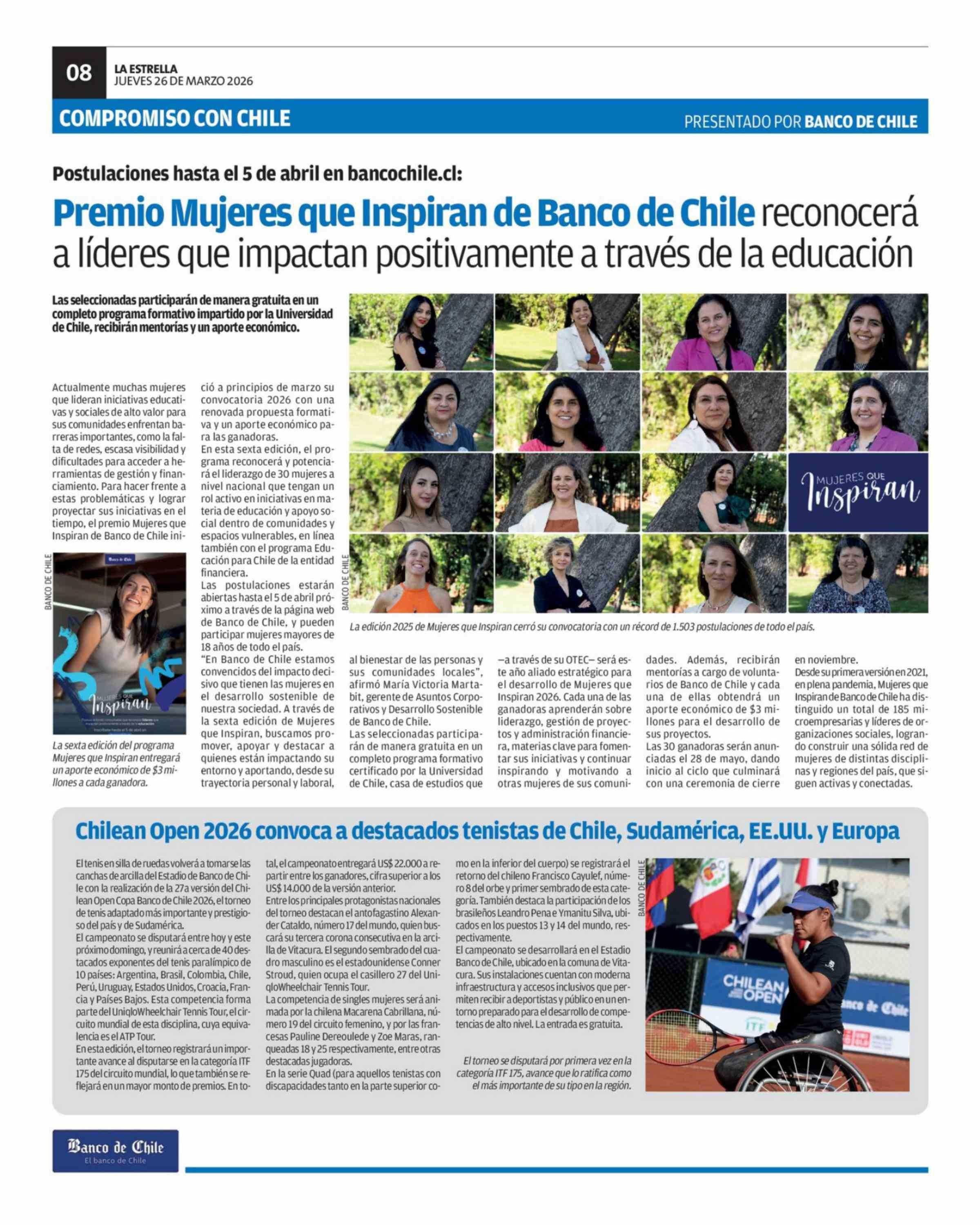 Premio Mujeres que Inspiran de Banco de Chile reconocerá a líderes que impactan positivamente a través de la educación 26-03-2026 La Estrella de Arica |