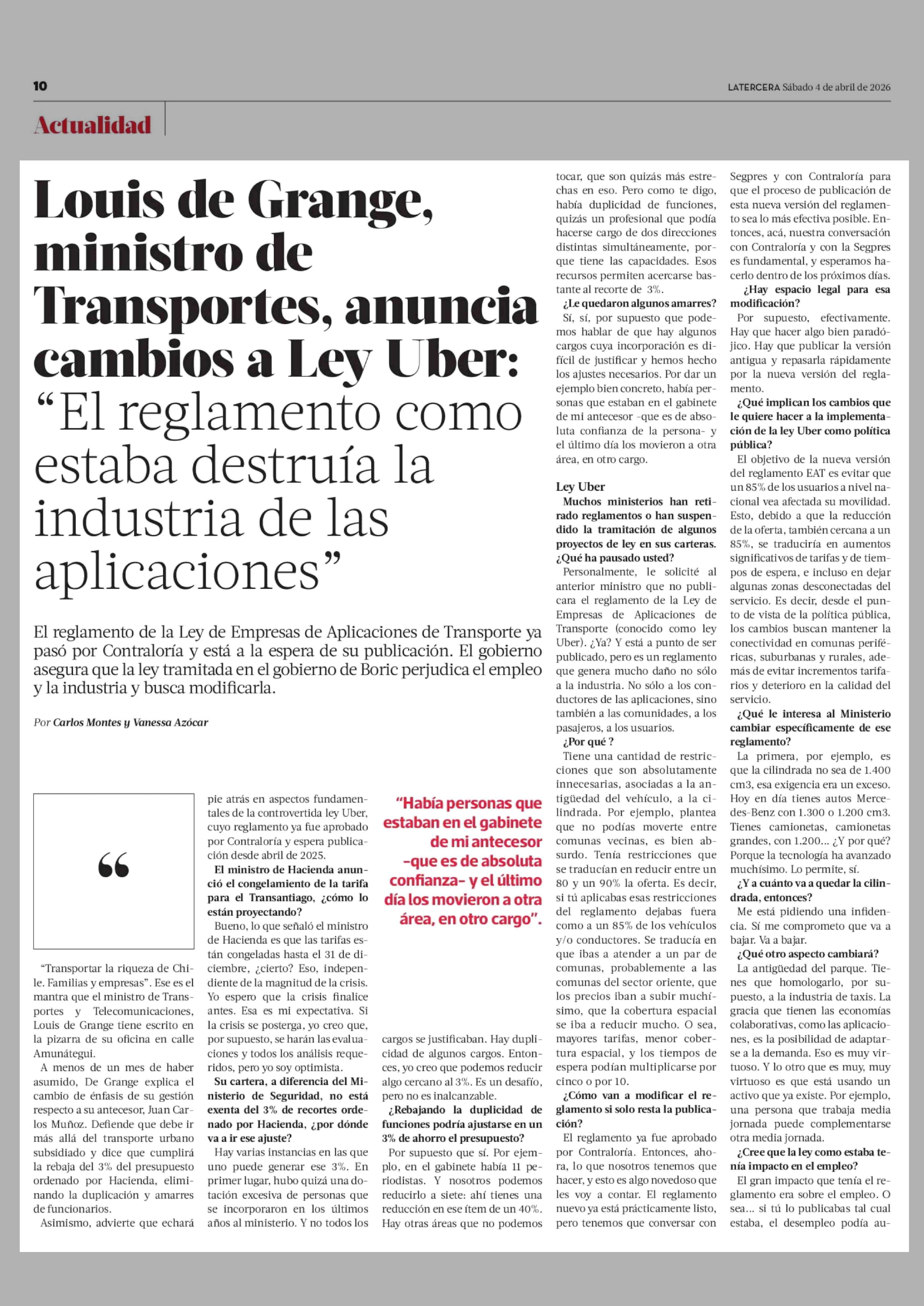 Título: Louis de Grange, ministro de Transportes, anuncia cambios a Ley Uber: "El reglamento como estaba destruía la industria de las aplicaciones"