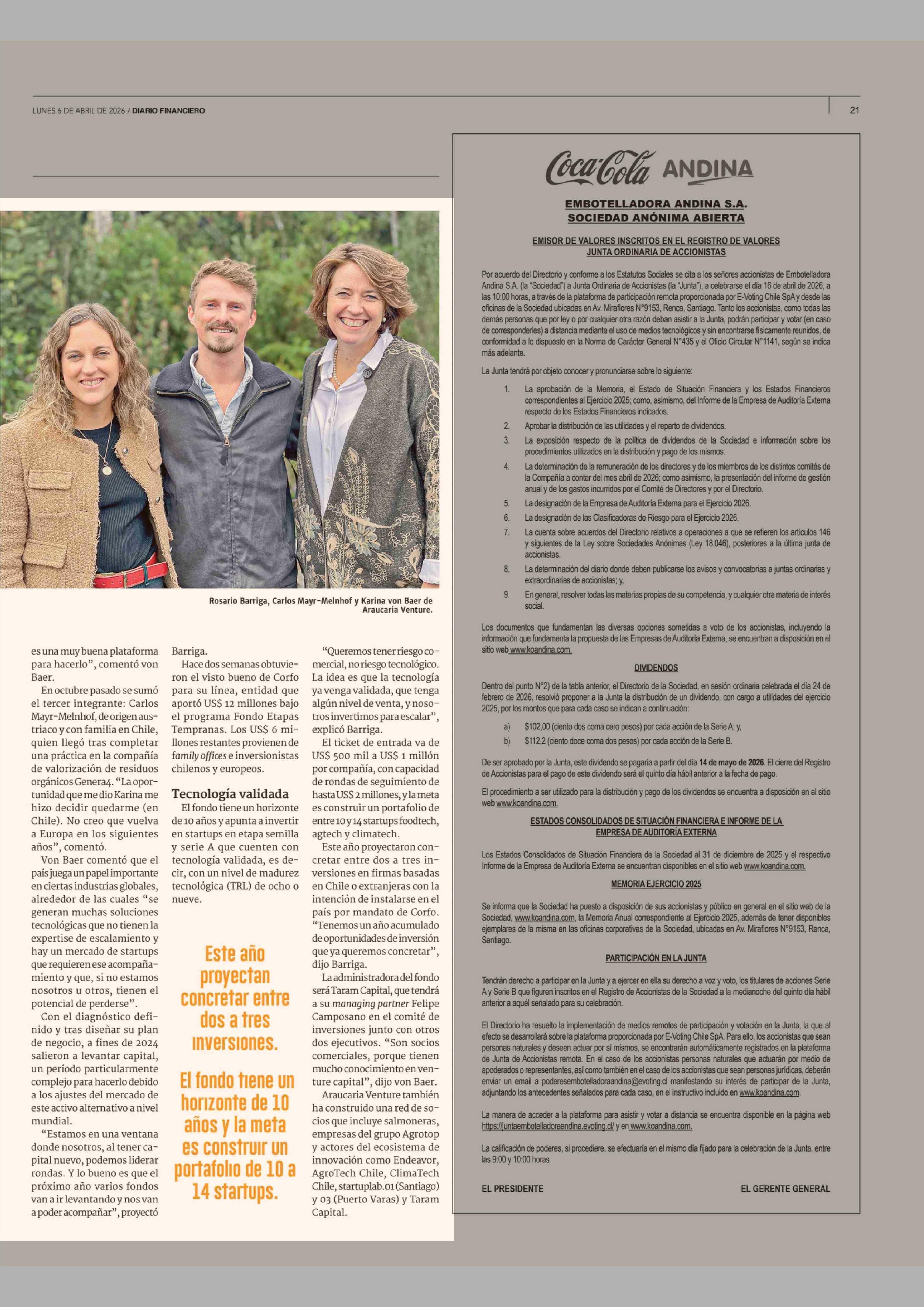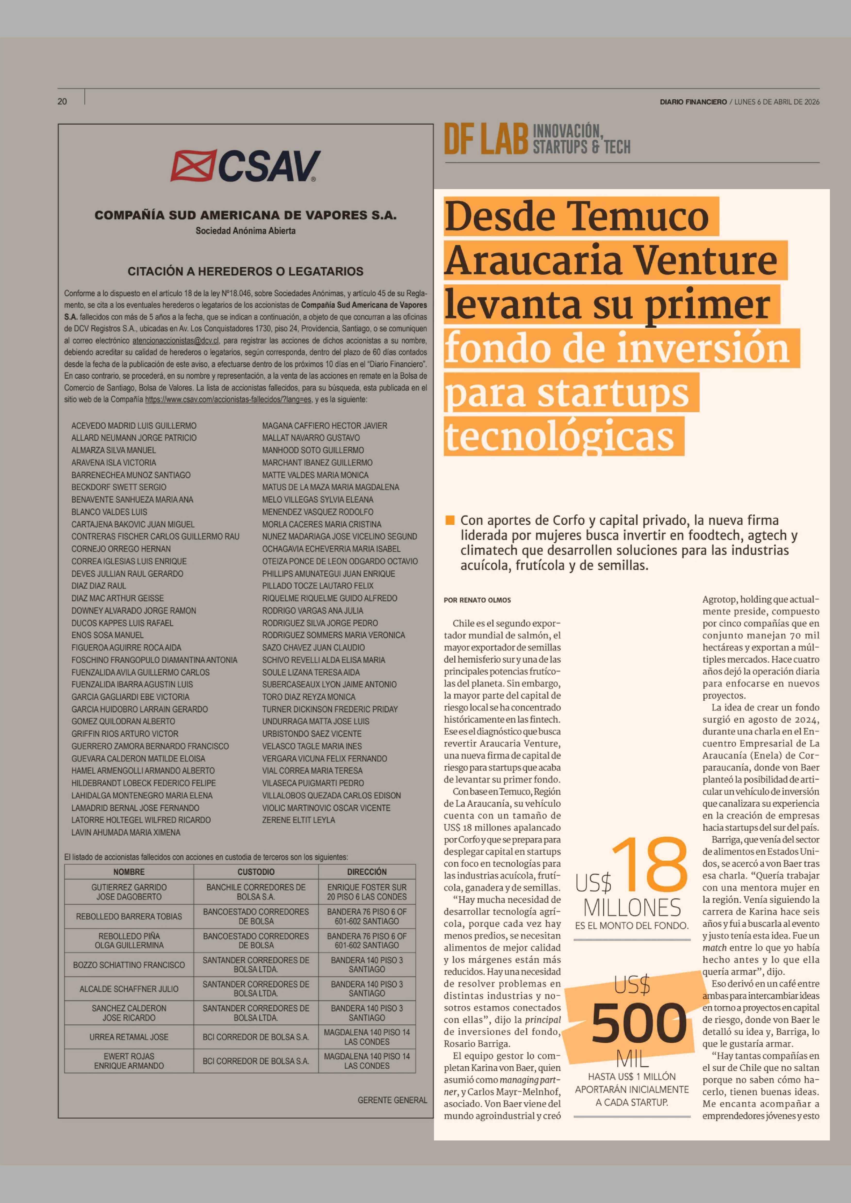 Desde Temuco Araucaria Venture levanta su primer fondo de inversión para startups tecnológicas 06-04-2026 Diario Financiero |