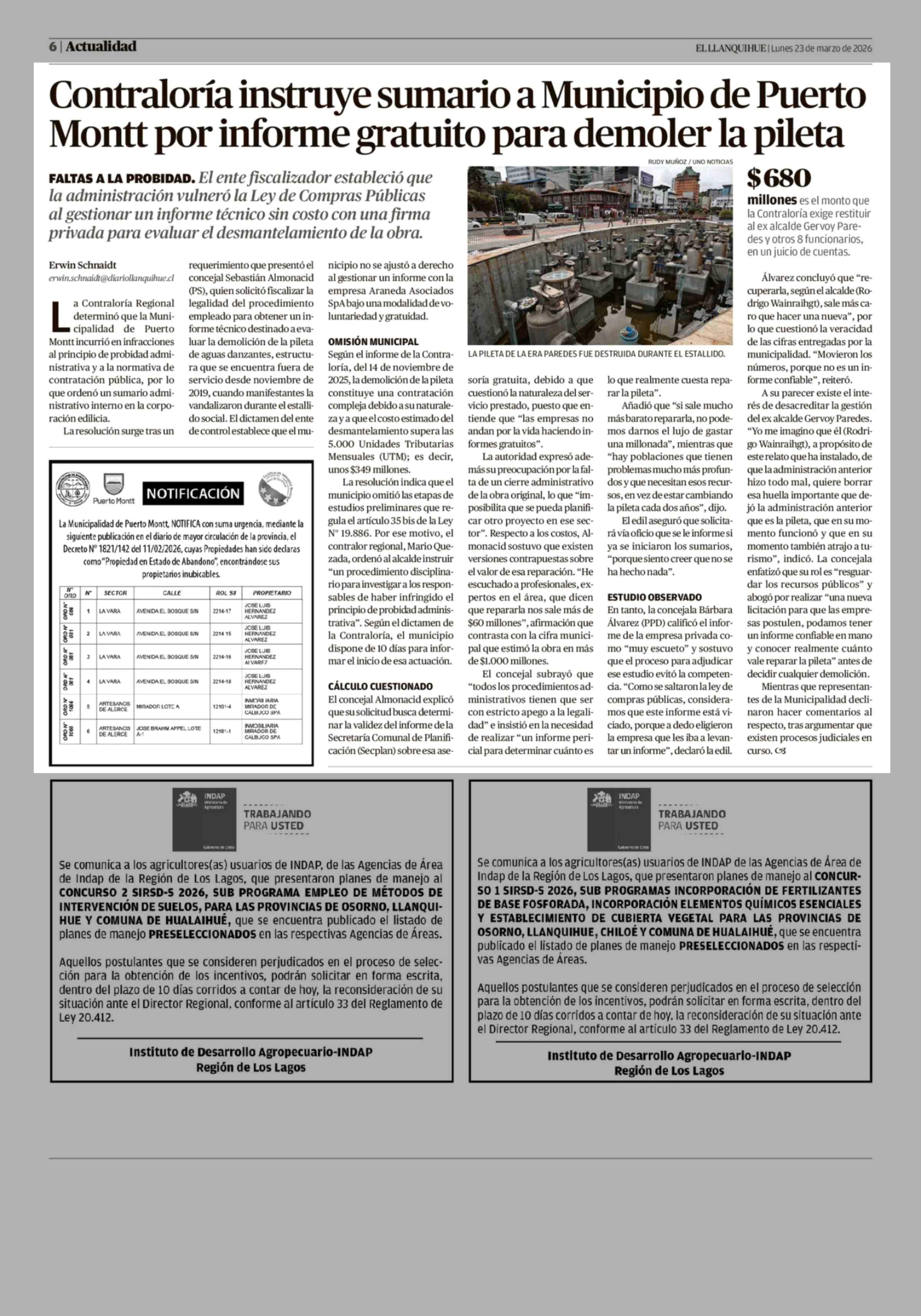 Contraloría instruye sumario a Municipio de Puerto Montt por informe gratuito para demoler la pileta 23-03-2026 El Llanquihue |
