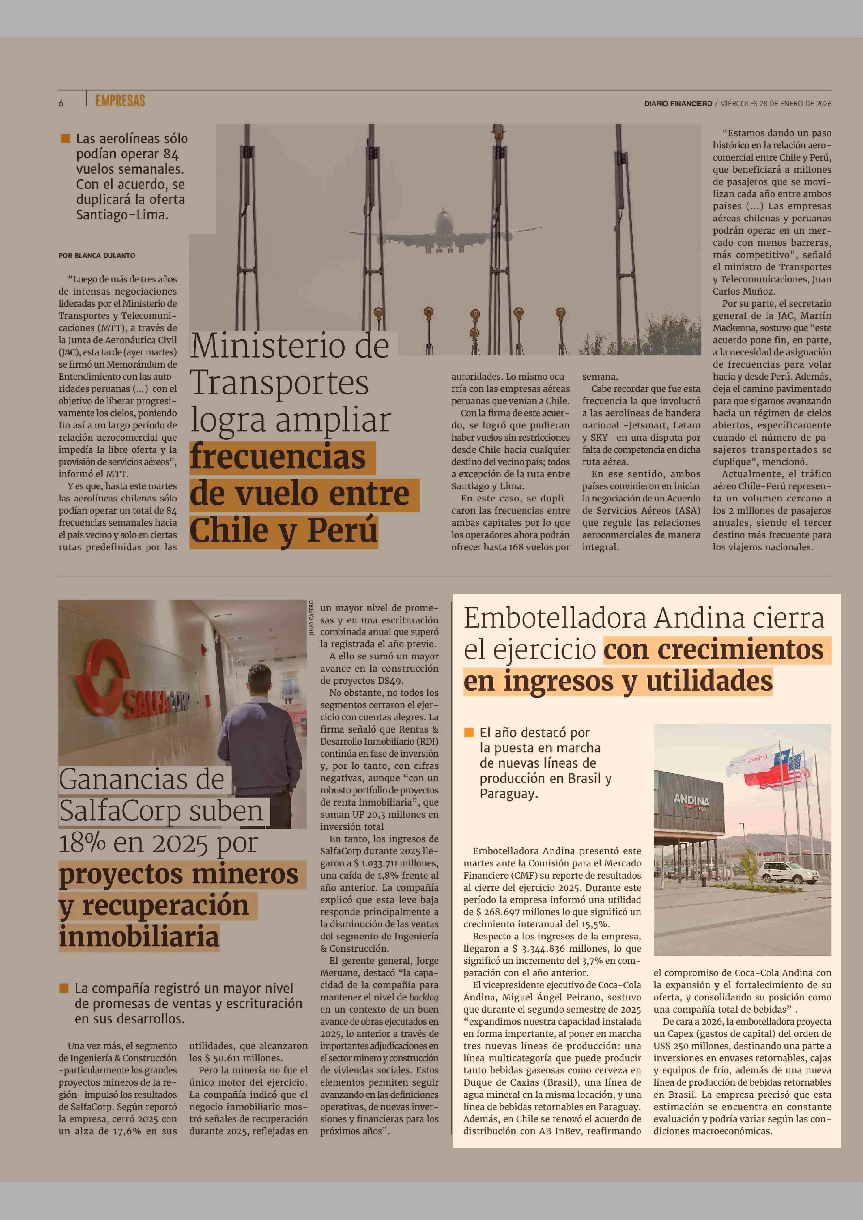 Título: Embotelladora Andina cierra el ejercicio con crecimientos en ingresos y utilidades